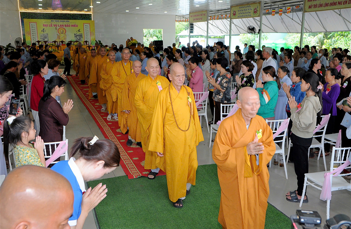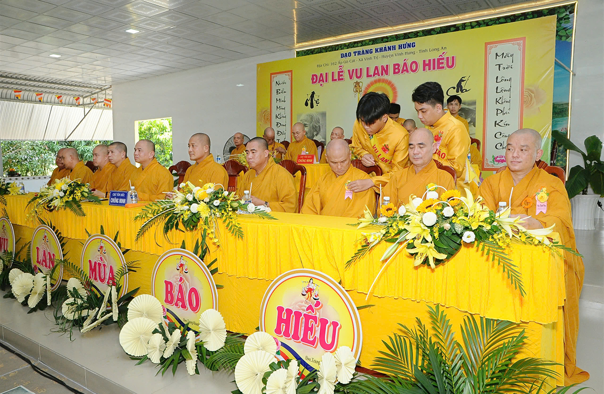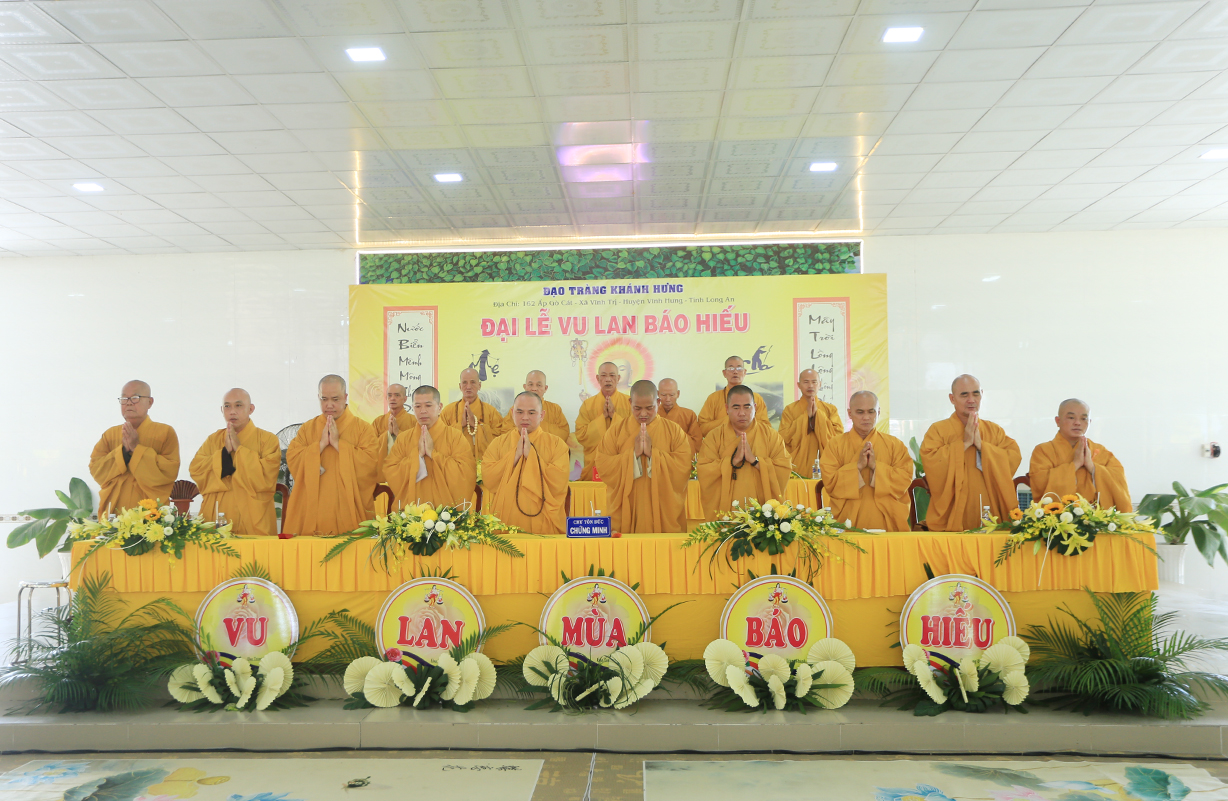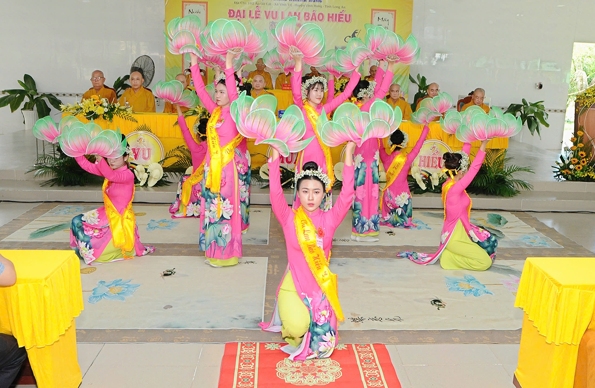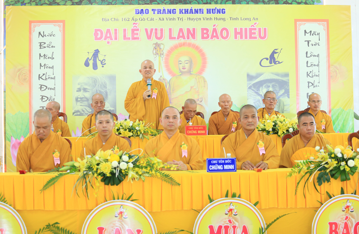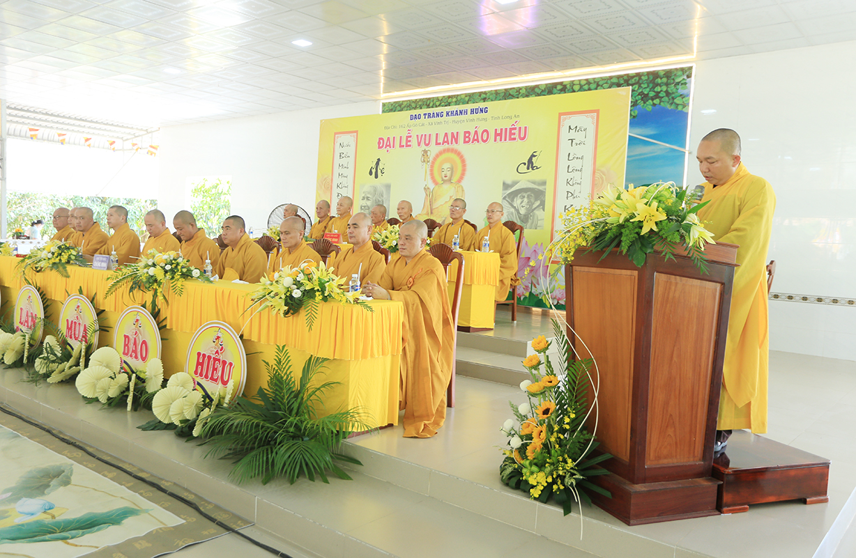 Đại chúng lắng lòng nghe lời Đạo từ về tinh thần hiếu đạo của Hòa thượng Thích Minh Thiện- Ủy viên HĐTSTƯ, Phó Ban Hoằng pháp trung ương, Trưởng Ban Trị sự GHPGVN tỉnh Long An). Trong lời đạo từ Hòa thượng nhấn mạnh, “Từ khi Phật giáo gia nhập vào Việt Nam, ngày Lễ Vu lan (ngày rằm tháng Bảy hằng năm) đã trở thành truyền thống văn hóa của người Việt Nam. Tinh thần báo hiếu, báo ân, phù hợp với tinh thần tín ngưỡng tôn thờ Tổ tiên thiêng liêng của người dân Việt. Qua quá trình du nhập và phát triển hơn hai ngàn năm tại Việt Nam, đến nay giá trị văn hóa này đã trở thành một đạo nghĩa của dân tộc Việt Nam; Trong đó, nghi thức “Bông hồng cài áo” mang một ý nghĩa rất đặc biệt. Ông cha ta luôn răn dạy không phúc nào lớn hơn phúc Hiếu kính, không tội nào nặng bằng tội bất kính với mẹ cha. Trong khi đó, Phật pháp cũng dạy cha mẹ trong nhà chính là Phật ở đời. Đạo thờ ông bà tổ tiên của người Việt đã gặp gỡ Phật giáo ở điểm này và người Việt đã lấy ngày rằm tháng 7 là dịp để mong cầu Đức Phật gia trì để tổ tiên được siêu thoát, cha mẹ, ông bà được bình an. Hòa thượng nhắc nhở đại chúng, trong lễ Vu Lan, mọi người cần nhớ tới 4 ơn cao cả. Đó là ơn Tam Bảo tế độ, ơn Quốc gia che chở mình, ơn thầy cô dạy bảo và ơn tất cả mọi người trong xã hội. Hòa thượng cũng nhắc về tấm gương đạo hiếu của ngài Mục Kiền Liên, là một trong 10 thánh đại đệ tử của Đức Phật. Qua đó, Hòa thượng sách tấn đại chúng hãy soi rọi cuộc sống của chính mình, dù có ở địa vị nào, lớn tuổi ra sao vẫn là những đứa con nhỏ trong mắt cha mẹ. Trong dịp Đại lễ Vu lan, mọi người nên làm những điều thánh thiện nhất. Con cái phải nhìn lại xem mình đã hiếu kính, phụng dưỡng cha mẹ thế nào. Ngược lại, mẹ cha cũng phải xem đã làm hết thiên chức của mình chưa. Bên cạnh đó, mọi người cũng phải san sẻ tình yêu thương tới mọi người. Vu Lan chỉ là tháng trọng tâm nhưng việc hiếu nghĩa cần phải thực hành cả đời này. Anh em hòa thuận, con cháu phụng dưỡng cha mẹ, ông bà. Vu Lan không chỉ là nghi lễ riêng của Phật giáo, ngày lễ lớn đối với những người con Phật mà còn đi vào truyền thống đạo đức, trở thành một nét văn hóa đẹp, thấm sâu trong tâm thức của hàng triệu triệu người Việt Nam hàng nghìn năm nay ./
