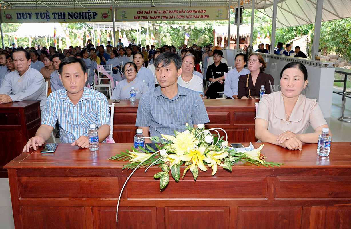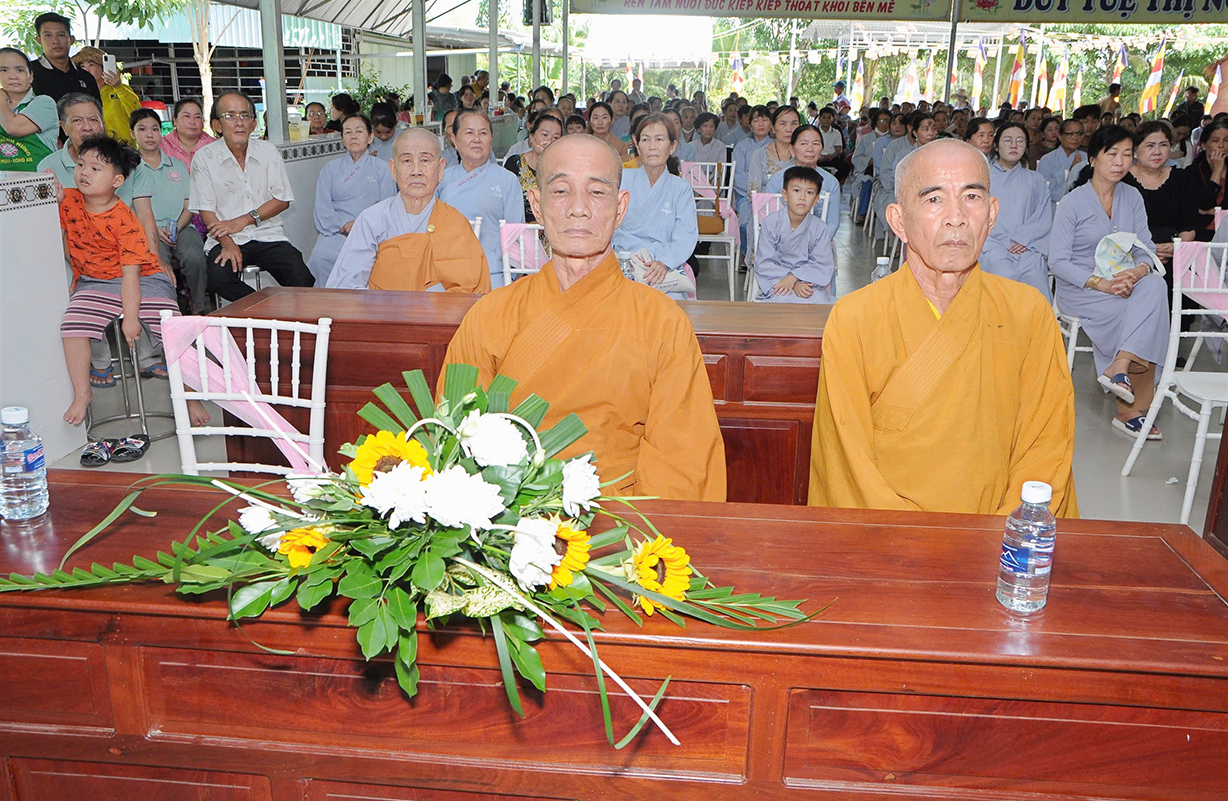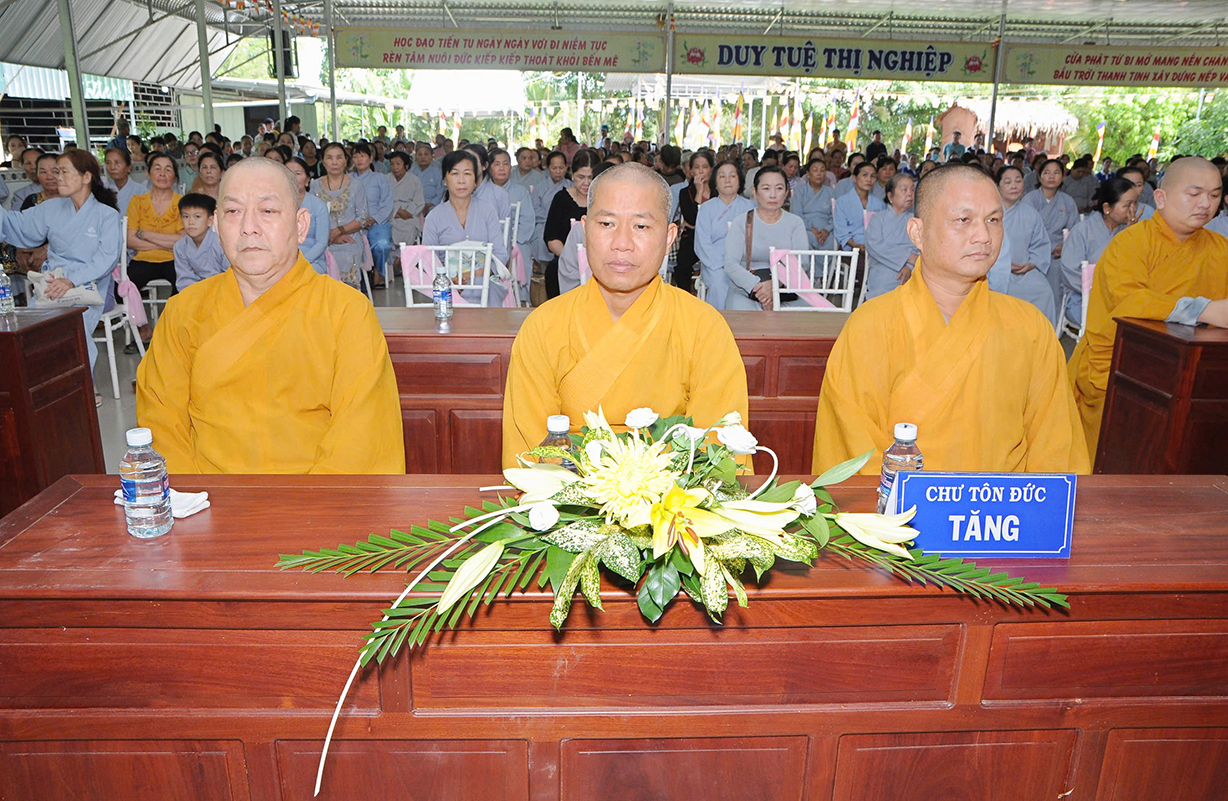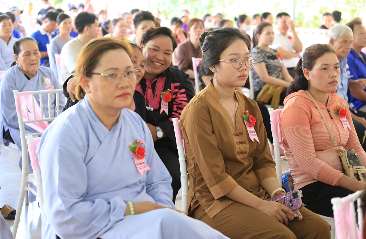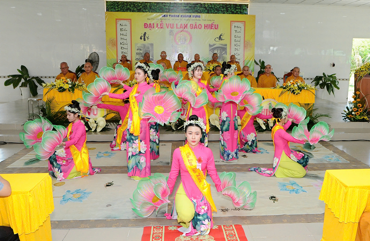 Đại chúng lắng lòng nghe lời Đạo từ về tinh thần hiếu đạo của Hòa thượng Thích Minh Thiện- Ủy viên HĐTSTƯ, Phó Ban Hoằng pháp trung ương, Trưởng Ban Trị sự GHPGVN tỉnh Long An). Trong lời đạo từ Hòa thượng nhấn mạnh, “Từ khi Phật giáo gia nhập vào Việt Nam, ngày Lễ Vu lan (ngày rằm tháng Bảy hằng năm) đã trở thành truyền thống văn hóa của người Việt Nam. Tinh thần báo hiếu, báo ân, phù hợp với tinh thần tín ngưỡng tôn thờ Tổ tiên thiêng liêng của người dân Việt. Qua quá trình du nhập và phát triển hơn hai ngàn năm tại Việt Nam, đến nay giá trị văn hóa này đã trở thành một đạo nghĩa của dân tộc Việt Nam; Trong đó, nghi thức “Bông hồng cài áo” mang một ý nghĩa rất đặc biệt. Ông cha ta luôn răn dạy không phúc nào lớn hơn phúc Hiếu kính, không tội nào nặng bằng tội bất kính với mẹ cha. Trong khi đó, Phật pháp cũng dạy cha mẹ trong nhà chính là Phật ở đời. Đạo thờ ông bà tổ tiên của người Việt đã gặp gỡ Phật giáo ở điểm này và người Việt đã lấy ngày rằm tháng 7 là dịp để mong cầu Đức Phật gia trì để tổ tiên được siêu thoát, cha mẹ, ông bà được bình an. Hòa thượng nhắc nhở đại chúng, trong lễ Vu Lan, mọi người cần nhớ tới 4 ơn cao cả. Đó là ơn Tam Bảo tế độ, ơn Quốc gia che chở mình, ơn thầy cô dạy bảo và ơn tất cả mọi người trong xã hội. Hòa thượng cũng nhắc về tấm gương đạo hiếu của ngài Mục Kiền Liên, là một trong 10 thánh đại đệ tử của Đức Phật. Qua đó, Hòa thượng sách tấn đại chúng hãy soi rọi cuộc sống của chính mình, dù có ở địa vị nào, lớn tuổi ra sao vẫn là những đứa con nhỏ trong mắt cha mẹ. Trong dịp Đại lễ Vu lan, mọi người nên làm những điều thánh thiện nhất. Con cái phải nhìn lại xem mình đã hiếu kính, phụng dưỡng cha mẹ thế nào. Ngược lại, mẹ cha cũng phải xem đã làm hết thiên chức của mình chưa. Bên cạnh đó, mọi người cũng phải san sẻ tình yêu thương tới mọi người. Vu Lan chỉ là tháng trọng tâm nhưng việc hiếu nghĩa cần phải thực hành cả đời này. Anh em hòa thuận, con cháu phụng dưỡng cha mẹ, ông bà. Vu Lan không chỉ là nghi lễ riêng của Phật giáo, ngày lễ lớn đối với những người con Phật mà còn đi vào truyền thống đạo đức, trở thành một nét văn hóa đẹp, thấm sâu trong tâm thức của hàng triệu triệu người Việt Nam hàng nghìn năm nay ./