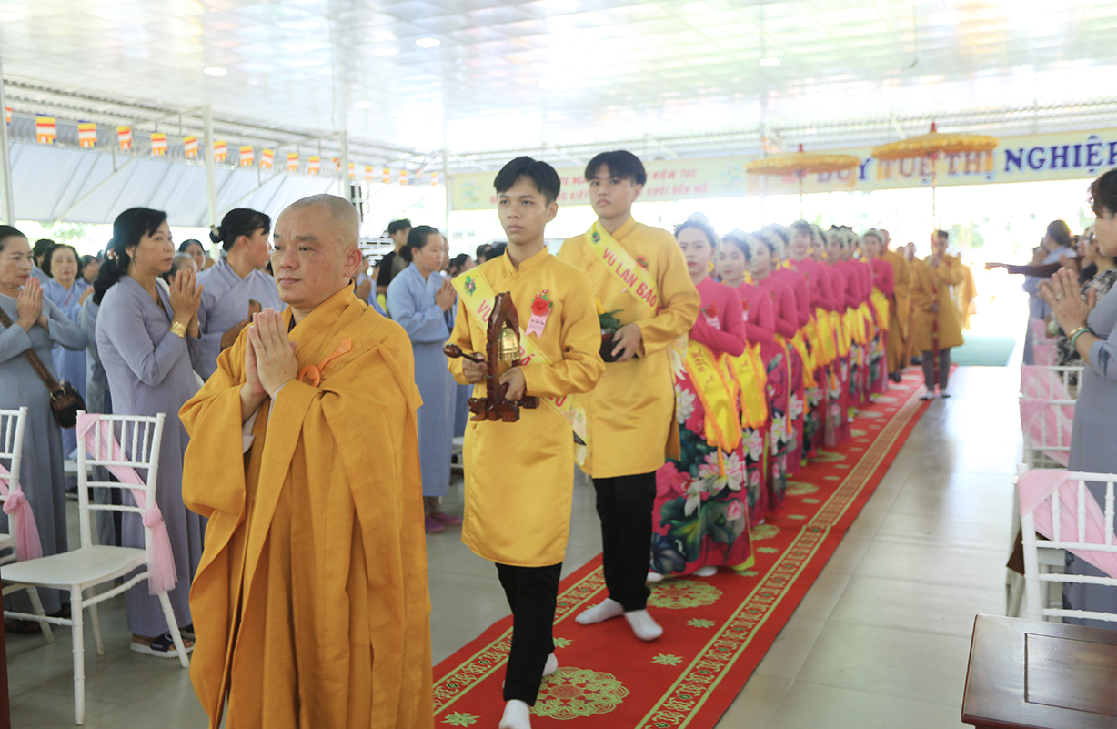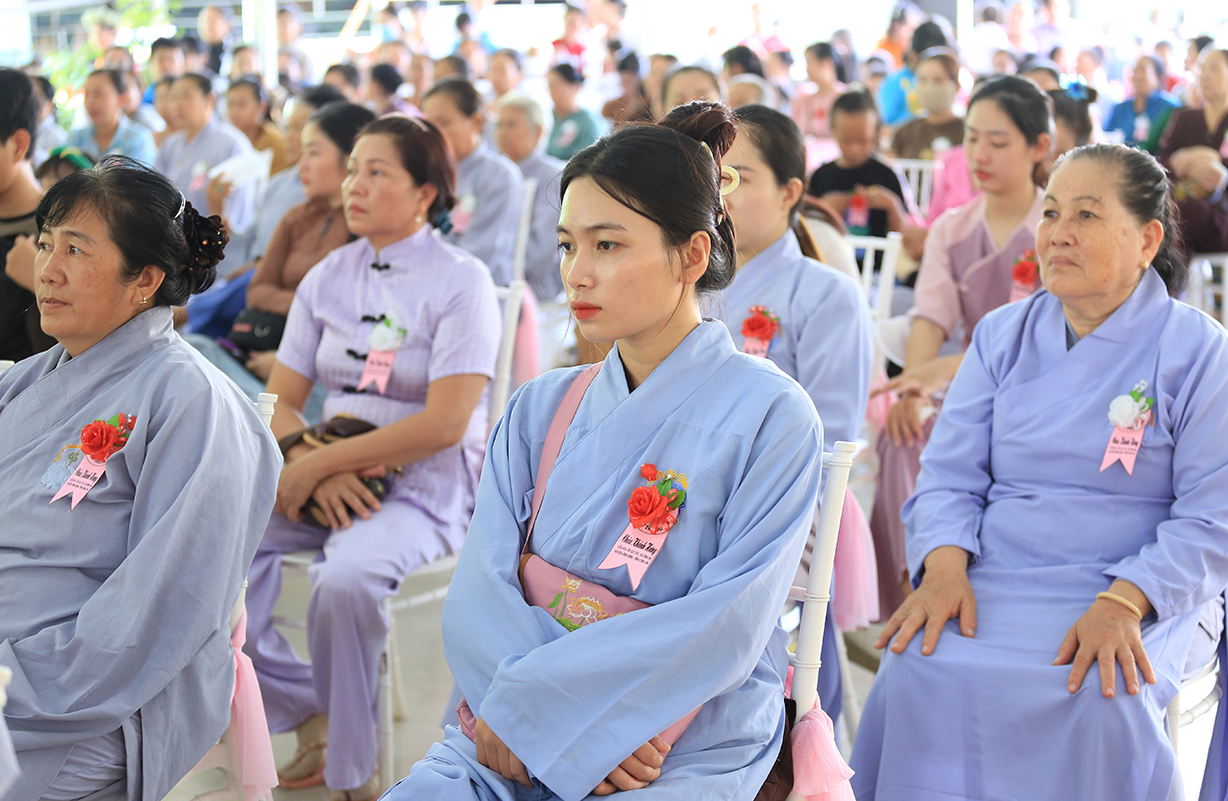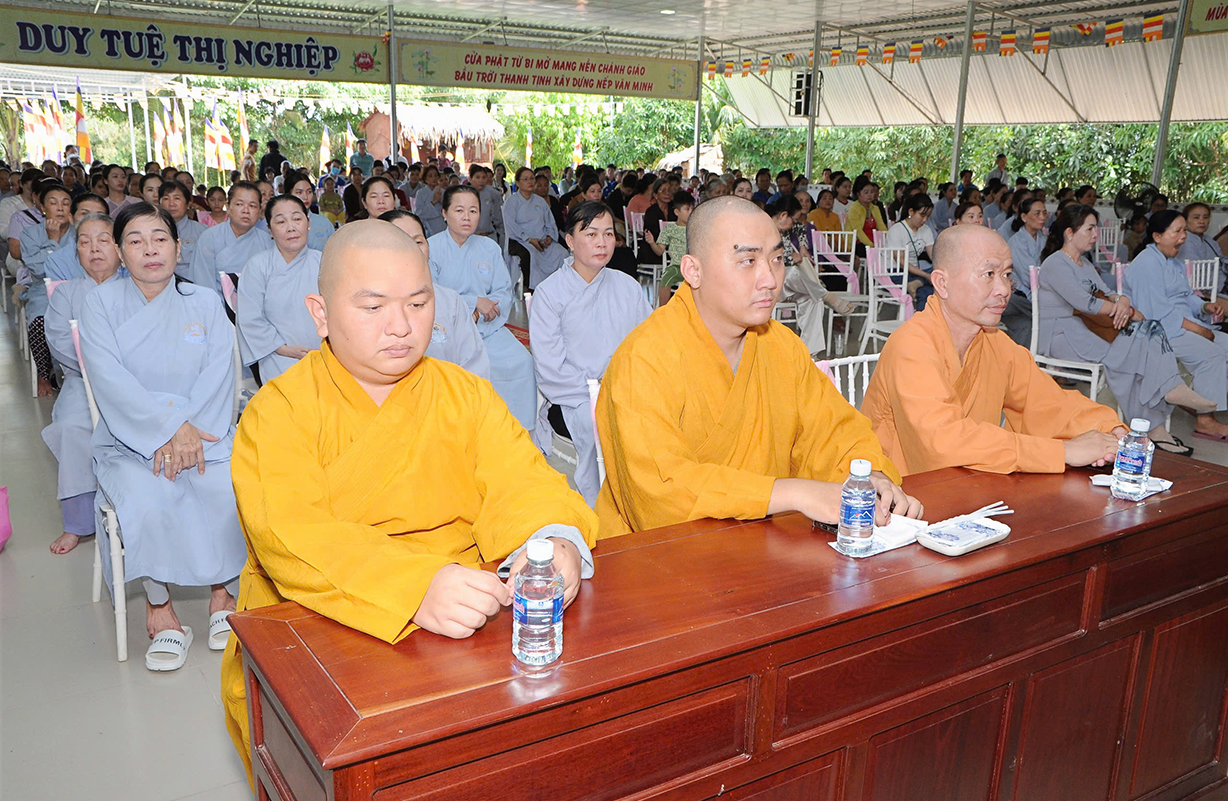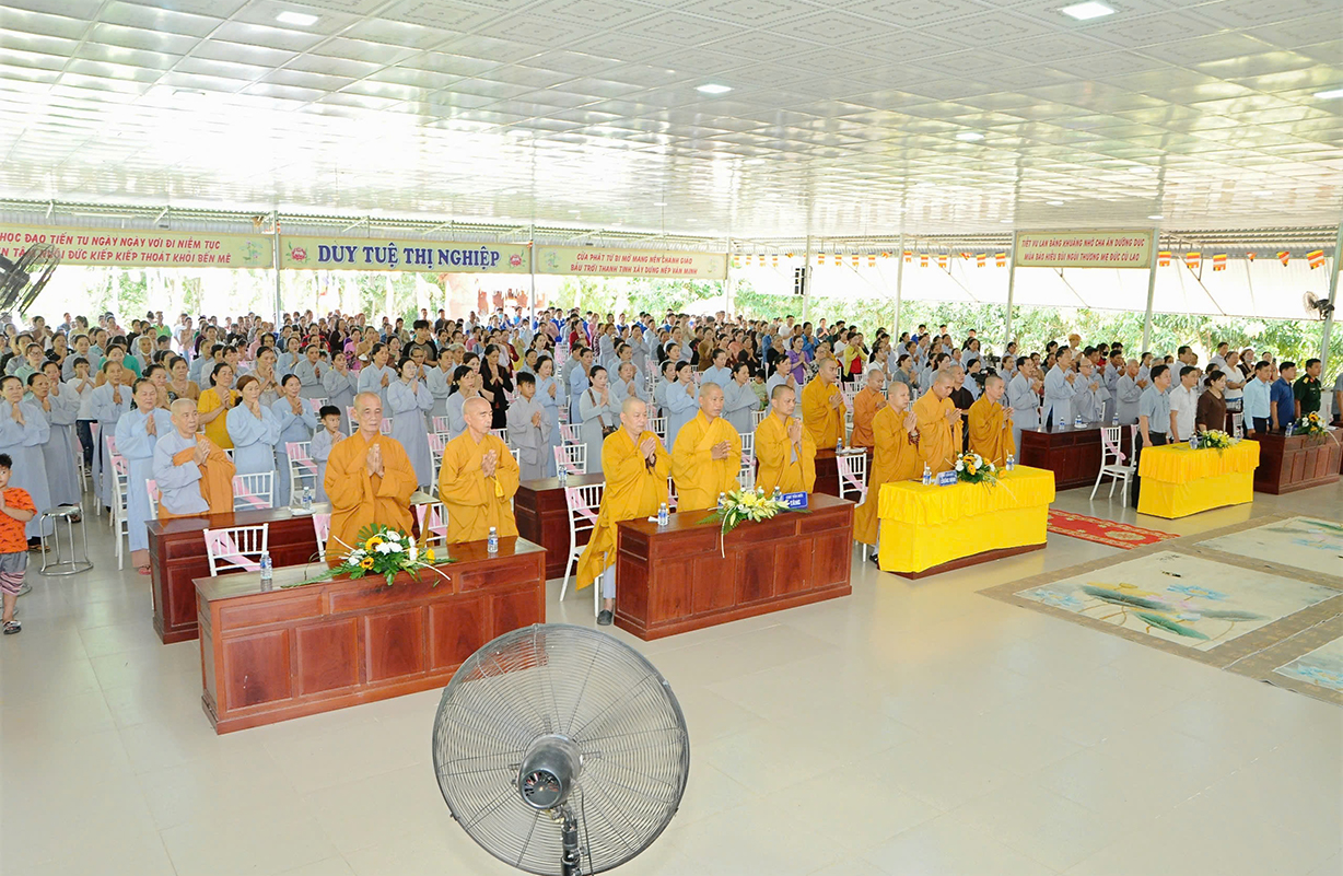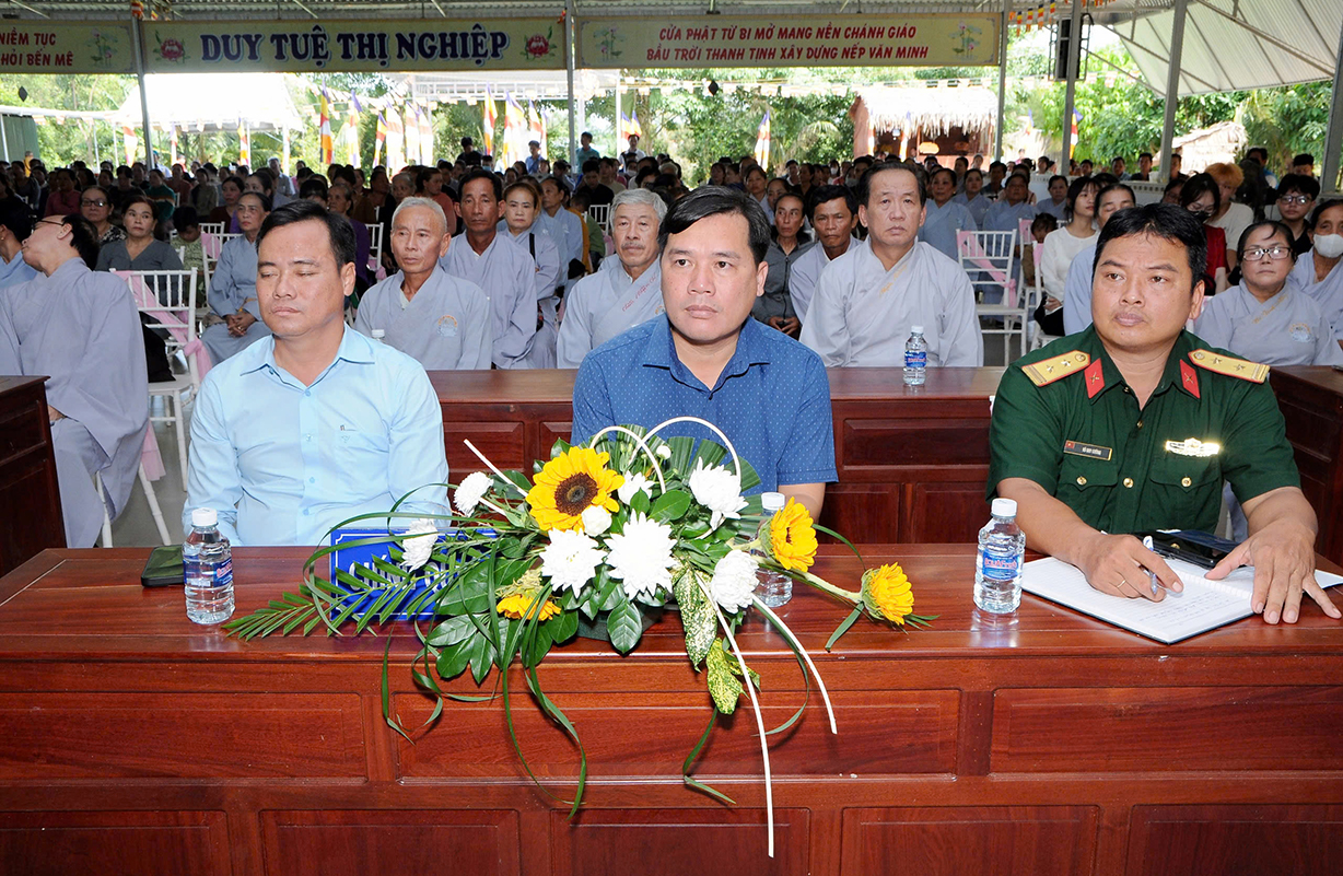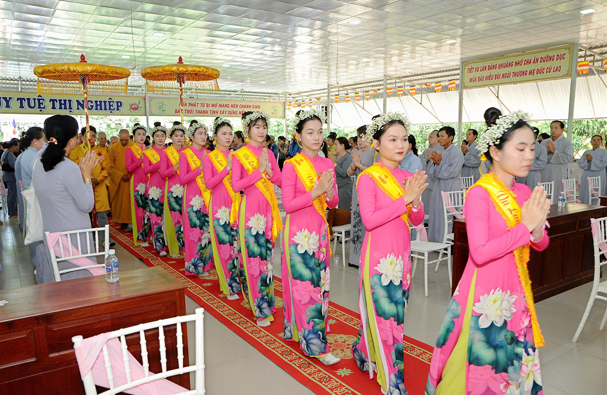 Đại chúng lắng lòng nghe lời Đạo từ về tinh thần hiếu đạo của Hòa thượng Thích Minh Thiện- Ủy viên HĐTSTƯ, Phó Ban Hoằng pháp trung ương, Trưởng Ban Trị sự GHPGVN tỉnh Long An). Trong lời đạo từ Hòa thượng nhấn mạnh, “Từ khi Phật giáo gia nhập vào Việt Nam, ngày Lễ Vu lan (ngày rằm tháng Bảy hằng năm) đã trở thành truyền thống văn hóa của người Việt Nam. Tinh thần báo hiếu, báo ân, phù hợp với tinh thần tín ngưỡng tôn thờ Tổ tiên thiêng liêng của người dân Việt. Qua quá trình du nhập và phát triển hơn hai ngàn năm tại Việt Nam, đến nay giá trị văn hóa này đã trở thành một đạo nghĩa của dân tộc Việt Nam; Trong đó, nghi thức “Bông hồng cài áo” mang một ý nghĩa rất đặc biệt. Ông cha ta luôn răn dạy không phúc nào lớn hơn phúc Hiếu kính, không tội nào nặng bằng tội bất kính với mẹ cha. Trong khi đó, Phật pháp cũng dạy cha mẹ trong nhà chính là Phật ở đời. Đạo thờ ông bà tổ tiên của người Việt đã gặp gỡ Phật giáo ở điểm này và người Việt đã lấy ngày rằm tháng 7 là dịp để mong cầu Đức Phật gia trì để tổ tiên được siêu thoát, cha mẹ, ông bà được bình an. Hòa thượng nhắc nhở đại chúng, trong lễ Vu Lan, mọi người cần nhớ tới 4 ơn cao cả. Đó là ơn Tam Bảo tế độ, ơn Quốc gia che chở mình, ơn thầy cô dạy bảo và ơn tất cả mọi người trong xã hội. Hòa thượng cũng nhắc về tấm gương đạo hiếu của ngài Mục Kiền Liên, là một trong 10 thánh đại đệ tử của Đức Phật. Qua đó, Hòa thượng sách tấn đại chúng hãy soi rọi cuộc sống của chính mình, dù có ở địa vị nào, lớn tuổi ra sao vẫn là những đứa con nhỏ trong mắt cha mẹ. Trong dịp Đại lễ Vu lan, mọi người nên làm những điều thánh thiện nhất. Con cái phải nhìn lại xem mình đã hiếu kính, phụng dưỡng cha mẹ thế nào. Ngược lại, mẹ cha cũng phải xem đã làm hết thiên chức của mình chưa. Bên cạnh đó, mọi người cũng phải san sẻ tình yêu thương tới mọi người. Vu Lan chỉ là tháng trọng tâm nhưng việc hiếu nghĩa cần phải thực hành cả đời này. Anh em hòa thuận, con cháu phụng dưỡng cha mẹ, ông bà. Vu Lan không chỉ là nghi lễ riêng của Phật giáo, ngày lễ lớn đối với những người con Phật mà còn đi vào truyền thống đạo đức, trở thành một nét văn hóa đẹp, thấm sâu trong tâm thức của hàng triệu triệu người Việt Nam hàng nghìn năm nay ./