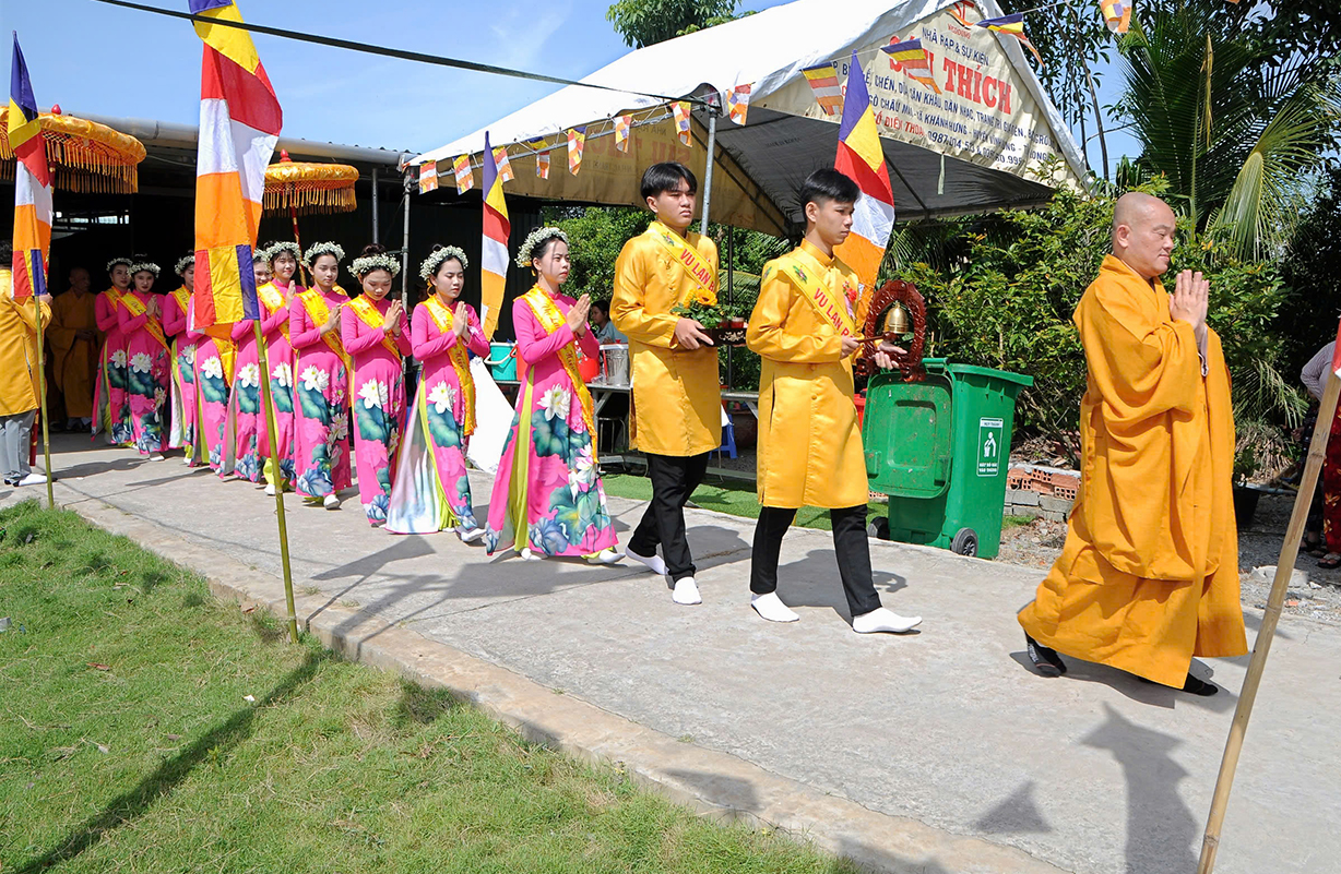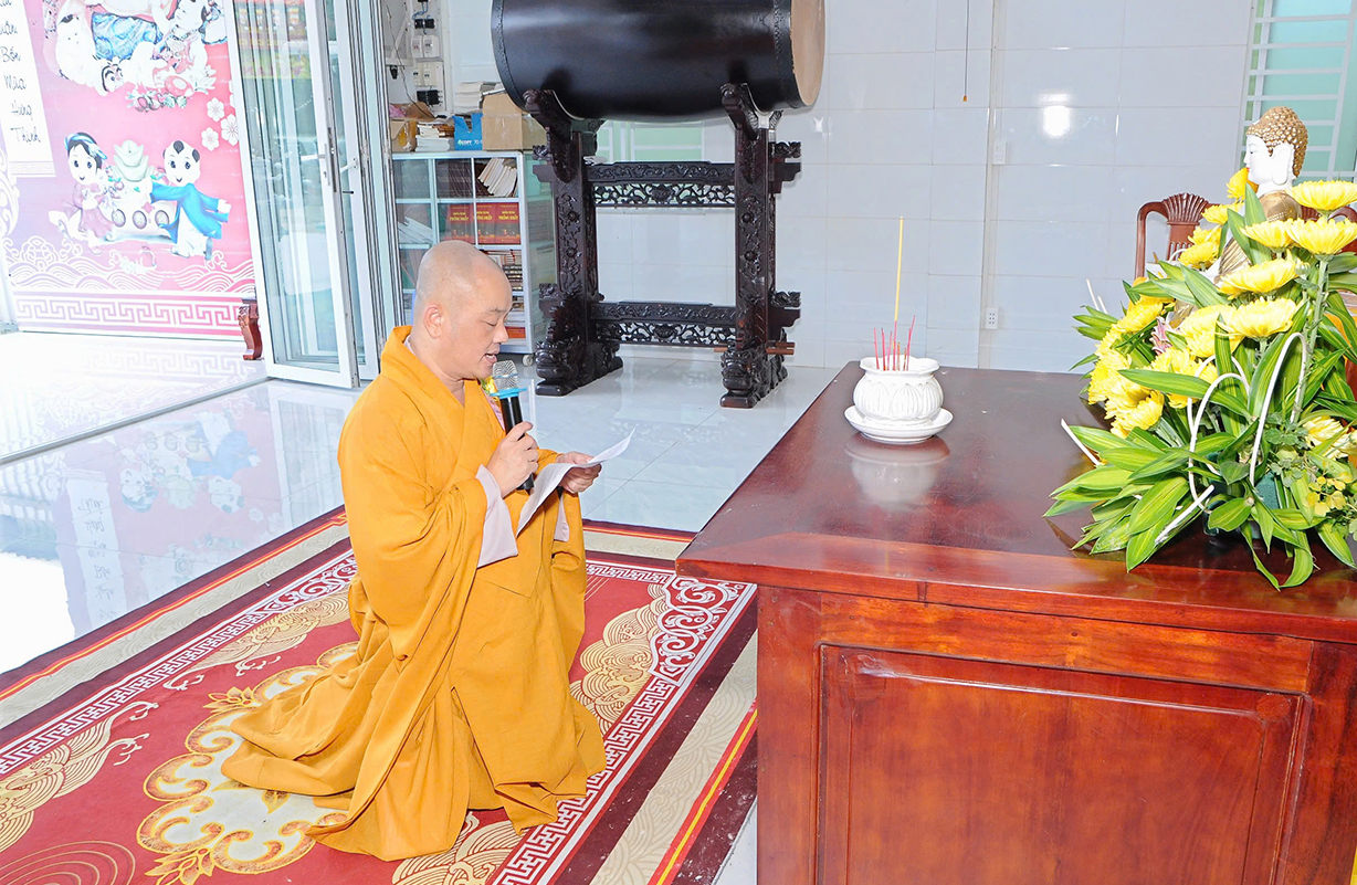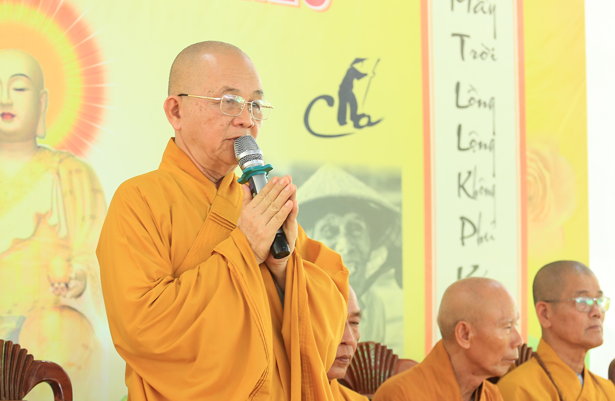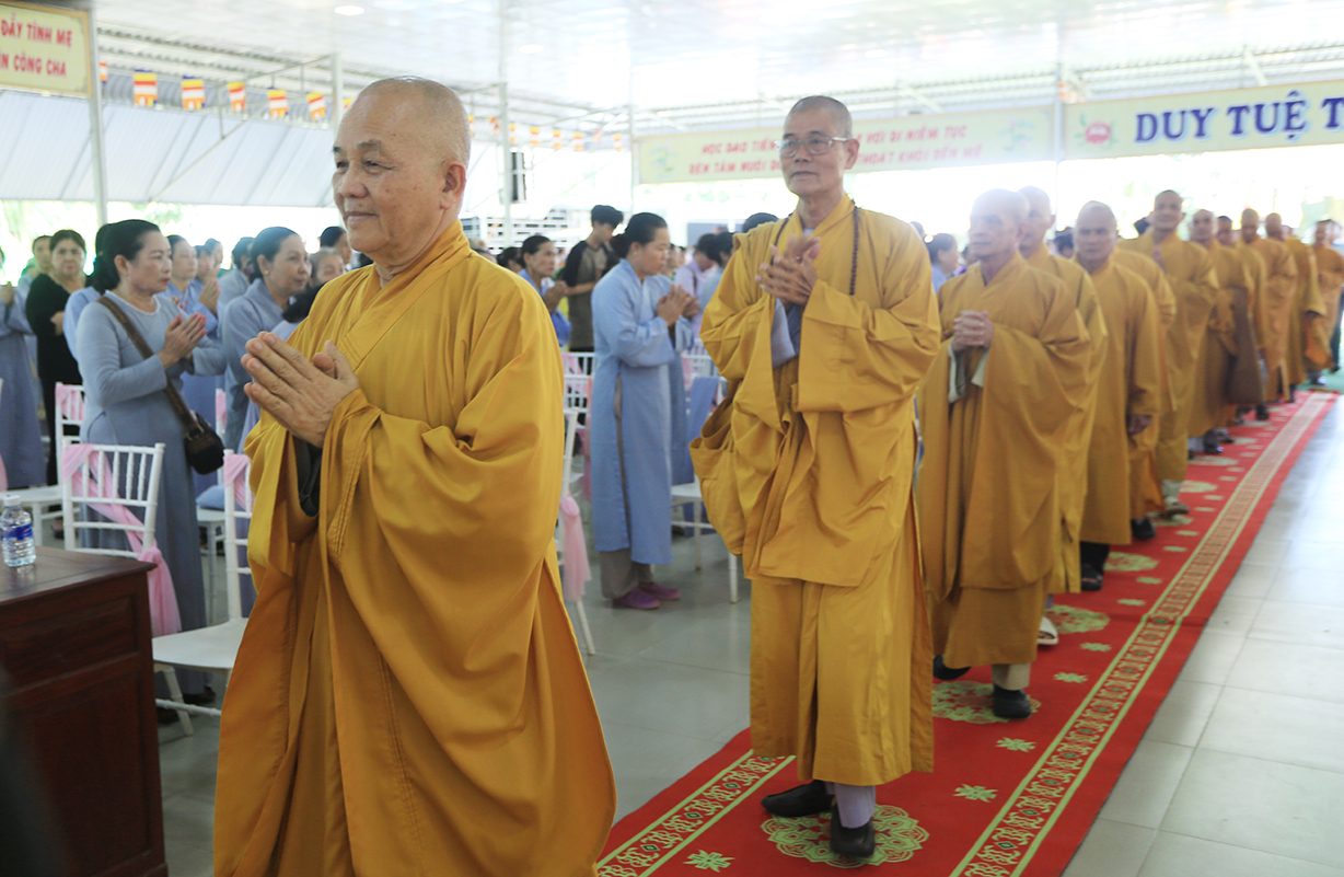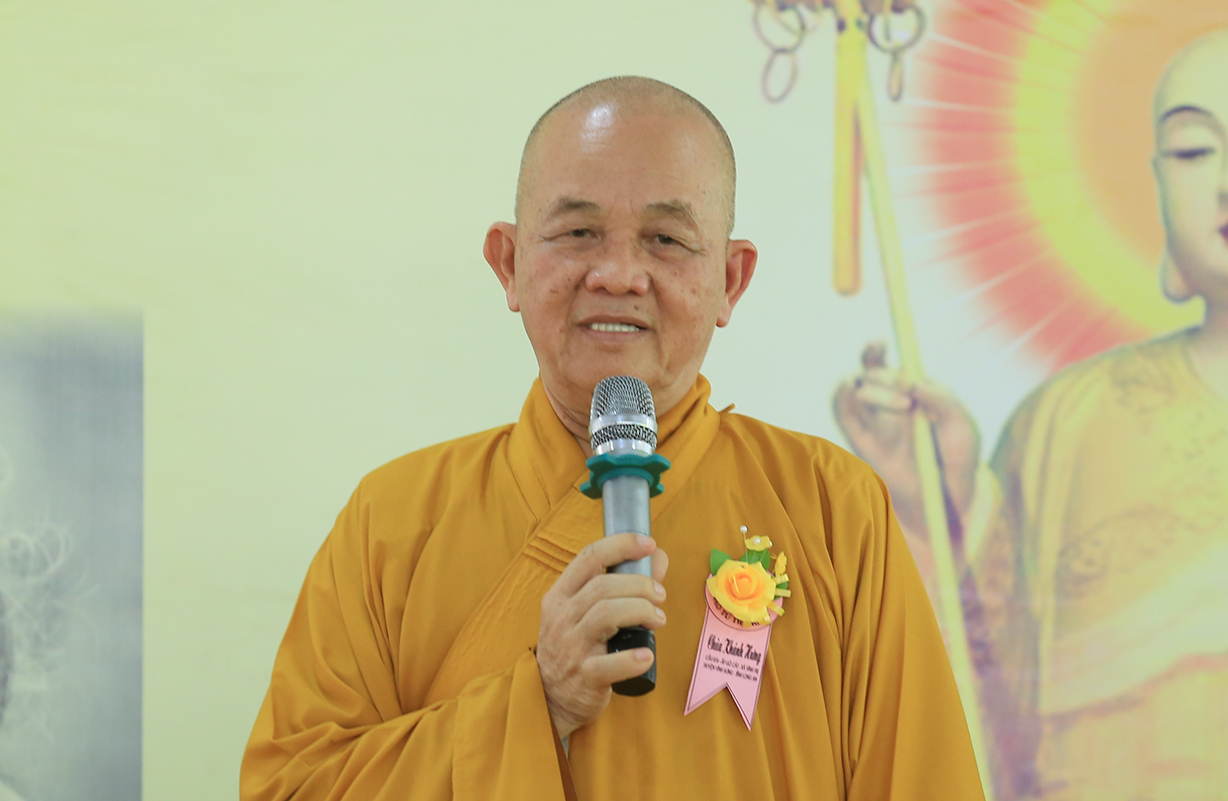 Đại chúng lắng lòng nghe lời Đạo từ về tinh thần hiếu đạo của Hòa thượng Thích Minh Thiện- Ủy viên HĐTSTƯ, Phó Ban Hoằng pháp trung ương, Trưởng Ban Trị sự GHPGVN tỉnh Long An). Trong lời đạo từ Hòa thượng nhấn mạnh, “Từ khi Phật giáo gia nhập vào Việt Nam, ngày Lễ Vu lan (ngày rằm tháng Bảy hằng năm) đã trở thành truyền thống văn hóa của người Việt Nam. Tinh thần báo hiếu, báo ân, phù hợp với tinh thần tín ngưỡng tôn thờ Tổ tiên thiêng liêng của người dân Việt. Qua quá trình du nhập và phát triển hơn hai ngàn năm tại Việt Nam, đến nay giá trị văn hóa này đã trở thành một đạo nghĩa của dân tộc Việt Nam; Trong đó, nghi thức “Bông hồng cài áo” mang một ý nghĩa rất đặc biệt. Ông cha ta luôn răn dạy không phúc nào lớn hơn phúc Hiếu kính, không tội nào nặng bằng tội bất kính với mẹ cha. Trong khi đó, Phật pháp cũng dạy cha mẹ trong nhà chính là Phật ở đời. Đạo thờ ông bà tổ tiên của người Việt đã gặp gỡ Phật giáo ở điểm này và người Việt đã lấy ngày rằm tháng 7 là dịp để mong cầu Đức Phật gia trì để tổ tiên được siêu thoát, cha mẹ, ông bà được bình an. Hòa thượng nhắc nhở đại chúng, trong lễ Vu Lan, mọi người cần nhớ tới 4 ơn cao cả. Đó là ơn Tam Bảo tế độ, ơn Quốc gia che chở mình, ơn thầy cô dạy bảo và ơn tất cả mọi người trong xã hội. Hòa thượng cũng nhắc về tấm gương đạo hiếu của ngài Mục Kiền Liên, là một trong 10 thánh đại đệ tử của Đức Phật. Qua đó, Hòa thượng sách tấn đại chúng hãy soi rọi cuộc sống của chính mình, dù có ở địa vị nào, lớn tuổi ra sao vẫn là những đứa con nhỏ trong mắt cha mẹ. Trong dịp Đại lễ Vu lan, mọi người nên làm những điều thánh thiện nhất. Con cái phải nhìn lại xem mình đã hiếu kính, phụng dưỡng cha mẹ thế nào. Ngược lại, mẹ cha cũng phải xem đã làm hết thiên chức của mình chưa. Bên cạnh đó, mọi người cũng phải san sẻ tình yêu thương tới mọi người. Vu Lan chỉ là tháng trọng tâm nhưng việc hiếu nghĩa cần phải thực hành cả đời này. Anh em hòa thuận, con cháu phụng dưỡng cha mẹ, ông bà. Vu Lan không chỉ là nghi lễ riêng của Phật giáo, ngày lễ lớn đối với những người con Phật mà còn đi vào truyền thống đạo đức, trở thành một nét văn hóa đẹp, thấm sâu trong tâm thức của hàng triệu triệu người Việt Nam hàng nghìn năm nay ./