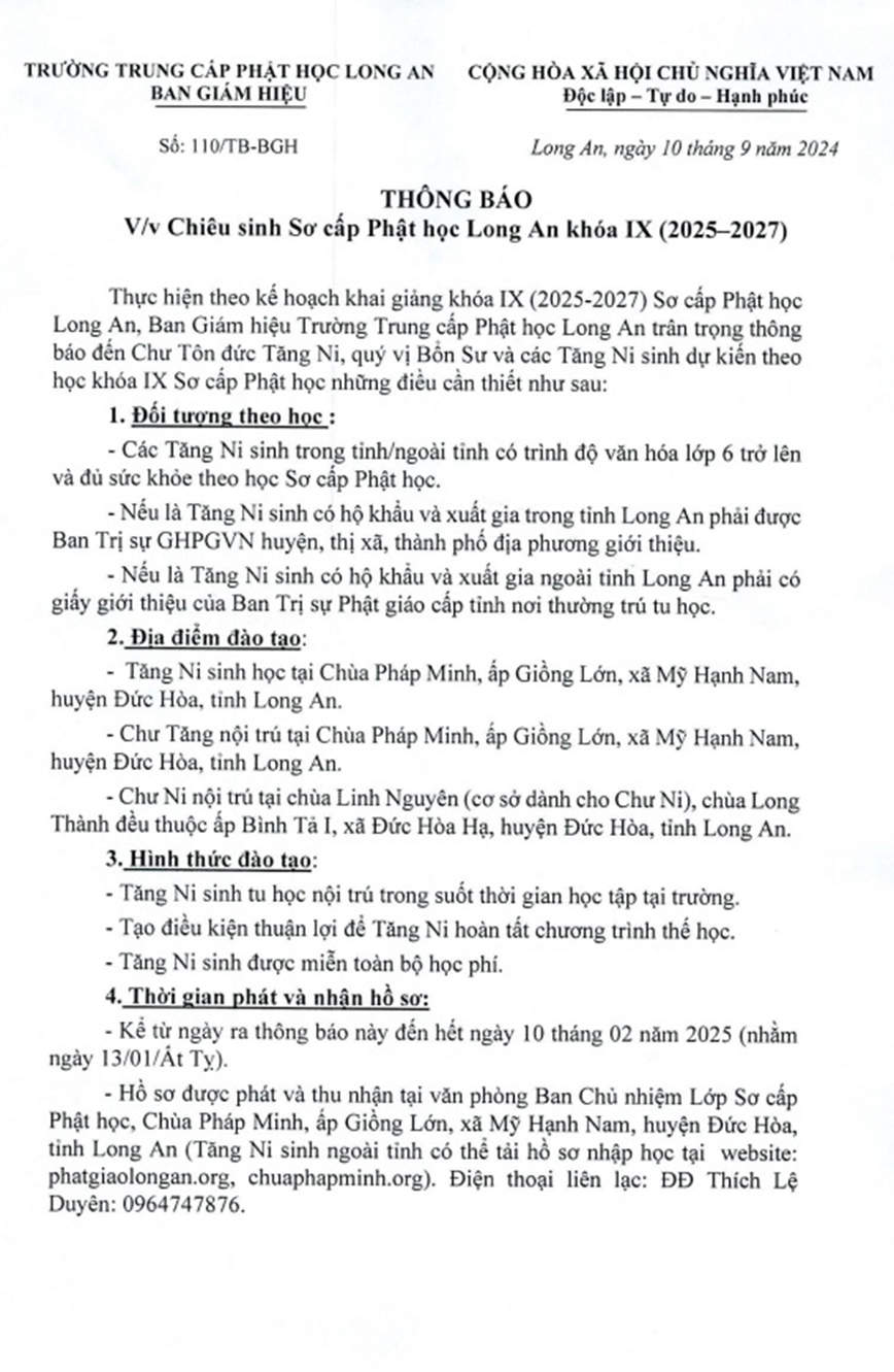 Vì sự nghiệp giáo dục và đào tạo thế hệ Tăng Ni kế thừa, Ban Giám hiệu Trường Trung cấp Phật học Long An kính mong được Chư Tôn Đức Tăng Ni, quý vị Bổn Sư và các Tăng Ni sinh nhiệt tình hưởng ứng, ủng hộ tinh thần thông báo này.