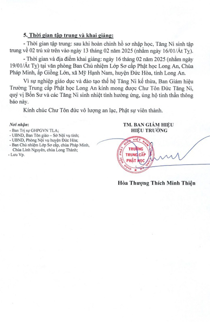 – Thời gian tập trung: sau khi hoàn chỉnh hồ sơ nhập học, Tăng Ni sinh tập trung về 02 trú xứ trên vào ngày 13 tháng 02 năm 2025 (nhằm ngày 16/01/Ất Tỵ).