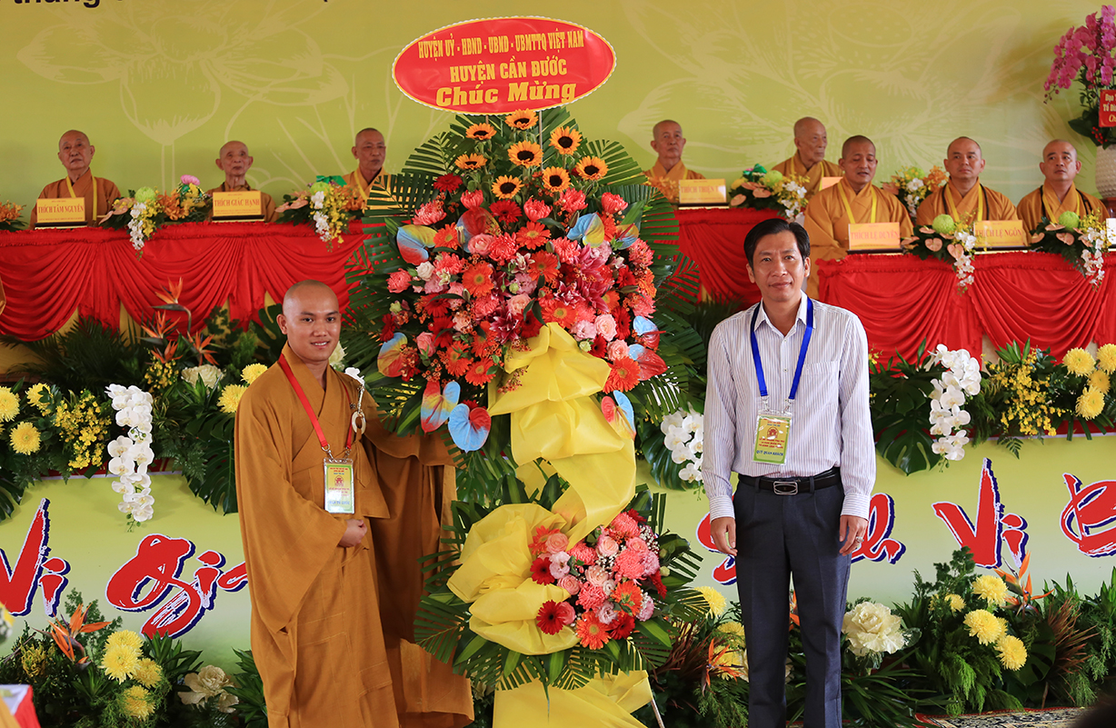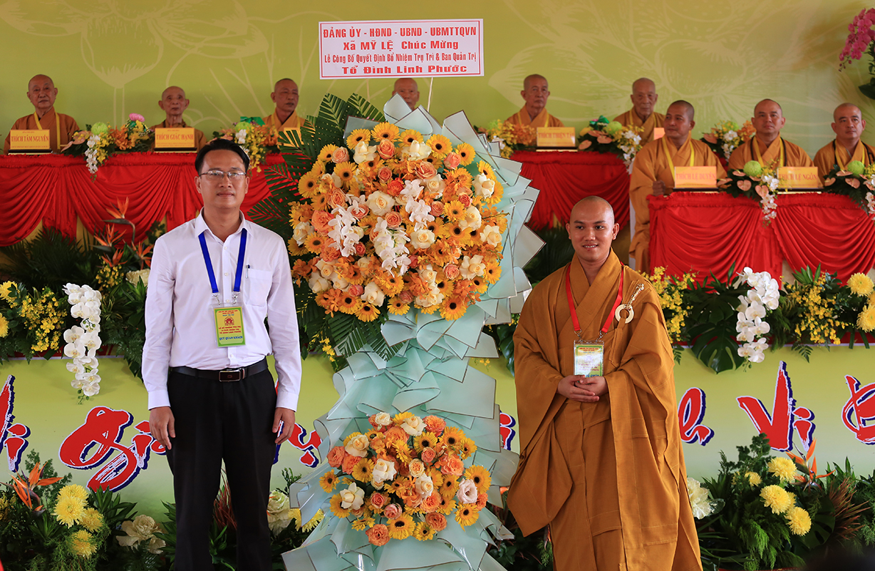 Ông Nguyễn Minh Vương – Phó Chư tịch UBND huyện Cần Đước, thay mặt lãnh đạo huyện Cần Đước có lời phát biểu tại buổi lễ. Buổi lễ này là sự kiện trọng đại của Phật giáo, Ông chúc mừng BTS GHPGVN, huyện Cần Đước và Đại đức Tân trụ trì. Ông nêu ra một số thành tựu của huyện nhà trong thời gian qua và kêu gọi Chư Ni và Phật tử Tổ Đình Linh Phước cùng chung tay góp sức xây dựng quê hương Cần Đước ngày một giàu đẹp.