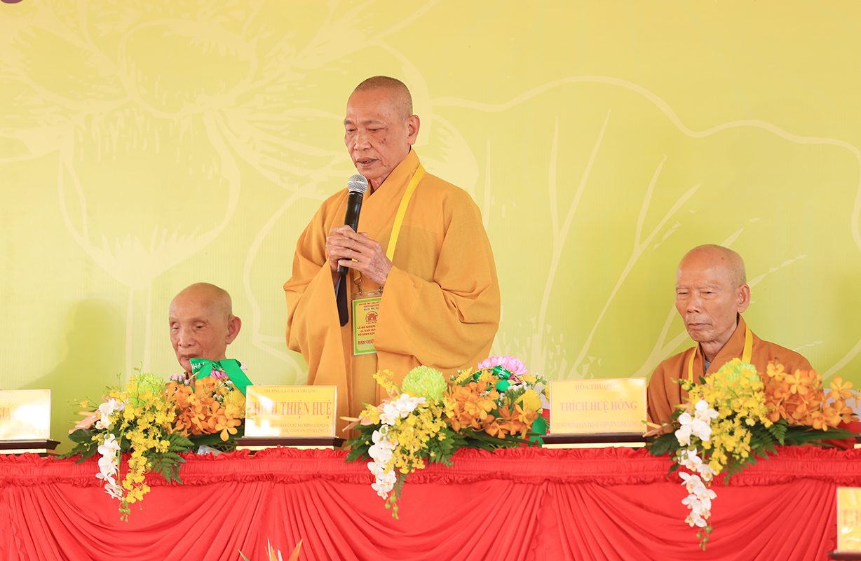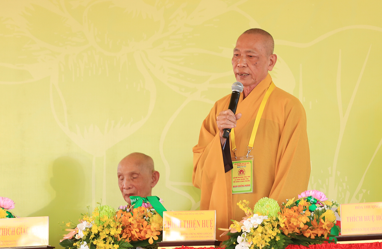 Đạo từ tại buổi lễ, Hòa thượng Thích Thiện Huệ gửi lời vấn an sức khỏe đến chư tôn đức, các cấp lãnh đạo chính quyền, quý Phật tử trở về tham dự buổi lễ. Hòa thượng còn gửi lời chúc buổi lễ thành công tốt đẹp đối với việc Bổ nhiệm trụ trì Tổ đình Linh Phước, Hòa thượng Thích Thiện Huệ chúc mừng Phật giáo huyện nhà, đặc biệt là tri ân các cấp chính quyền đã tạo điều kiện tích cực cho sự thành tựu ngày hôm nay. Đối với Ban Quản Trị Tổ đình Linh Phước cần đem giáo lý đức Phật giáo hóa chúng sanh, giúp họ chuyển hóa nổi khổ niềm đau, đó chính là nhiệm vụ thiêng liêng của người con Phật – “Hoằng pháp vi gia vụ, Lợi sanh vi bản hoài”.