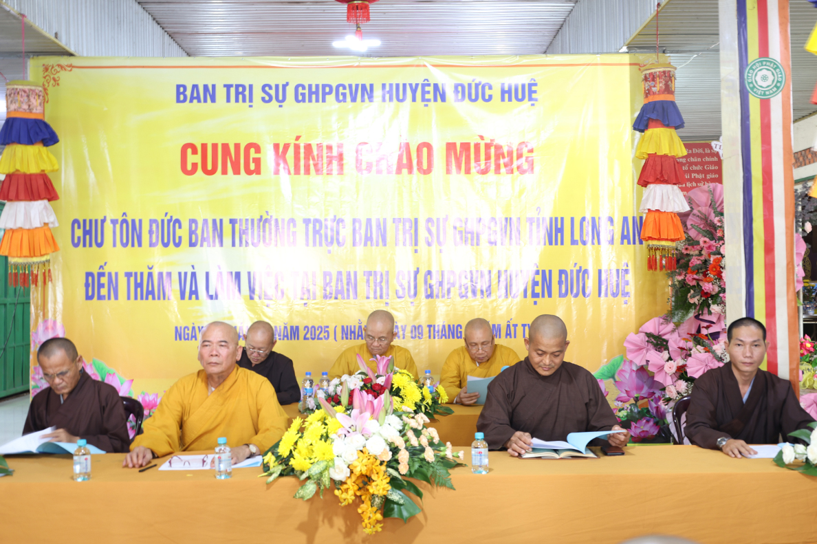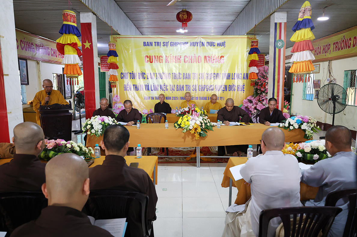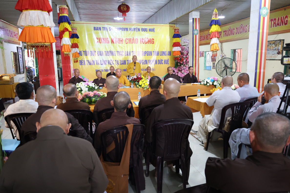 Đón tiếp phái đoàn, về phía BTS GHPGVN huyện Đức Huệ có: ĐĐ. Thích Thiện An – UV BTS GHPGVN tỉnh, Trưởng BTS GHPGVN huyện Đức Huệ; ĐĐ. Thích Minh Trí – Phó Trưởng Ban Thường trực BTS GHPGVN huyện Đức Huệ; ĐĐ. Thích Thiện Trực – Phó BTS kiêm Trưởng ban Từ thiện Xã hội GHPGVN huyện Đức Huệ; ĐĐ. Thích Minh Nguyệt – Phó BTS GHPGVN huyện Đức Huệ; Chư Tôn đức Ban Thường trực BTS GHPGVN huyện; Chư Tôn đức Tăng ni Trụ trì các tự viện, Điểm sinh hoạt và tu học trên địa bàn huyện về tham dự.