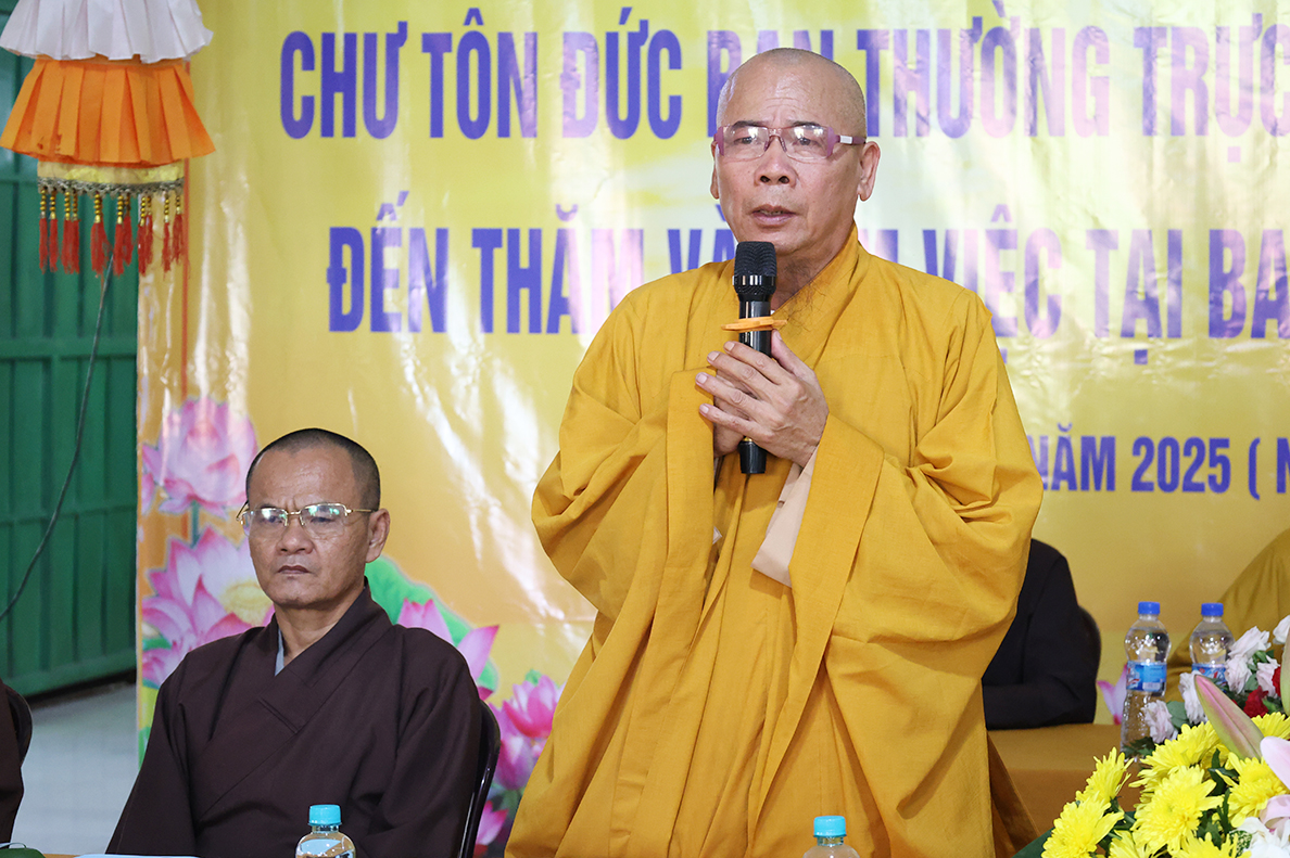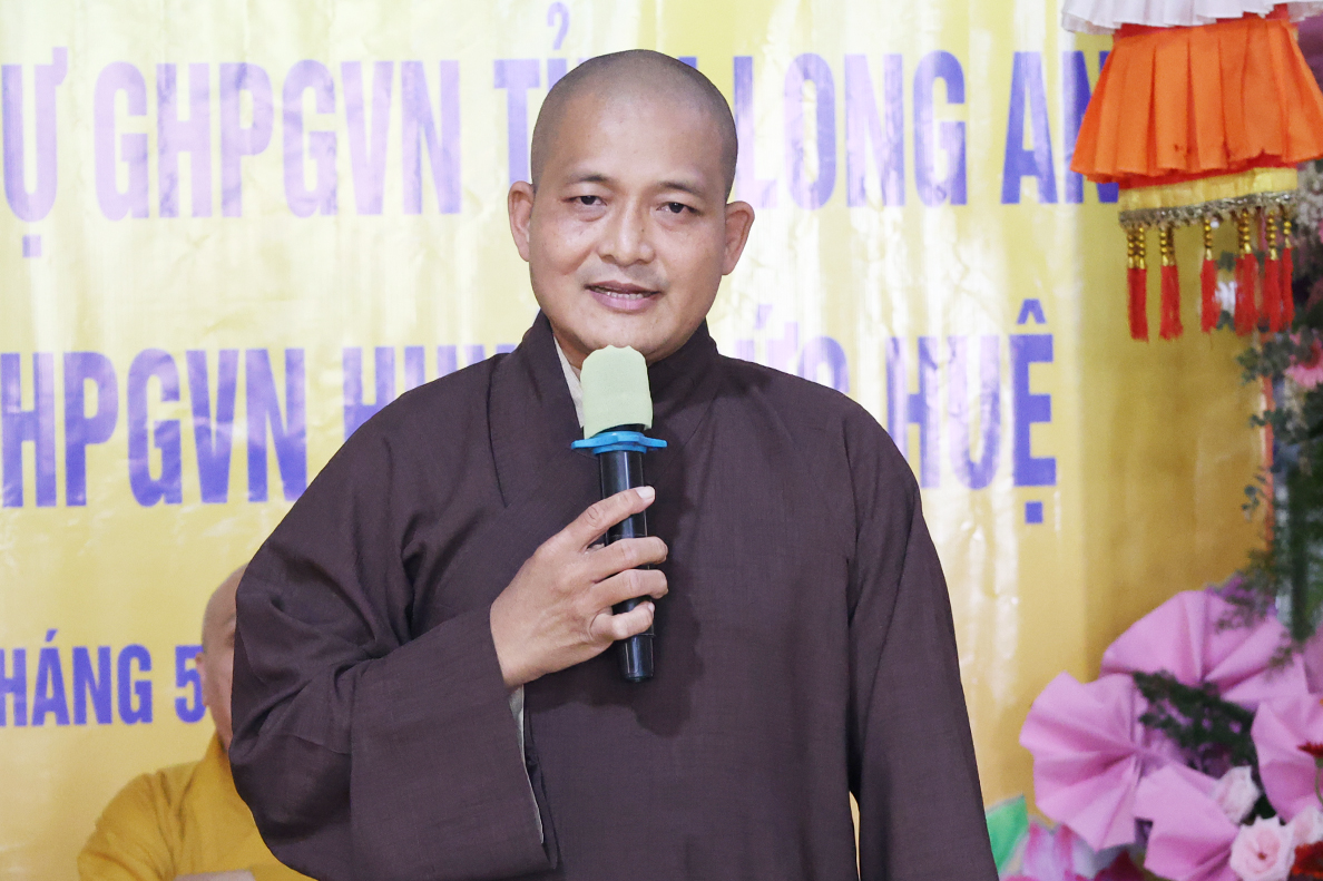 HT. Thích Minh Thiện – Trưởng BTS GHPGVN tỉnh có lời phát biểu đạo từ. Hòa thượng tán thán công đức Tăng Ni Phật tử huyện Đức Huệ đã đồng lòng, hòa hợp, phát huy tinh thần lục hòa cộng trụ trong suốt nhiệm kỳ qua, nhiều Phật sự trọng yếu đã được triển khai một cách hiệu quả, góp phần lan tỏa chánh pháp, làm sáng đạo giữa đời và đi sâu vào lòng dân tộc, nhất là trong điều kiện đặc thù của một huyện vùng biên như Đức Huệ. Hòa thượng ghi nhận sự phát triển khi từ 2 tự viện ban đầu, đến nay toàn huyện đã có thêm 6 điểm sinh hoạt tôn giáo tập trung, cho thấy sự phát triển ổn định của Phật giáo huyện nhà. Định hướng cho chặng đường sắp tới, Hòa thượng nhấn mạnh tầm quan trọng của việc giữ gìn và phát huy truyền thống tu học, đặc biệt là thực hành An cư kiết hạ theo đúng tinh thần Luật tạng để chư Tăng Ni thúc liễm thân tâm, trau dồi giới – định – tuệ, tăng trưởng đạo lực, từ đó làm nền tảng vững chắc cho sự hành đạo và hoằng pháp lợi sinh sau này.