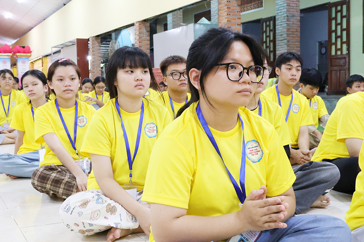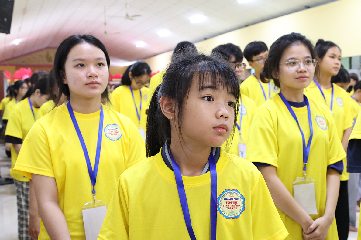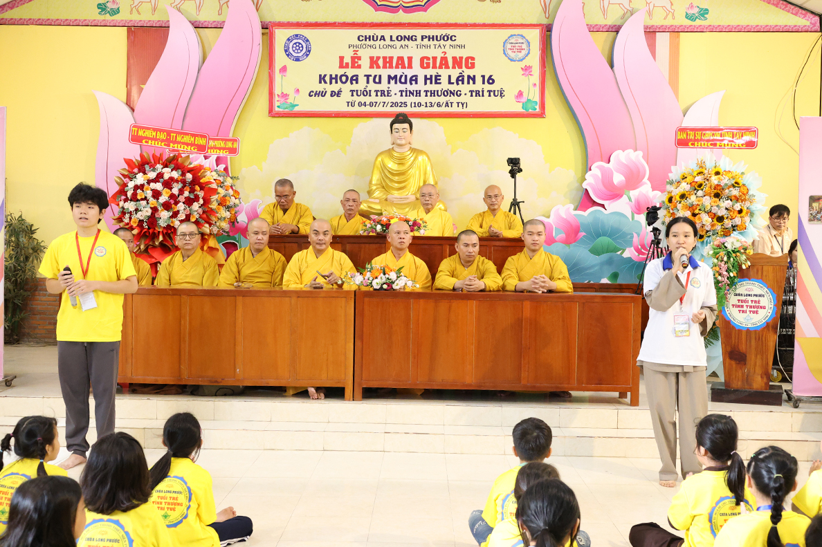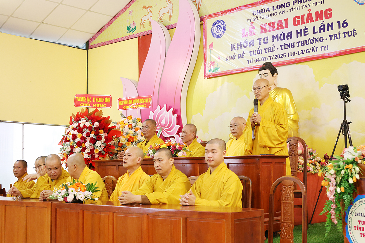 Mở đầu buổi lễ, TT. Thích Lệ Trí – Trưởng BTC báo cáo kế hoạch tổ chức khóa tu. Theo đó, khóa tu được tổ chức trong 04 ngày từ ngày 04 đến 07 tháng 7 năm 2025 với hơn 500 khóa sinh tham dự với sự bảo hộ và đồng ý của phụ huynh. Thượng tọa cho biết, hòa vào trong khí trang nghiêm của chư Tôn đức Tăng ni đăng vun bồi giới thân huệ mạng nơi các trú xứ an cư kiết hạ, Thanh thiếu niên Phật tử cũng phát nguyện trở về các tự viện để tu học đạo đức mùa hè, đó cũng chính là mục tiêu cốt lõi của Khóa tu mùa hè tại chùa Long Phước hằng năm. Tại khóa tu, các khóa sinh không phải chịu bất kỳ chi phí nào. Thượng tọa cũng thông qua chương trình chi tiết và nội dung khóa tu, ngoài tụng niệm theo nghi thức Phật giáo, còn rèn luyện các kỹ năng sống thiết thực, áp dụng vào đời sống hằng ngày thông qua các bài thuyết giảng, chia sẻ và trò chơi lồng ghép trong chương trình.