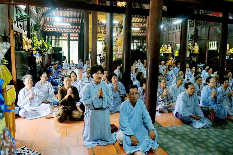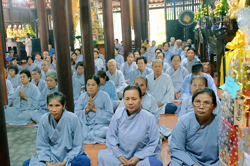 Từ sáng sớm, Phật tử các nơi đã tập trung về Tổ đình rất đông để cùng tham dự các thời khóa tụng kinh cầu nguyện.