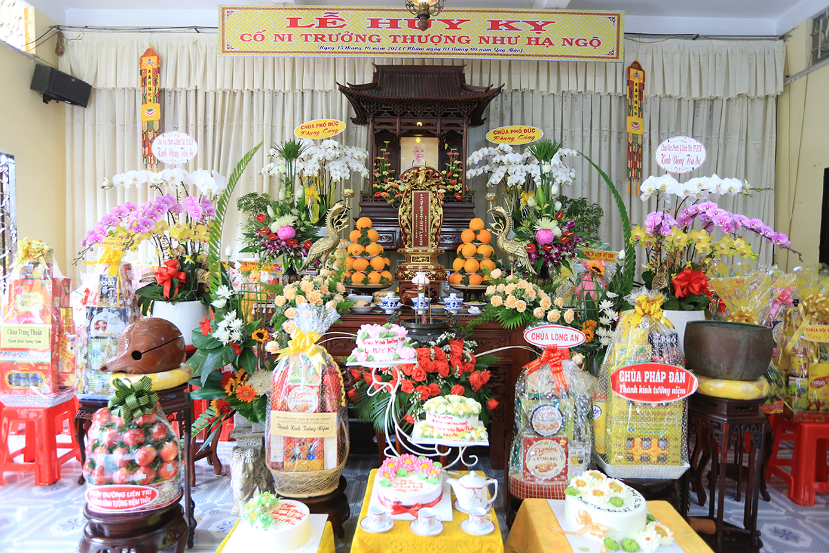 Ngày tưởng niệm diễn ra trong không khí thiêng liêng, HT. Thích Thiện Tài- CM Ban Trị sự, CM Ban Nghi lễ Phật giáo tỉnh Long An đương vi pháp sự cung tiến Giác linh Ni trưởng thượng Như hạ Ngộ. Tại Giác linh đường khói hương quyện tỏa, môn nhân tứ chúng chí thành bùi ngùi phụng kính Ân sư, thượng hương cúng dường lễ niệm. Tiếp đó, Ban cung nghinh cung thỉnh chư Tôn thiền đức Đại tăng quang lâm trai đường chứng minh pháp sự cúng dường.