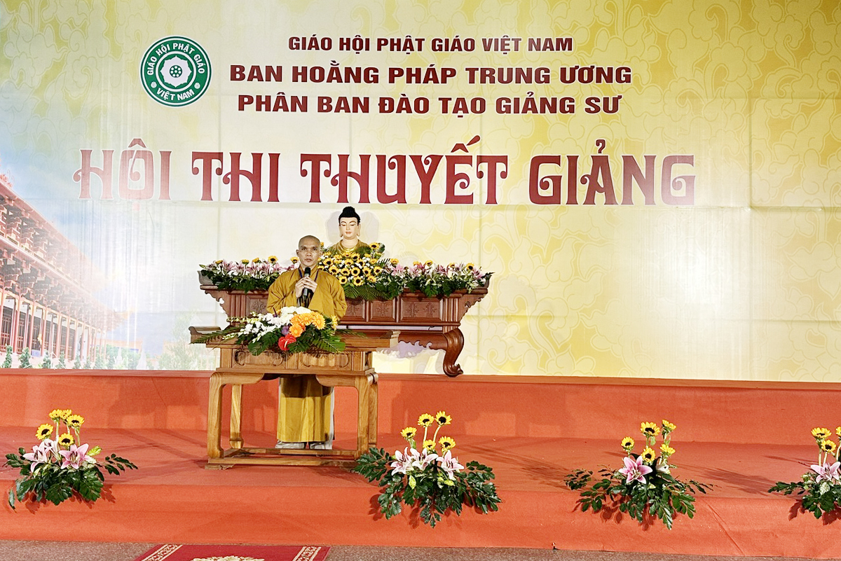 Tiếp theo toàn thể Hội chúng được cung nghinh Trưởng lão Hoà thượng Thích Thiện Nhơn quang lâm ban đạo từ. Thay mặt Ban Tổ chức, Thượng toạ Thích Minh Nhẫn đã báo cáo đến Hòa thượng Chủ tịch Hội đồng Trị sự GHPGVN về kết quả Hội thi thuyết giảng có: 9 vị Giảng sinh đăng ký và 9 vị đều đạt kết quả xuất sắc, hoàn thành phần thuyết giảng của mình. Đồng thời, cầu thỉnh đức Hòa thượng ban lời đạo từ đến toàn thể Tăng, Ni 2 Khóa Cao – Trung cấp Giảng sư để lấy đó làm hành trang trên bước đường hoằng pháp độ sinh. Trong đó, thí sinh Thích Minh Đạo với đề tài “Thất Giác Chi” đã được BGK cho số điểm gần tuyệt đối là 18,64.