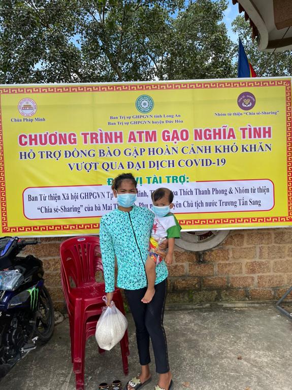 Với mục đích lan tỏa năng lượng từ tâm đến với mọi người và nhằm hỗ trợ đồng bào vượt qua khó khăn trong đại dịch Covid-19; Ban Trị sự GHPGVN tỉnh Long An, Ban Trị sự GHPGVN huyện Đức Hòa phối hợp với chùa Pháp Minh (ấp Giồng Lớn, huyện Đức Hòa, tỉnh Long Long An) vận động Ban Từ thiện Xã hội GHPGVN Tp HCM, Thượng tọa Thích Thanh Phong-Ủy viên Thường trực Hội đồng Trị sự, Trưởng ban Kinh tế Tài chánh TƯ, Trưởng ban Từ thiện Xã hội GHPGVN Tp HCM và nhóm từ thiện “Chia sẻ-Sharing” của bà Mai Thị Hạnh-Phu nhân Chủ tịch nước Trương Tấn Sang thành lập ATM gạo tình nghĩa tại chùa Pháp Minh.