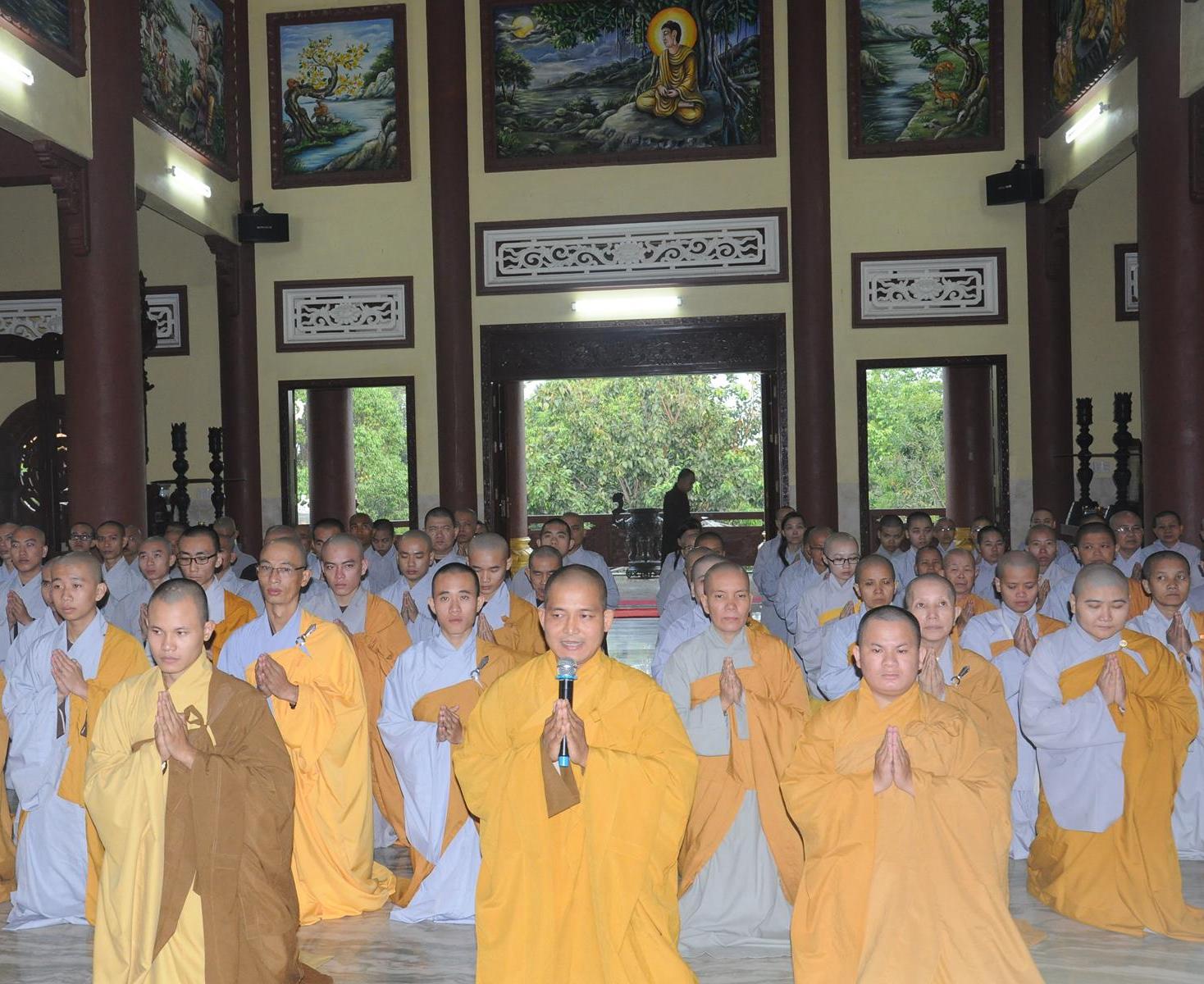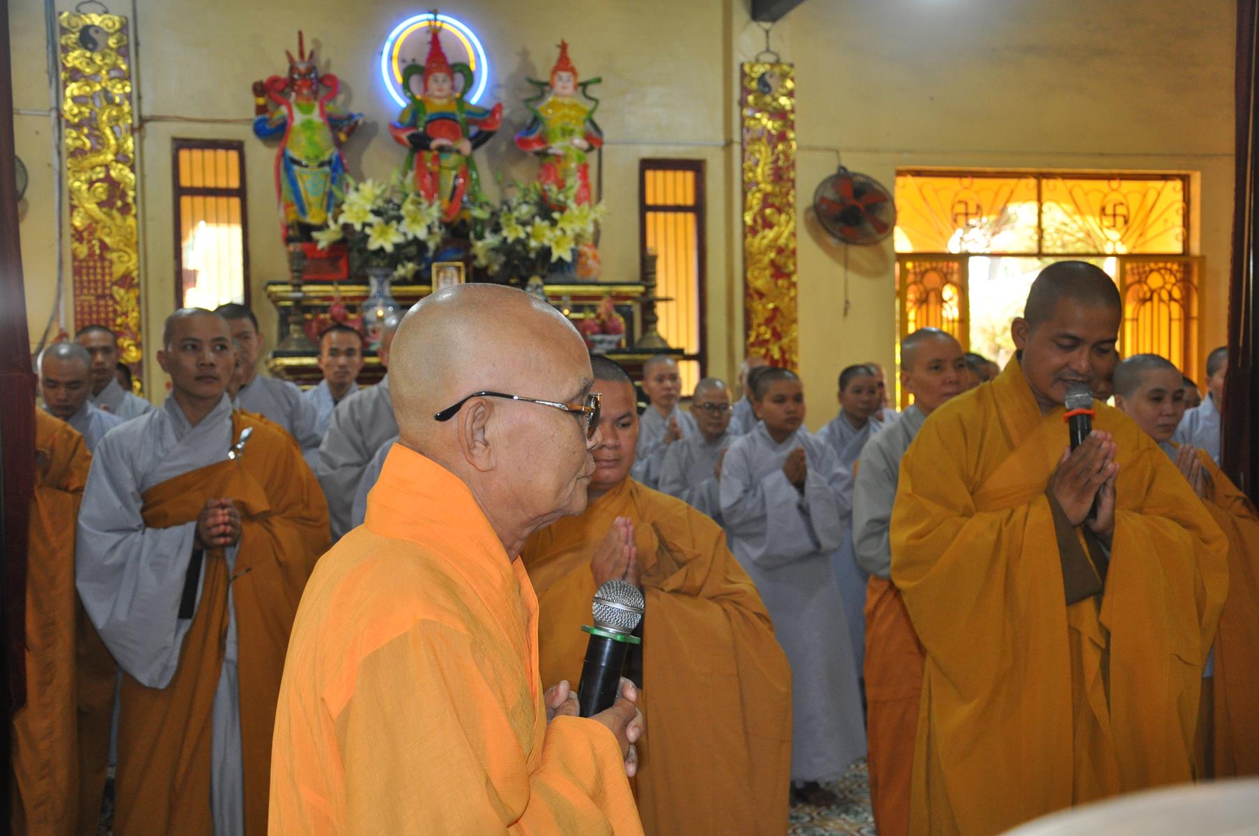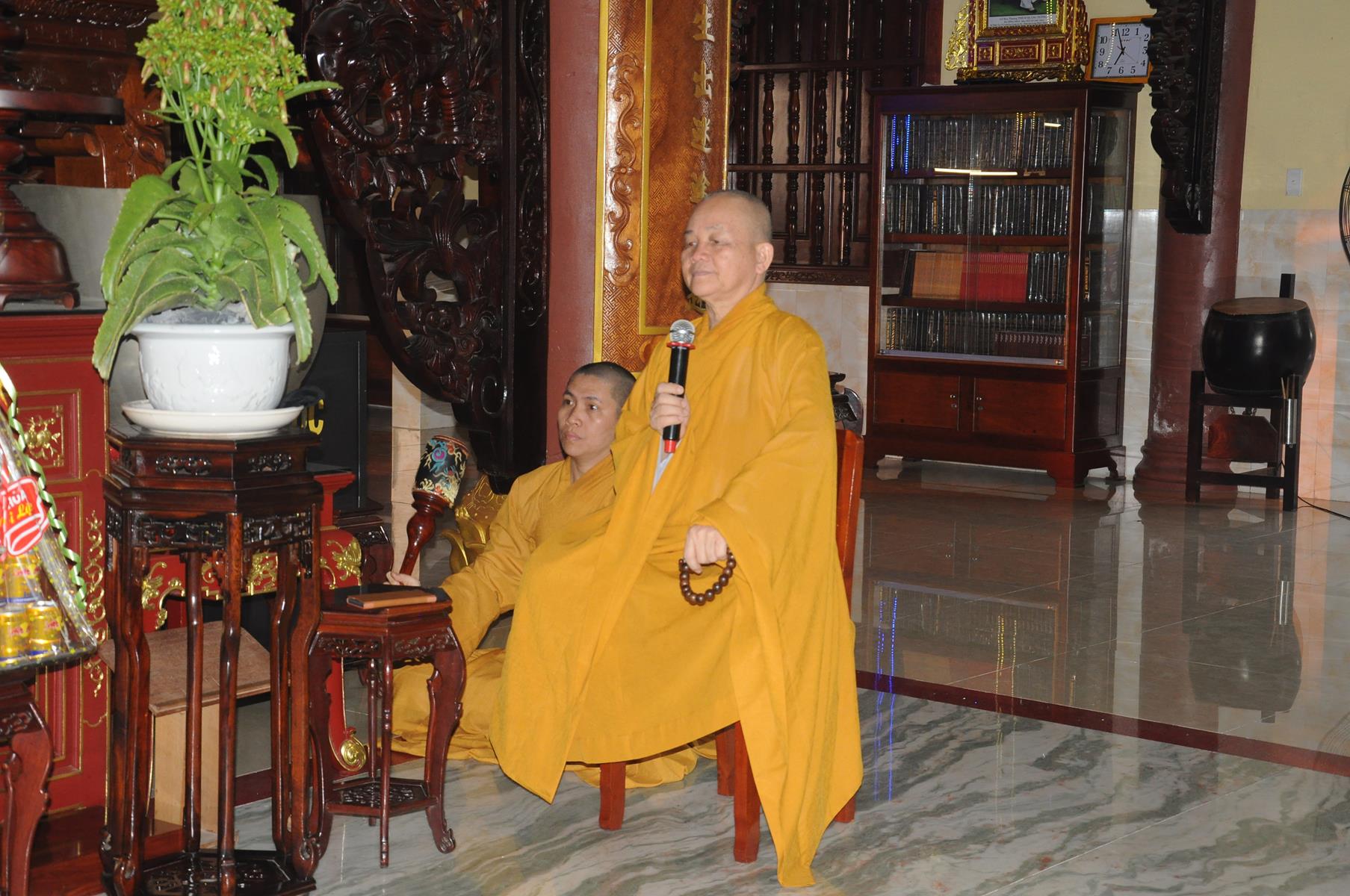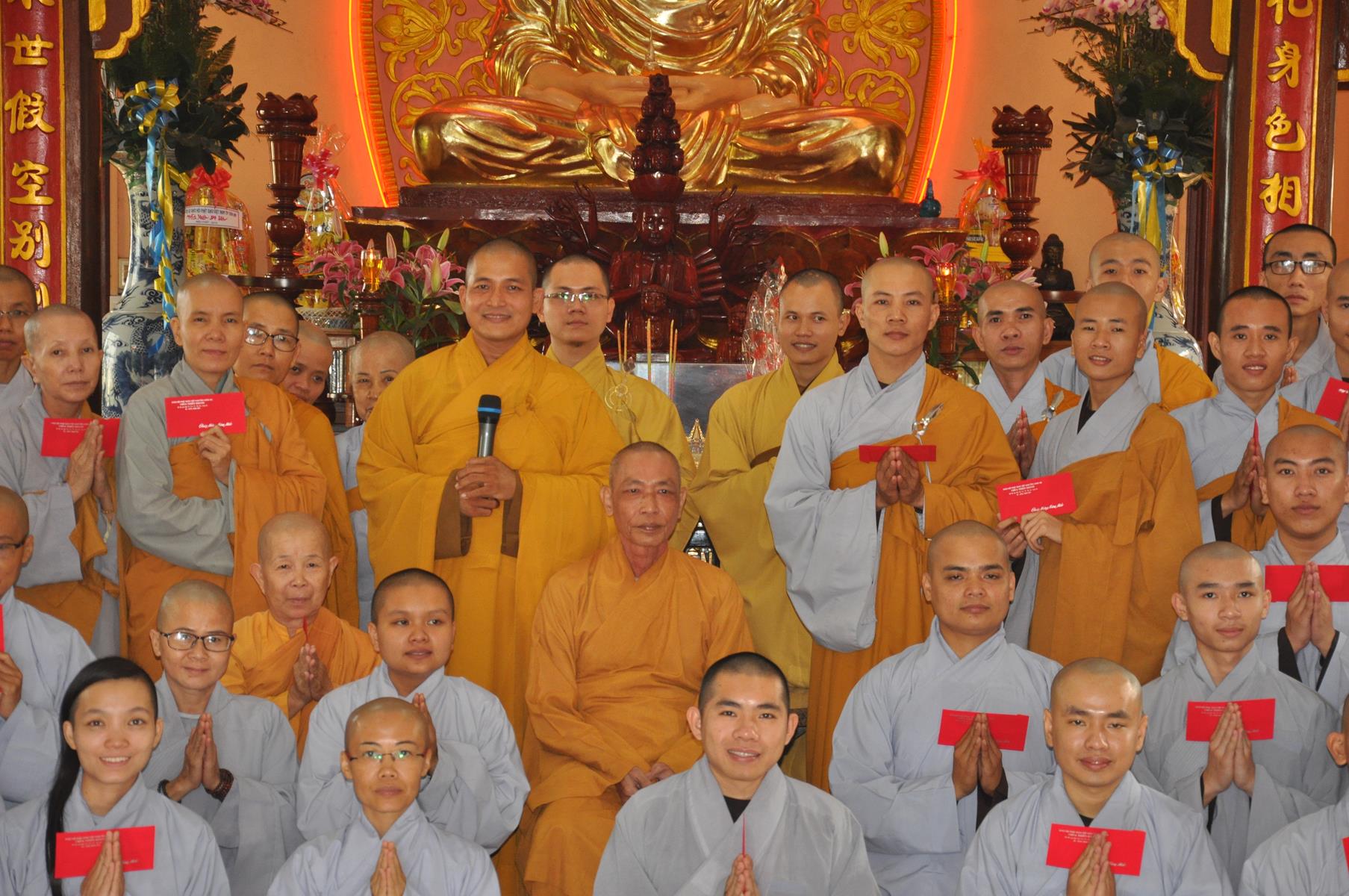Mở đầu cho lời huấn thị, Hòa Thượng Hiệu Trưởng Ân sư nhắc Tăng Ni về nguồn cội, về văn hóa truyền thống tốt đẹp của ngày tết cổ truyền, về những mộc mạc chân phương dễ thương đến không thể nào bỏ được “Mùng một tết giận hờn gì cũng bỏ qua hết, chỉ dành những câu chúc với những lời tốt đẹp nhất cho nhau thôi” giản đơn vậy mà đẹp khiến mỗi người chúng ta khi nghĩ đến ngày tết đã thấy vui rồi. Hòa Thượng quan tâm đến đời sống tu tập của chư Tăng Ni và sách tấn huynh đệ là những tu sĩ trẻ đã phát tâm dấn thân ra làm Phật sự chắc chắn sẽ gặp nhiều khó khăn, nhiều tị hiềm, nhiều chướng ngại… các con cố gắng vượt qua, đoàn kết thương nhau, nâng đỡ nhau, gánh vác, chia sẻ nhau trong mọi Phật sự chung tay xây dựng ngôi nhà Phật pháp ngày một xương minh, cho phạm vũ ngày một huy hoàng “..Tâm hình dị tục, mới thiệu long thánh chủng được..”. Hòa Thượng có lời khuyên dạy Ban chủ nhiệm cố gắng nhiều hơn nữa trong công việc quản lý, giám sát, sách tấn, động viên, khích lệ đối với Tăng Ni sinh Lớp Sơ Cấp Phật Học “tuổi còn nhỏ, hay dù đã lớn nhưng đều mới vào đạo nên các con để ý quan tâm nhiều hơn, thiết lập nền tảng nhân cách đạo đức căn bản để sau này trở thành người tu sĩ không những giỏi về tri thức mà còn đẹp về nhân cách.” Hòa Thượng răn dạy Tăng Ni sinh phải siêng tu, siêng học đền ơn Thầy tổ, mẹ cha và đàn na tín thí, và để trở thành người tu sĩ Phật giáo tốt làm tốt đạo đẹp đời.