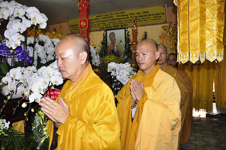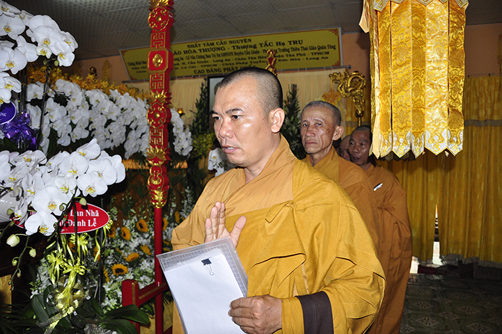 Thích Minh Thiện đại diện Ban Trị sự GHPGVN tỉnh Long An và Ban Giám Hiệu Trường Trung cấp Phật học Long An có lời ai điếu bày tỏ lòng thành kính tri ân đến Giác linh Hoà thượng. Nhiều thế hệ Tăng Ni trong tỉnh đã được duyên lành thụ huấn lời dạy của Ngài. Hòa thượng Minh Thiện tỏ lòng tiếc thương đối với Cố Hòa thượng và tri ân cố Hòa thượng có nhiều cống hiến, đóng góp cho sự nghiệp phát triển Phật giáo tỉnh nhà. Xin nguyện noi gương lành của Ngài phụng sự Đạo pháp và dân tộc. Nguyện luôn học theo hạnh Ngài và một lòng đoàn kết phát triển đạo pháp để ngôi nhà Giáo hội thêm vững mạnh, cho đạo pháp mãi lưu truyền. Nguyện cầu Giác linh cố Trưởng lão Hòa thượng cao đăng Phật quốc.