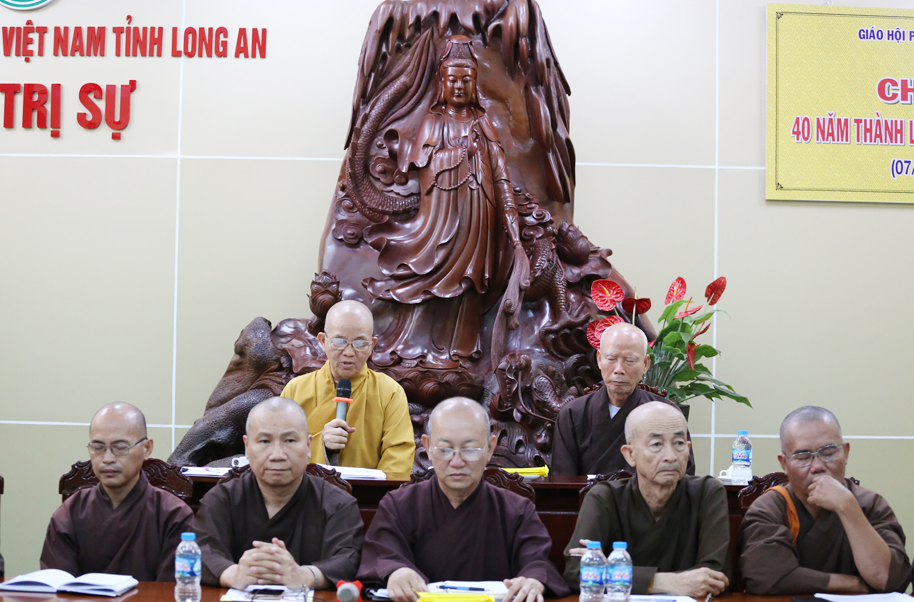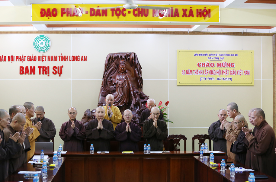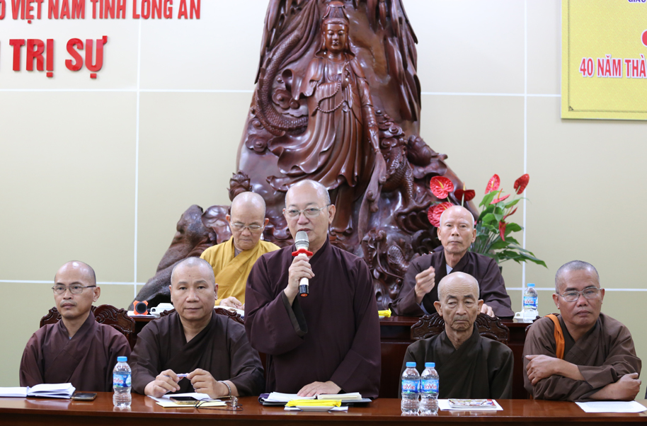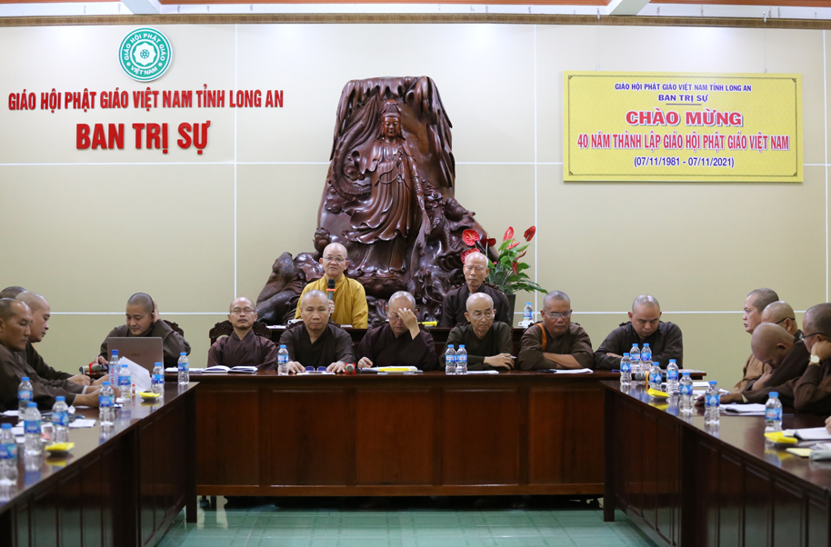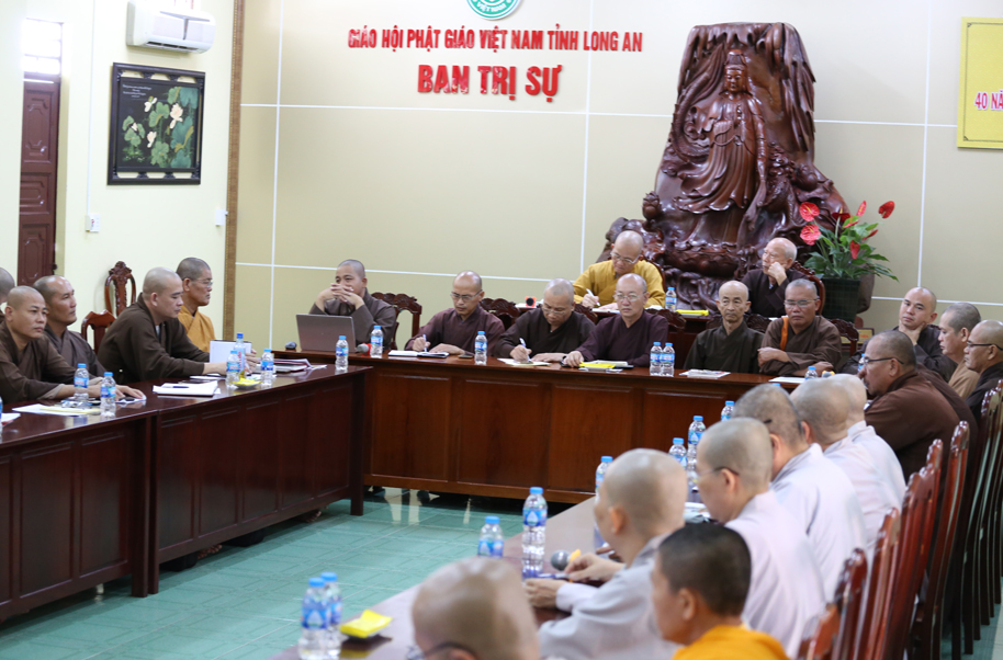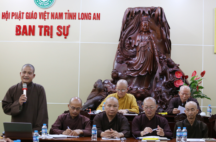 Nhằm tổng kết họat động Phật sự tháng vừa qua, triển khai hoạt động Phật sự tháng tiếp theo; sau nghi thức niệm Phật cầu gia hộ, tuyên bố lý do, giới thiệu thành phần tham dự, chư tôn đức đại diện Ban Trị sự GHPGVN các huyện, thị xã, thành phố theo lời thỉnh của Đại đức Thích Lệ Duyên, đã lần lượt báo cáo tình hình sinh hoạt chung và công tác Phật sự tháng vừa qua. Theo đó, tình hình sinh hoạt tu học của các tự viện ổn định, duy trì các đạo tràng tu học, các hoạt động Phật sự theo như đã đăng ký. Công bố hai điểm sinh họat tôn giáo tập trung Pháp Hòa (huyện Đức Huệ), Ngọc Hưng (huyện Vĩnh Hưng). Hoạt động nổi bật nhất là công tác từ thiện với tổng giá trị gần 12 tỷ đồng.