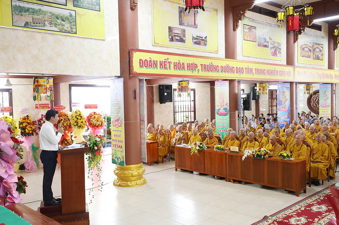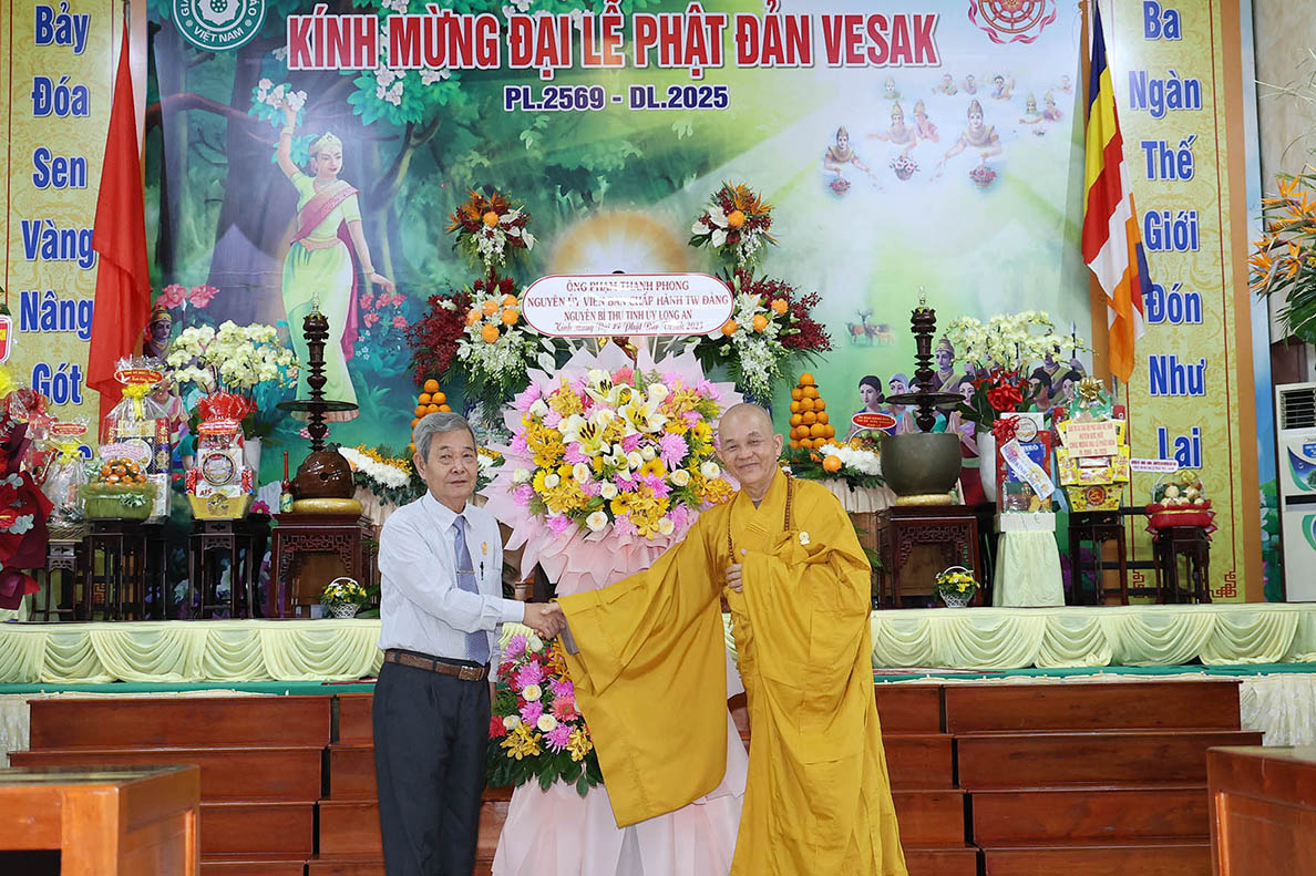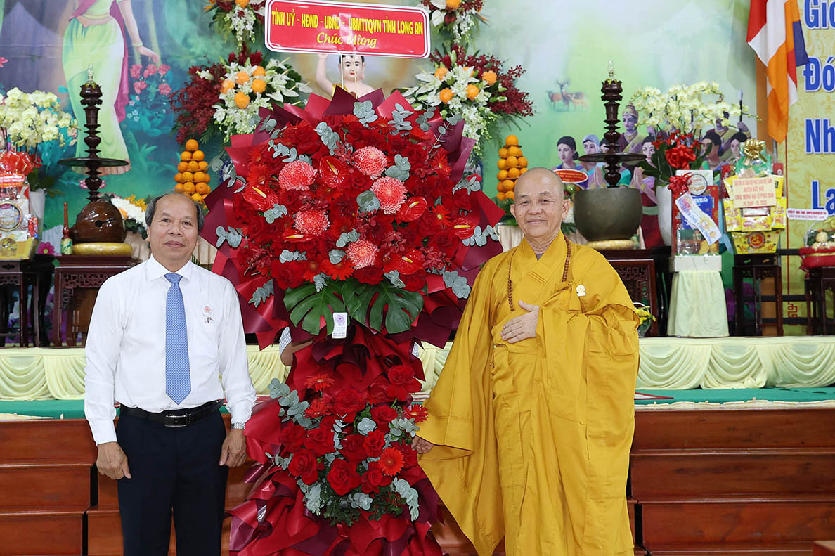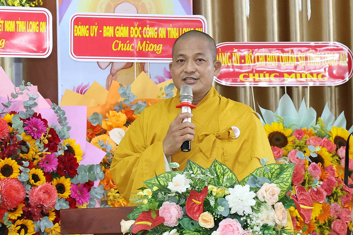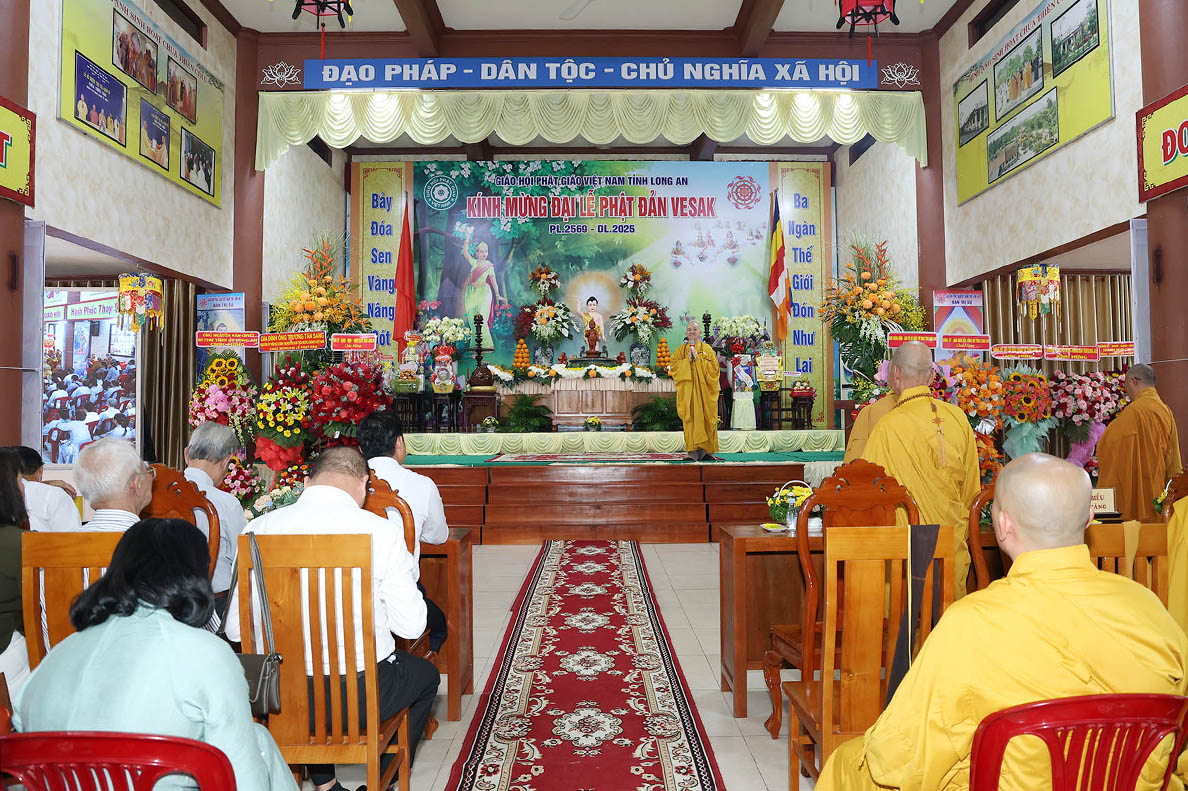 Phát biểu tại buổi lễ, ông Phạm Tấn Hòa – Phó Chủ tịch UBND tỉnh Long An thay mặt lãnh đạo tỉnh gửi lời chúc mừng Phật Đản và ghi nhận những đóng góp thiết thực của Giáo hội Phật giáo Việt Nam, đặc biệt là sự kiện Đại lễ Vesak Liên Hợp Quốc 2025 tổ chức tại Việt Nam. Ông cũng biểu dương tinh thần nhập thế của Phật giáo Long An trong các hoạt động an sinh xã hội như xóa đói giảm nghèo, đền ơn đáp nghĩa và chương trình “Chung tay vì người nghèo”. Riêng trong quý I/2025, Tăng Ni, Phật tử toàn tỉnh đã đóng góp gần 20 tỷ đồng cho công tác từ thiện.