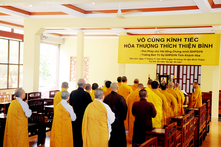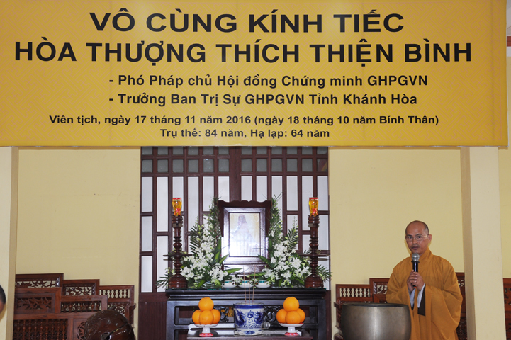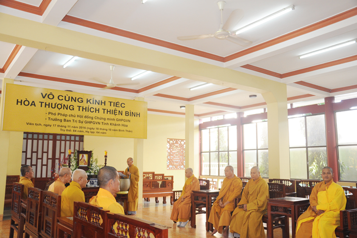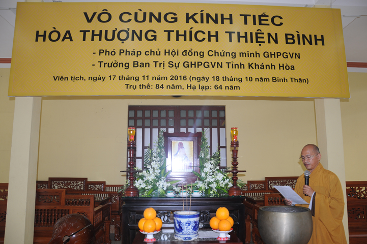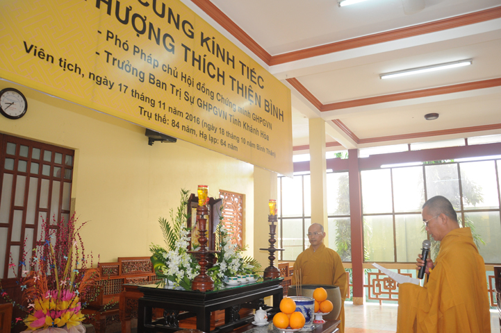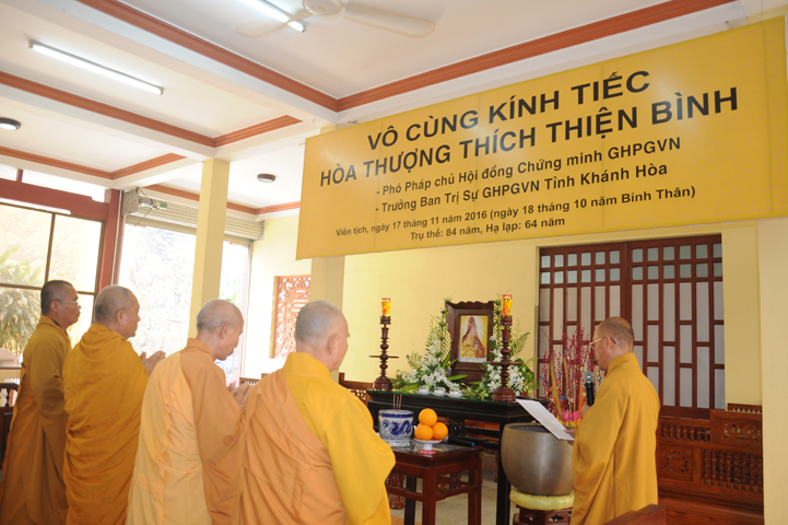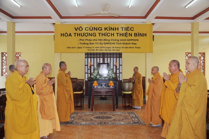Sáng nay, ngày 24 tháng 11 năm 2016( 25/10/ Bính Thân) tại Chùa Thiên Châu văn phòng Ban trị sự , số 101, Đường Huỳnh Văn Nhứt, phường 3, TP. Tân An tỉnh Long An Thường trực Ban trị sự GHPGVN tỉnh Long An Chư tôn đức Tăng Ni, Phật tử tỉnh Long An đã trang nghiêm tổ chức lễ tưởng niệm HT.Thích Thiện Bình- Phó Pháp chủ HĐCM, Trưởng Ban trị sự tỉnh Khánh Hòa, viện chủ Sắc tứ chùa Long Sơn, TP. Nha Trang, tỉnh Khánh Hòa.