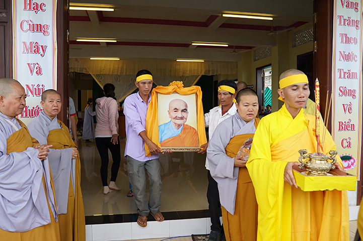 Sau phần niệm hương bạch Phật trước lễ đài, đến phần tưởng niệm giác linh Ni sư Diệu Búp, HT. Thích Minh Thiện – Trưởng Ban trị sự GHPGVN tỉnh Long An, trưởng phái đoàn, đãi lao Hoà thượng Thích Thiện Huệ, chư tôn đức trong phái đoàn, với thâm tình linh sơn pháp lữ, Hoà thượng đã chia sẽ và nhắc lại chặng đường tu học của cố Ni sư: Ni sư được phước lành làm đệ tử với cố Trưởng lão Hoà thượng thượng Hoằng hạ Đức; từ đó Ni sư tu học theo hạnh, từ ái, khiêm cung, tinh tấn công phu, công quả của hoà thượng ân sư và duy trì cho đến ngày trở về với Phật. Đặc biệt, dù sức khoẻ yếu nhưng gần 25 năm giữ gìn ngôi già lam Bình An, Ni sư đã thành lập được các khoá tu học cho Phật tử địa phương, cung thỉnh được nhiều chư tôn đức về giảng dạy cho đạo tràng. Và nhân duyên từng xuất thân từ gia đình cách mạng nên cuộc đời Ni sư đã đóng góp rất nhiều cho công tác xã hội, từ giáo dục đến từ thiện, xây dựng mặt trận đoàn kết dân tộc v.v…. Qua đó, Hoà thượng cũng muốn nhắc hàng hậu học Ni giới cần học theo đạo hạnh của Ni sư để có nhiều cống hiến, đóng góp cho Đạo pháp – Dân tộc!