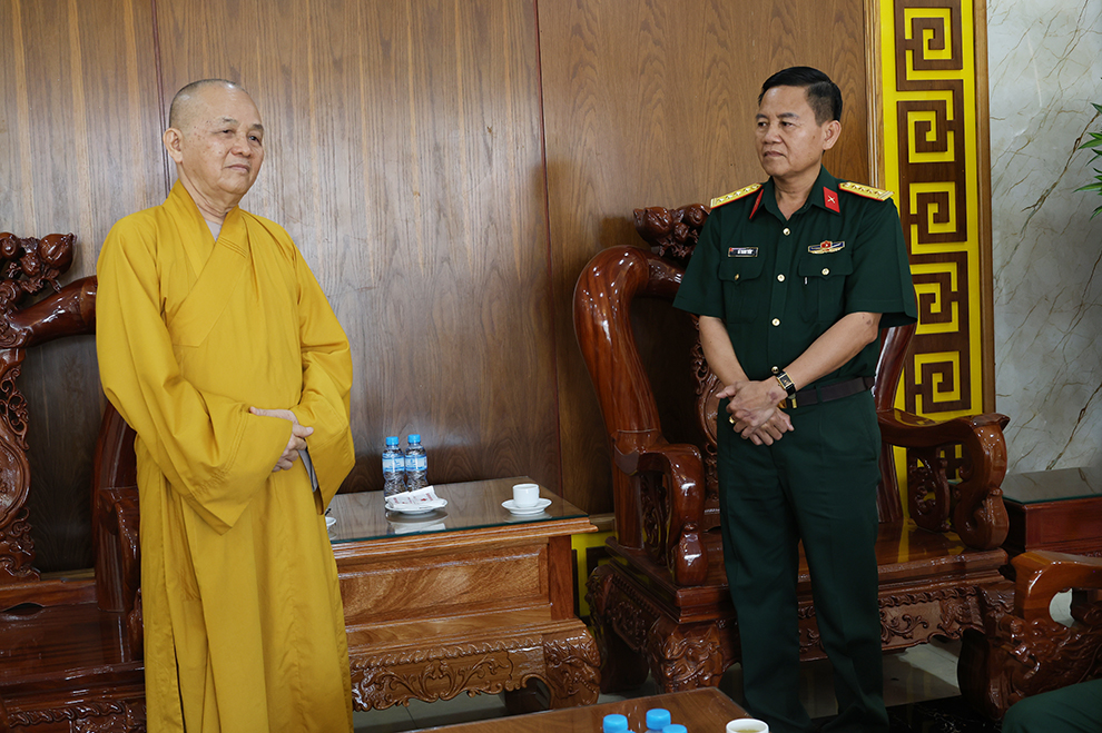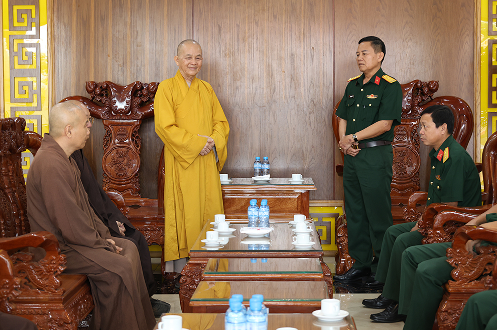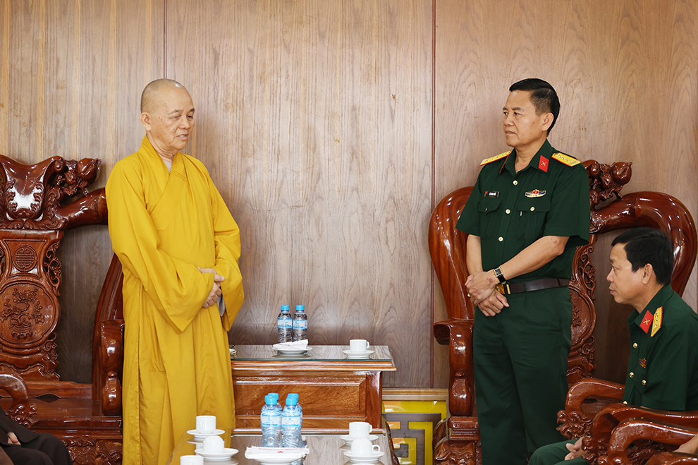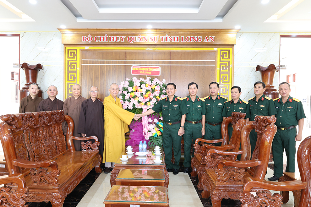 Thay mặt Ban Trị sự GHPGVN tỉnh Long An, Hòa thượng Thích Minh Thiện bày tỏ lòng tri ân sâu sắc đối với các thế hệ cán bộ, chiến sĩ LLVT tỉnh Long An đã cống hiến cả cuộc đời cho dân tộc, đất nước để góp phần có được hòa bình như hôm nay. Nhân dịp kỷ niệm 50 năm Ngày giải phóng miền Nam, thống nhất đất nước, Hòa thượng Thích Minh Thiện chúc cán bộ, chiến sĩ luôn mạnh khỏe, vững chắc tay súng để bảo vệ Tổ quốc, nhân dân. Thông qua đó, Hòa thượng ôn lại truyền thống cách mạng vẻ vang của quân và dân ta trong sự nghiệp giải phóng dân tộc. Hòa thượng có nhắc về trách nhiệm Phật giáo đồng hành cùng dân tộc, nhất là trong xu thế hội nhập quốc tế. Điều đó càng làm cho tinh thần giữa Phật giáo và Dân tộc càng trở nên ý nghĩa hơn nhân dịp ngày hội lớn của non sông. Trong chương trình Đại lễ Phật đản sắp đến, Hòa thượng cũng thông tri đến quý lãnh đạo về chương trình tưởng niệm anh hùng liệt sĩ tại Văn phòng BTS Phật giáo tỉnh – Chùa Thiên Châu, TP. Tân An. Hòa thượng bày tỏ lòng thành kính tưởng nhớ các bậc tiền nhân, đồng thời nguyện cầu cho quốc thái dân an, đất nước ngày càng phồn vinh, hạnh phúc.