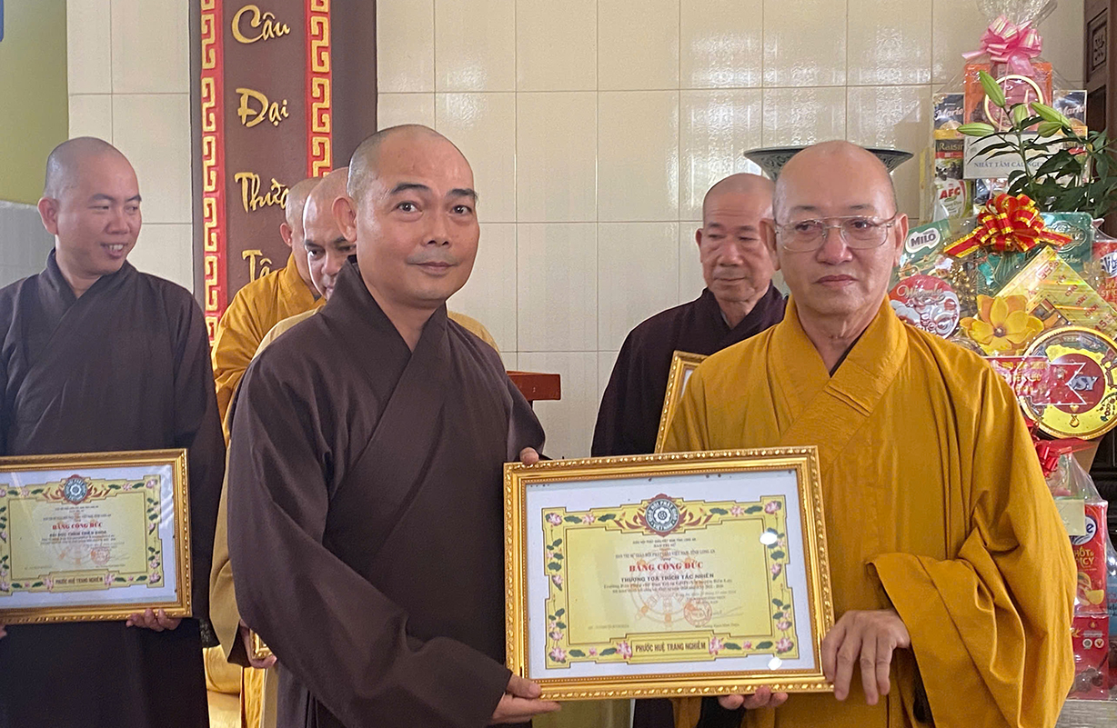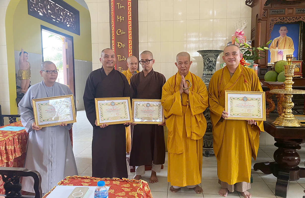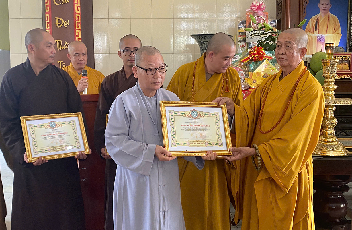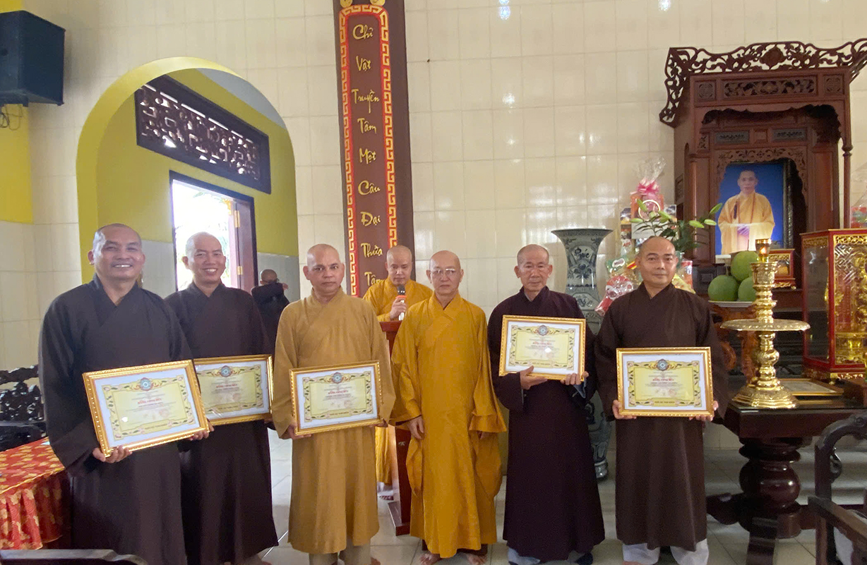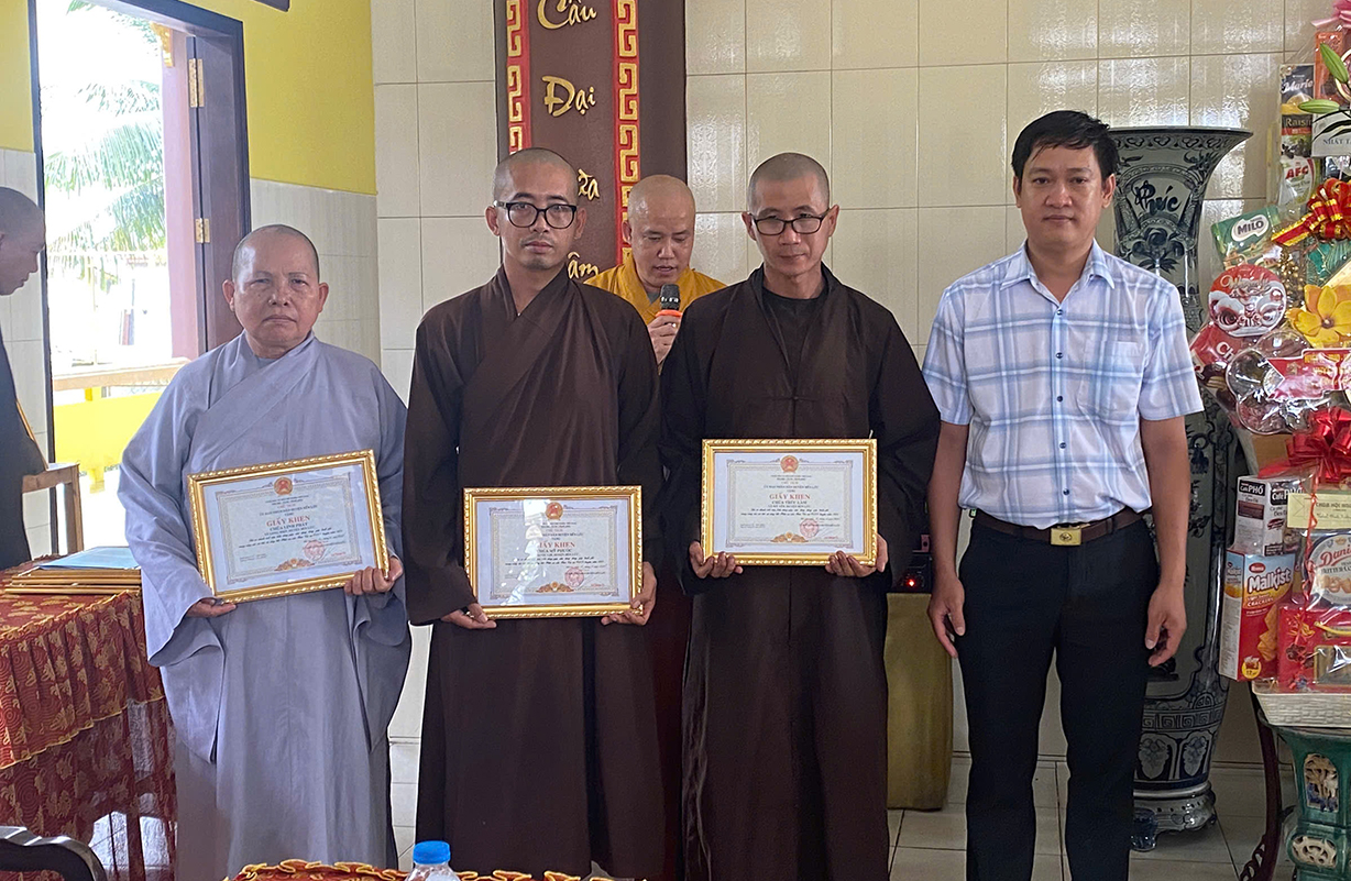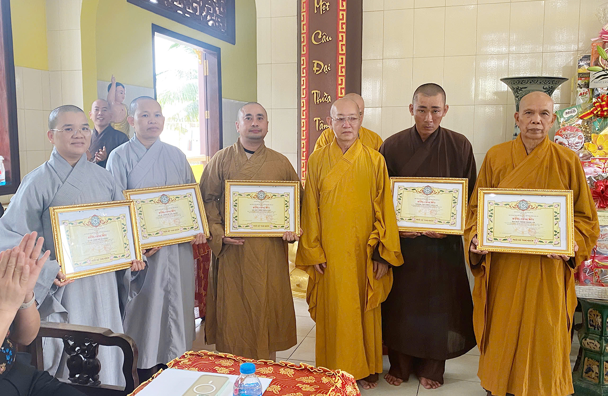 Ghi nhận đóng góp tích cực của tập thể Tăng Ni và các tự viện; ĐĐ. Thích An Nhựt – Trưởng ban Hướng dẫn Phật tử GHPGVN tỉnh Long An truyên đọc danh sách khen thưởng , BTS GHPGVN tỉnh Long An, UBND huyện Bến Lức đã trao tặng nhiều Bằng Tuyên Dương Công Đức, Bằng Công Đức và Giấy khen đến các tập thể và cá nhân tiêu biểu.