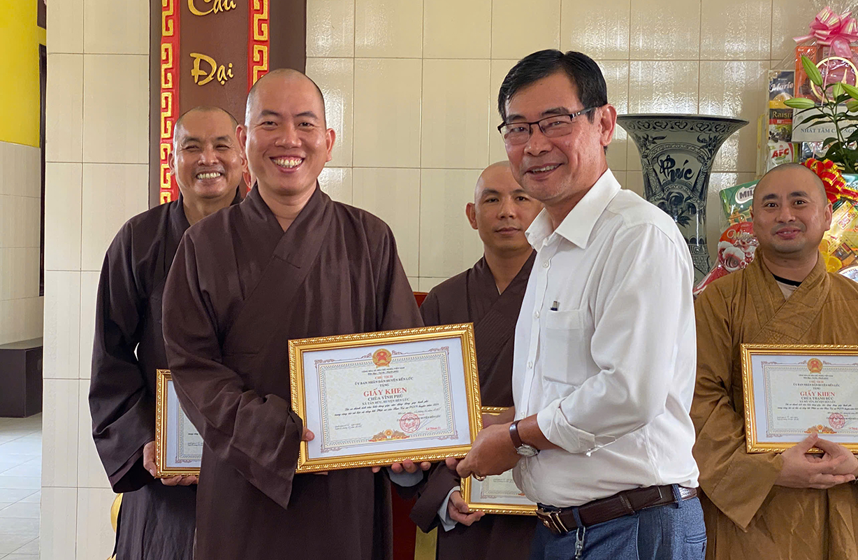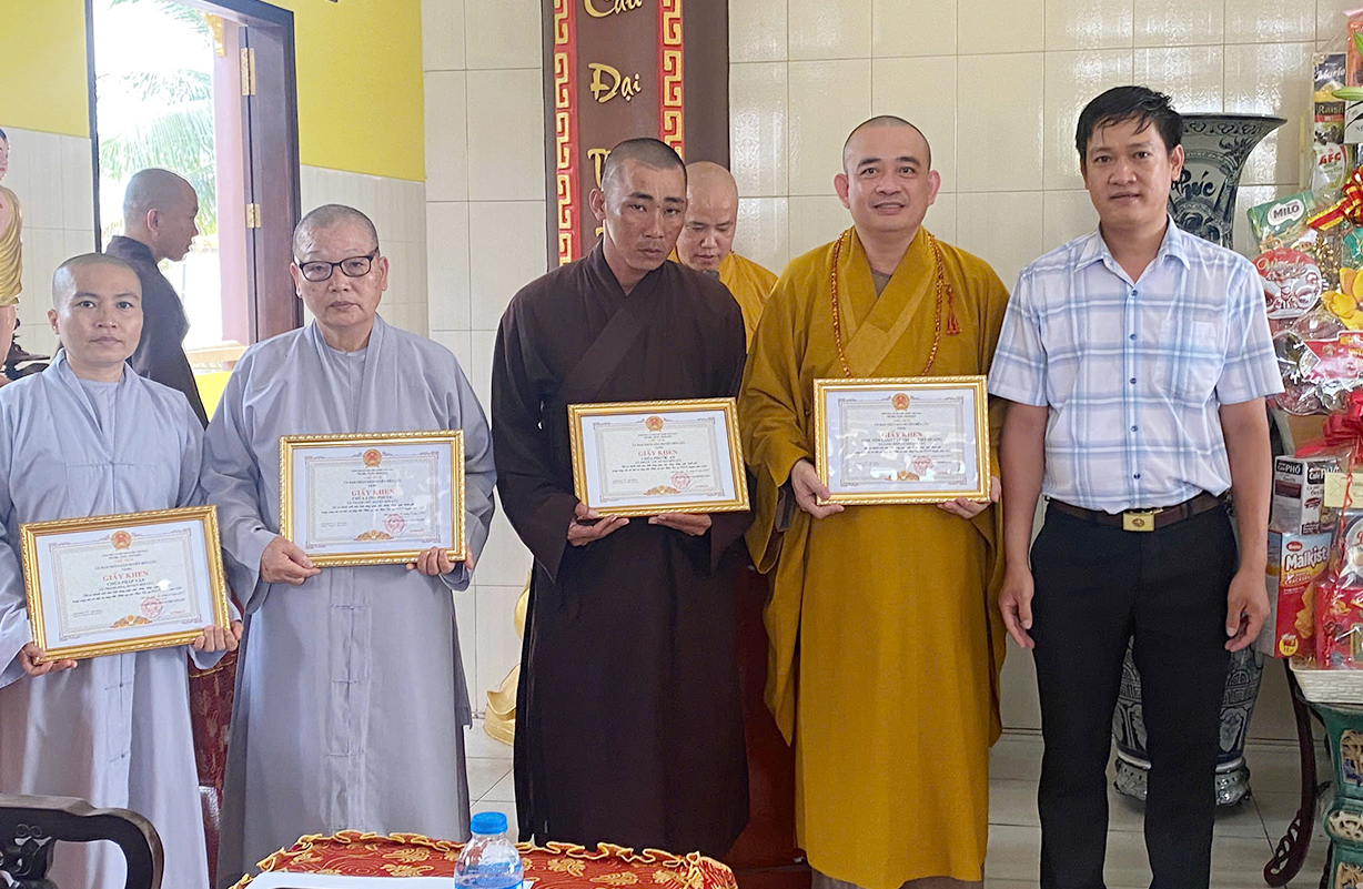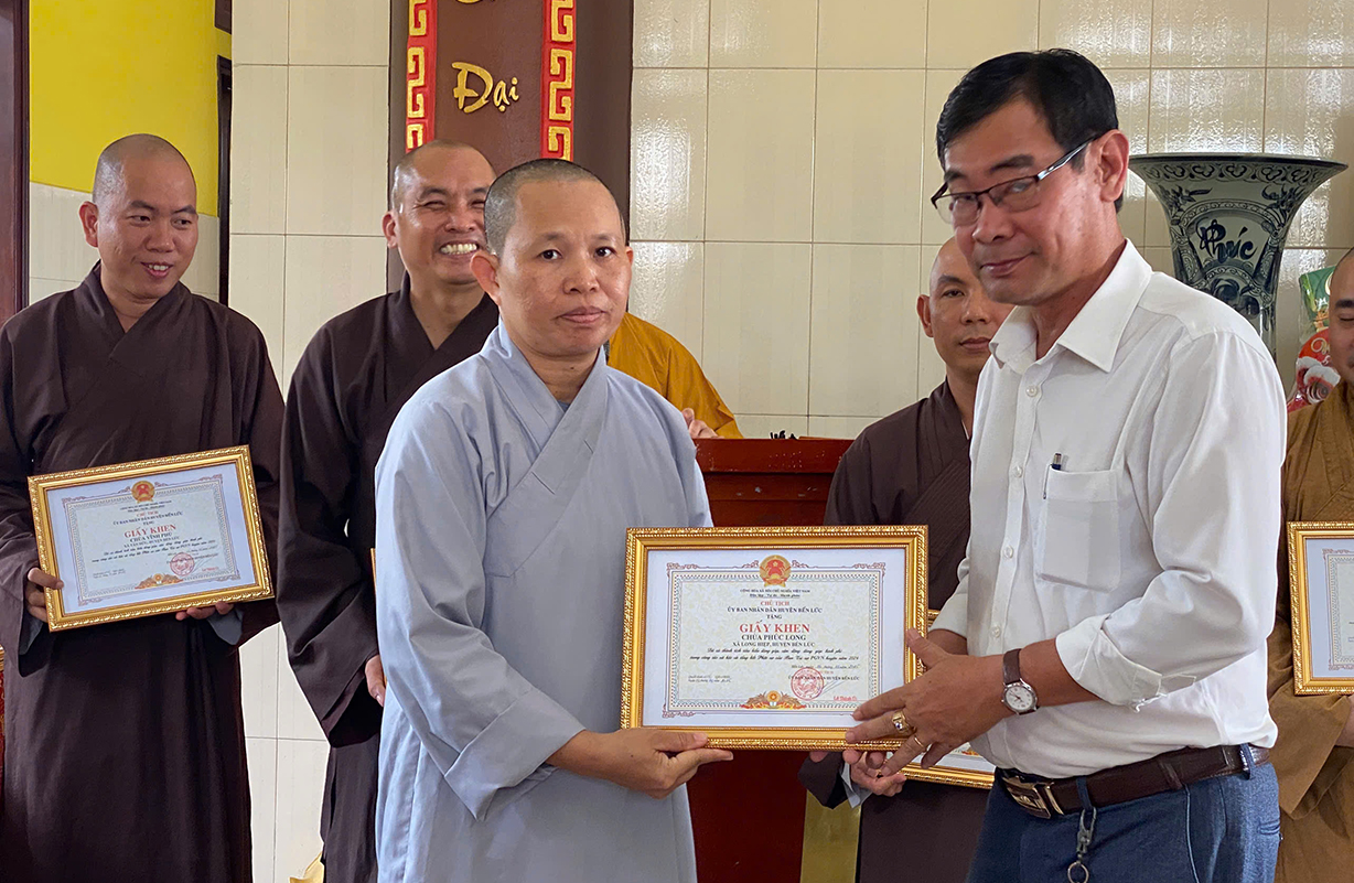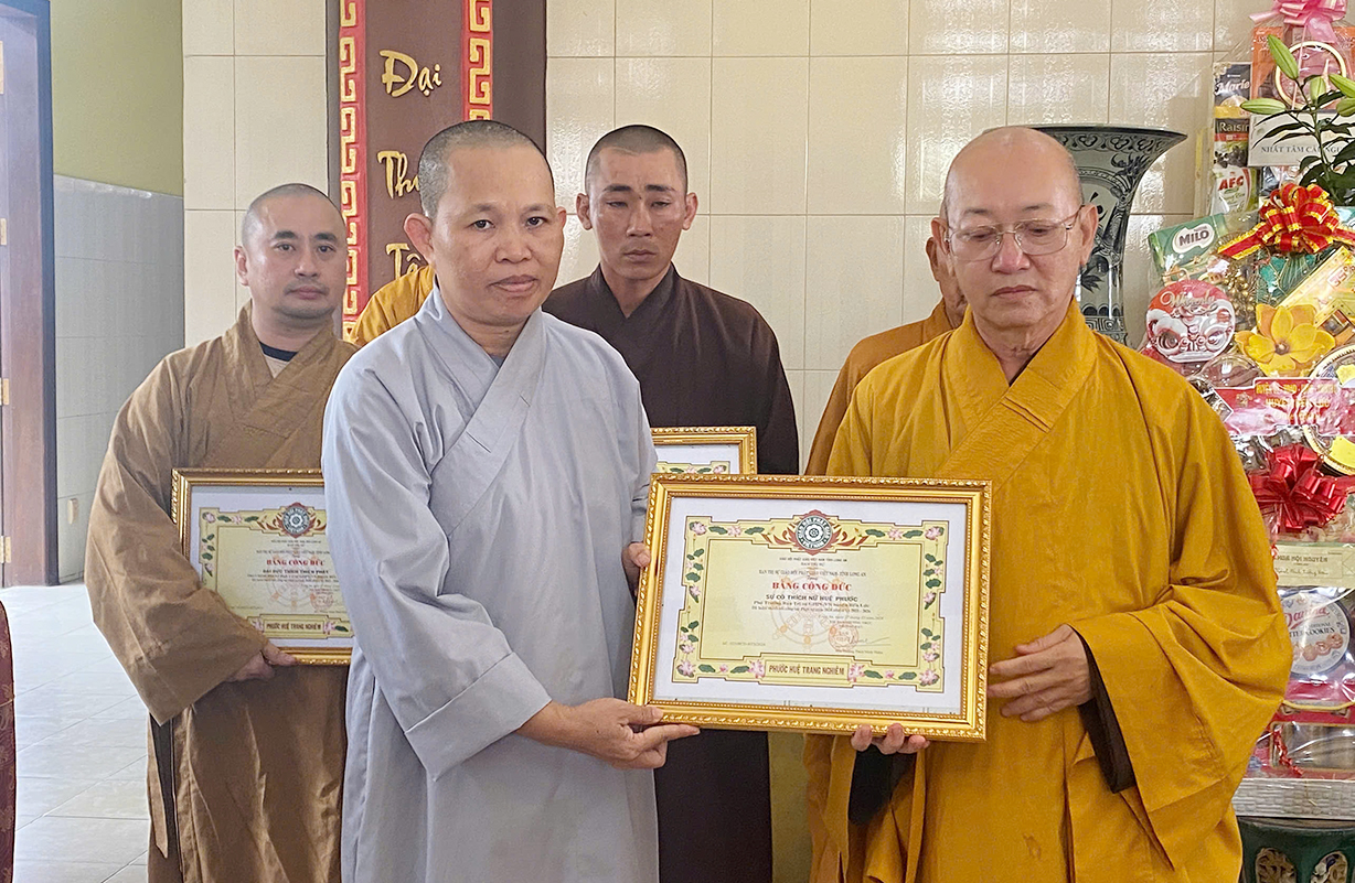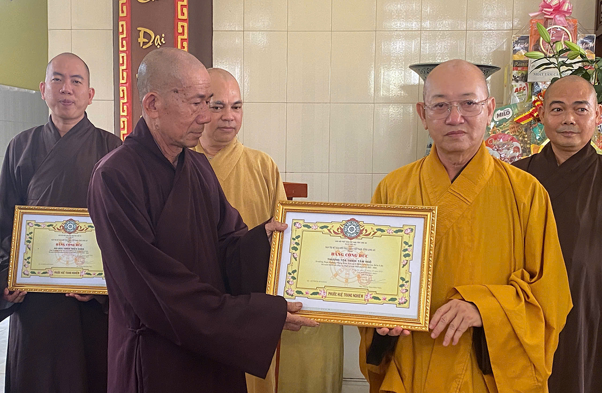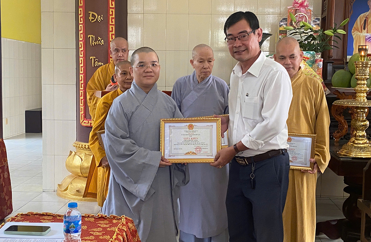 Ghi nhận đóng góp tích cực của tập thể Tăng Ni và các tự viện; ĐĐ. Thích An Nhựt – Trưởng ban Hướng dẫn Phật tử GHPGVN tỉnh Long An truyên đọc danh sách khen thưởng , BTS GHPGVN tỉnh Long An, UBND huyện Bến Lức đã trao tặng nhiều Bằng Tuyên Dương Công Đức, Bằng Công Đức và Giấy khen đến các tập thể và cá nhân tiêu biểu.