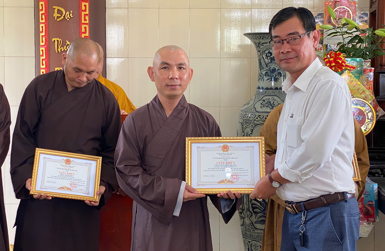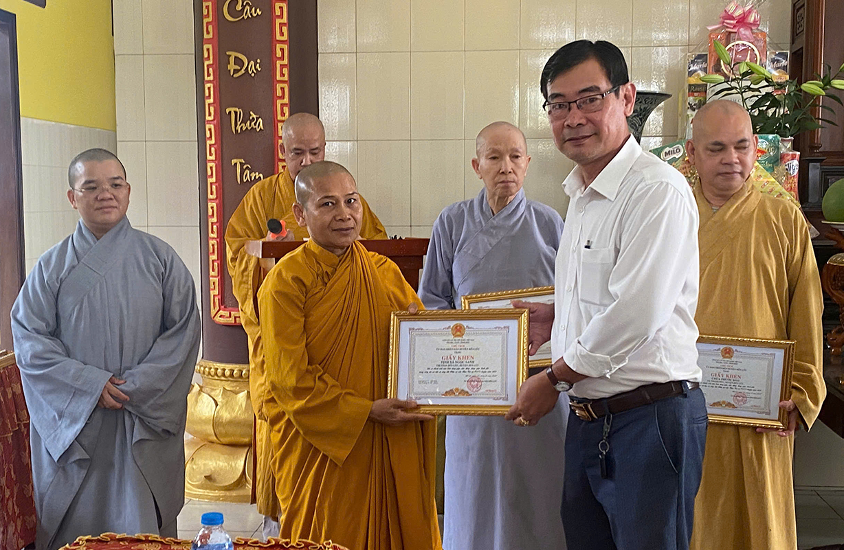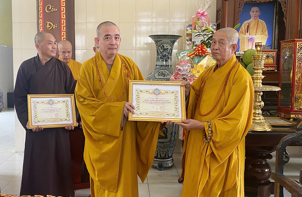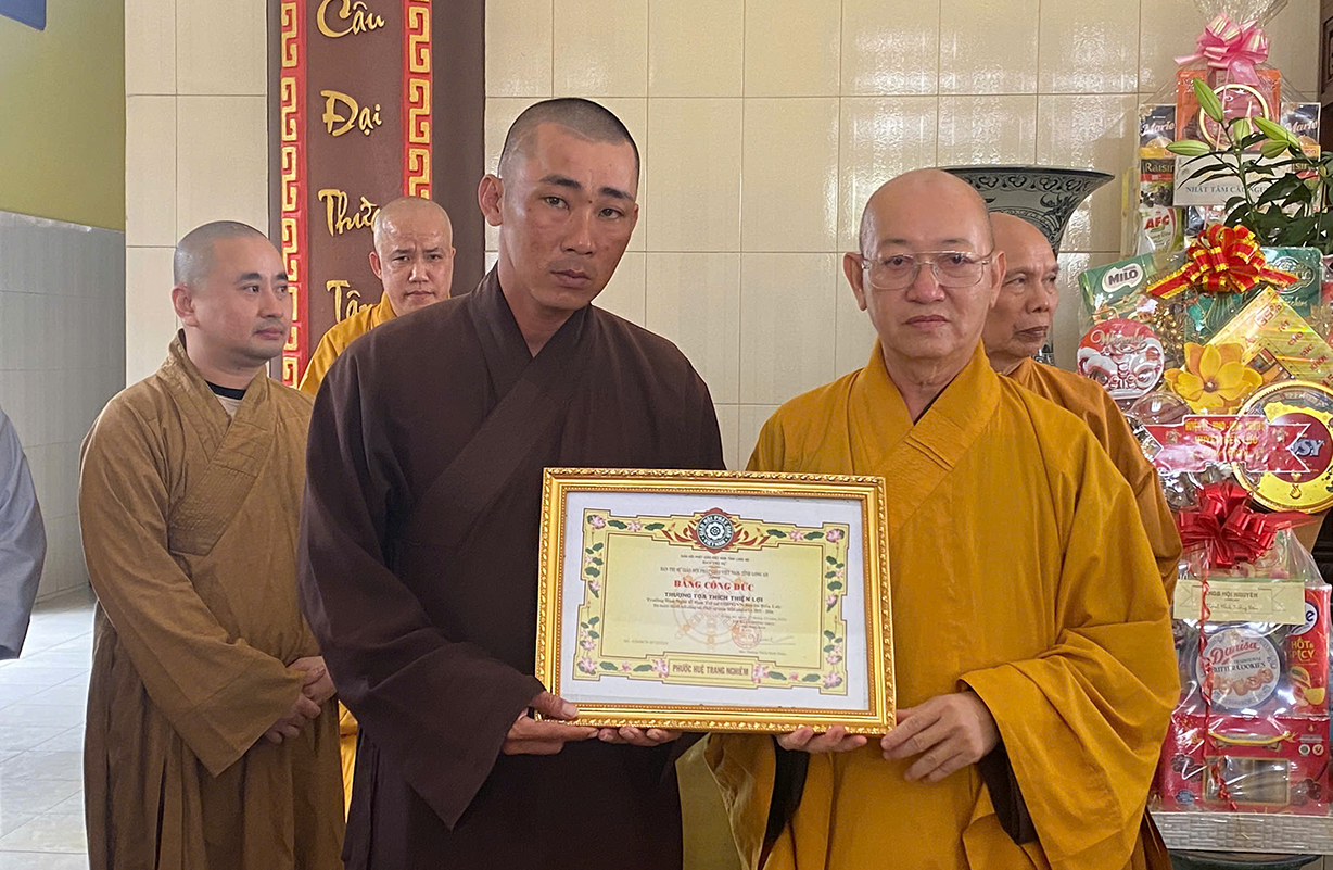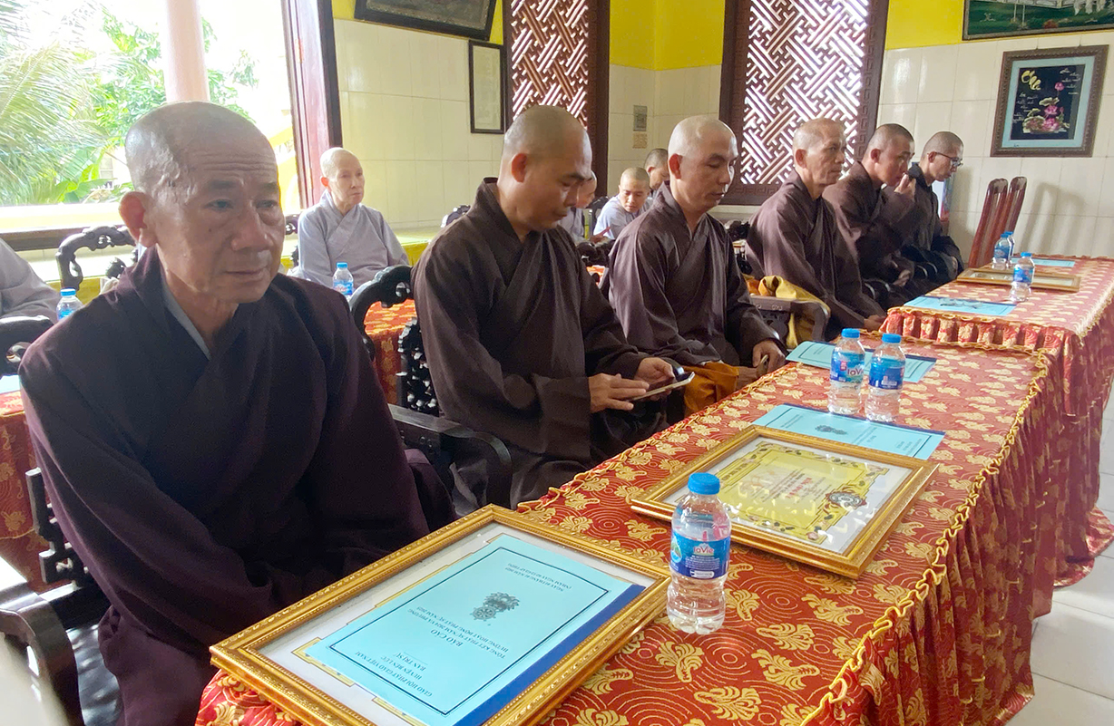 Ghi nhận đóng góp tích cực của tập thể Tăng Ni và các tự viện; ĐĐ. Thích An Nhựt – Trưởng ban Hướng dẫn Phật tử GHPGVN tỉnh Long An truyên đọc danh sách khen thưởng , BTS GHPGVN tỉnh Long An, UBND huyện Bến Lức đã trao tặng nhiều Bằng Tuyên Dương Công Đức, Bằng Công Đức và Giấy khen đến các tập thể và cá nhân tiêu biểu.