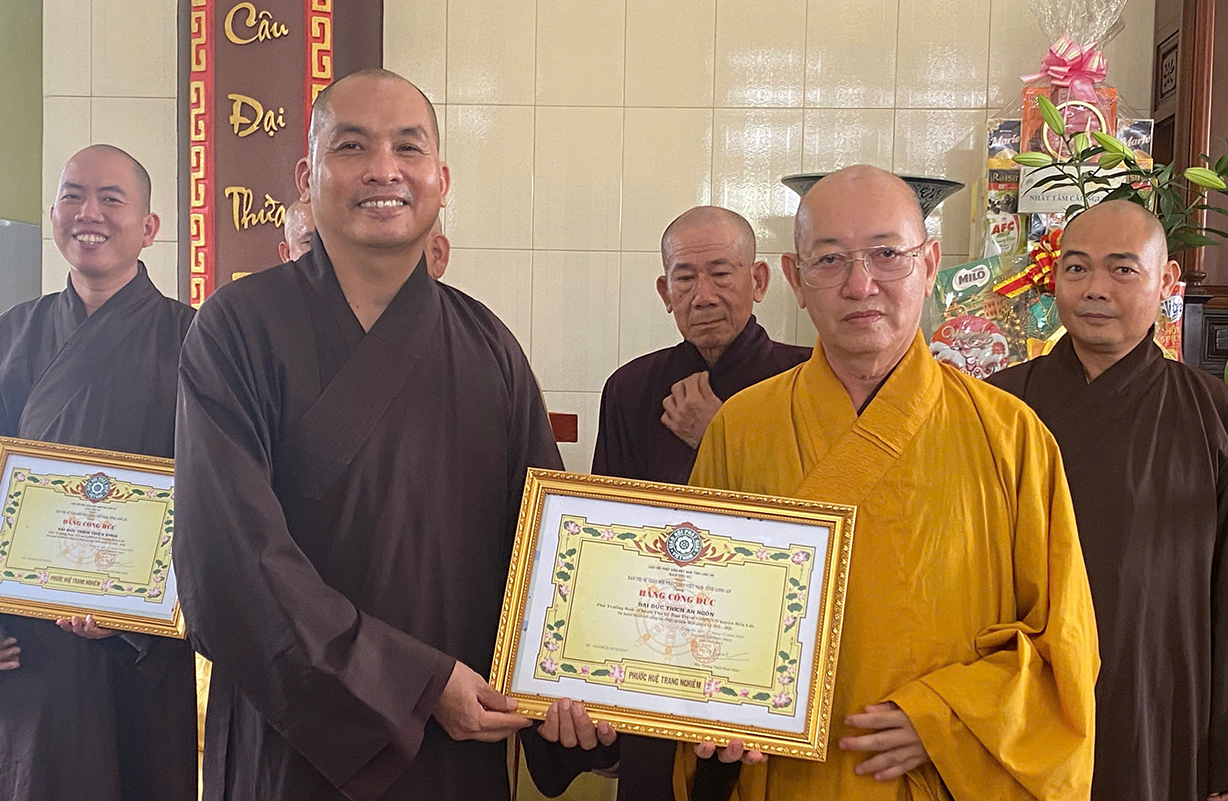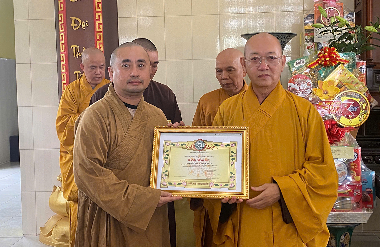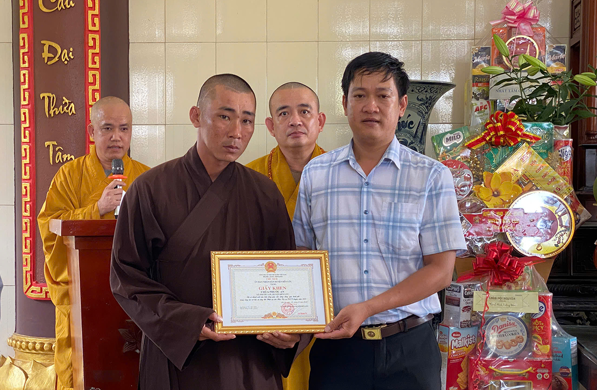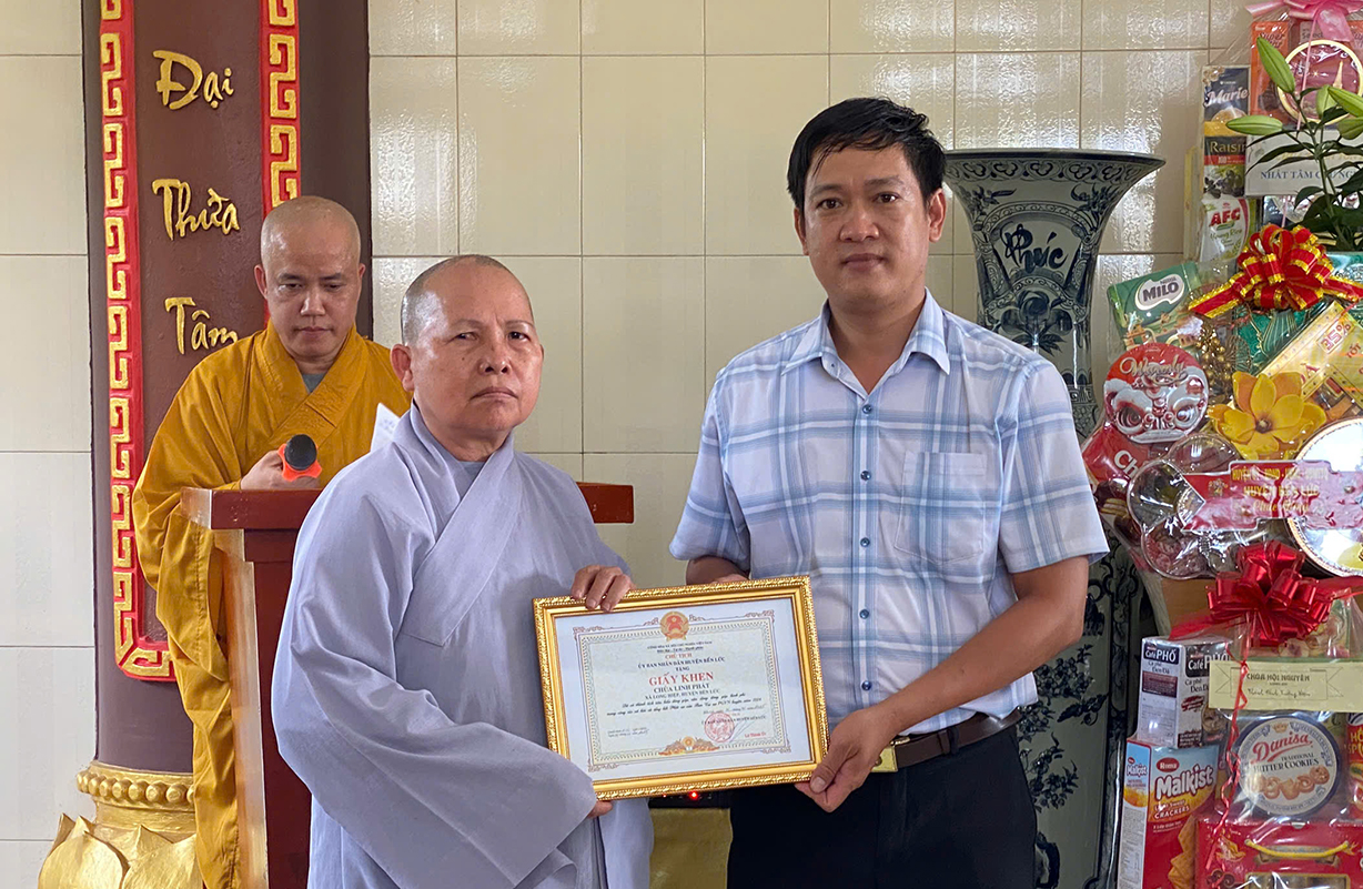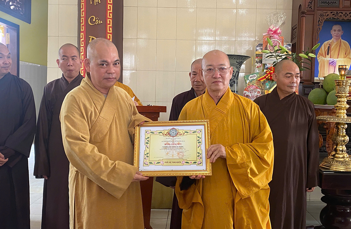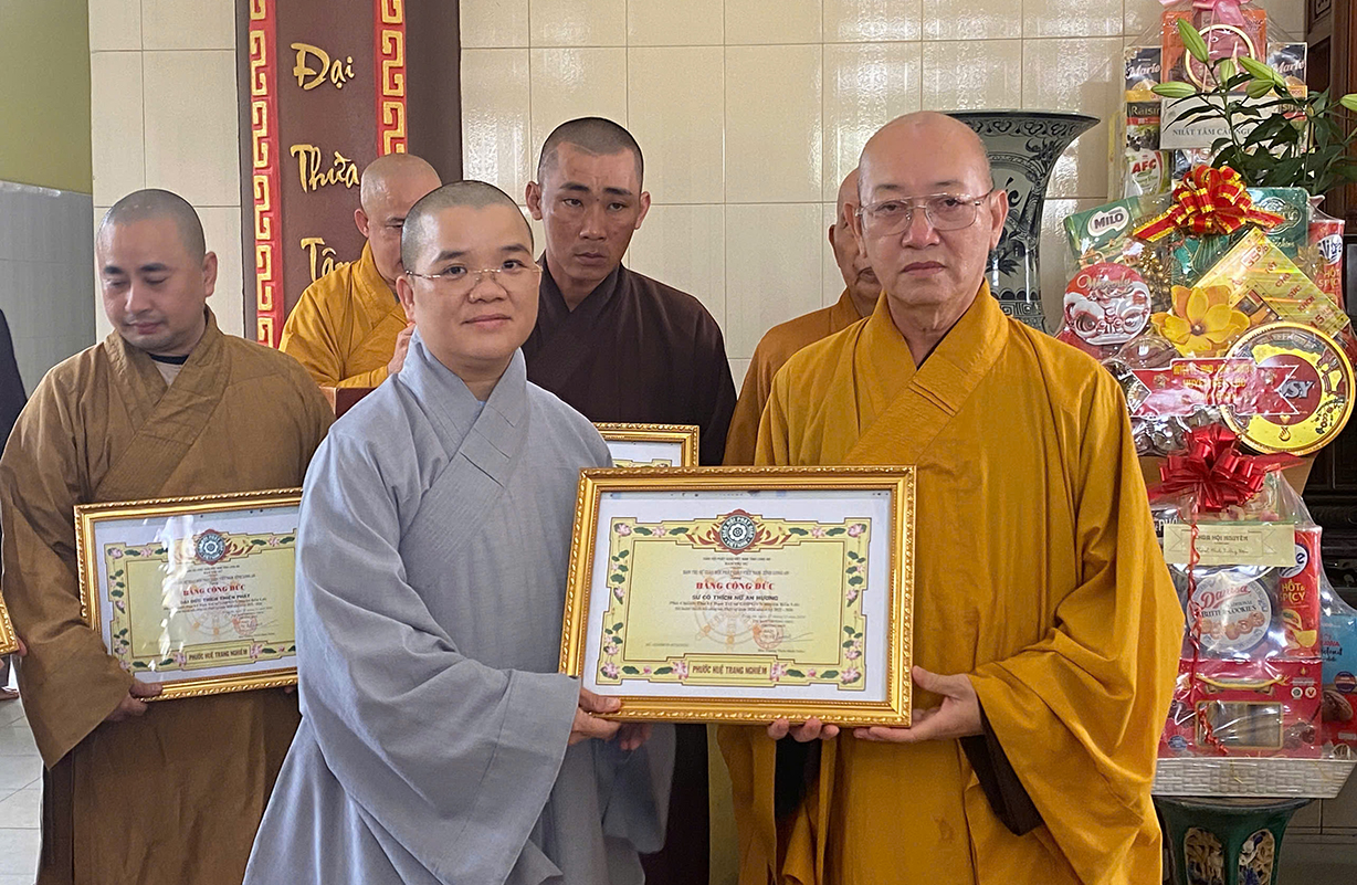 Ghi nhận đóng góp tích cực của tập thể Tăng Ni và các tự viện; ĐĐ. Thích An Nhựt – Trưởng ban Hướng dẫn Phật tử GHPGVN tỉnh Long An truyên đọc danh sách khen thưởng , BTS GHPGVN tỉnh Long An, UBND huyện Bến Lức đã trao tặng nhiều Bằng Tuyên Dương Công Đức, Bằng Công Đức và Giấy khen đến các tập thể và cá nhân tiêu biểu.