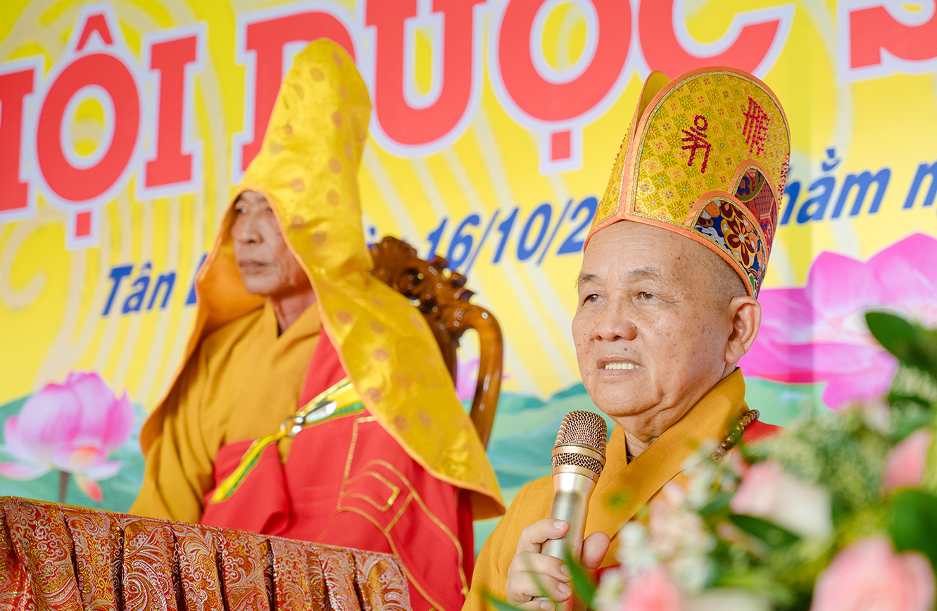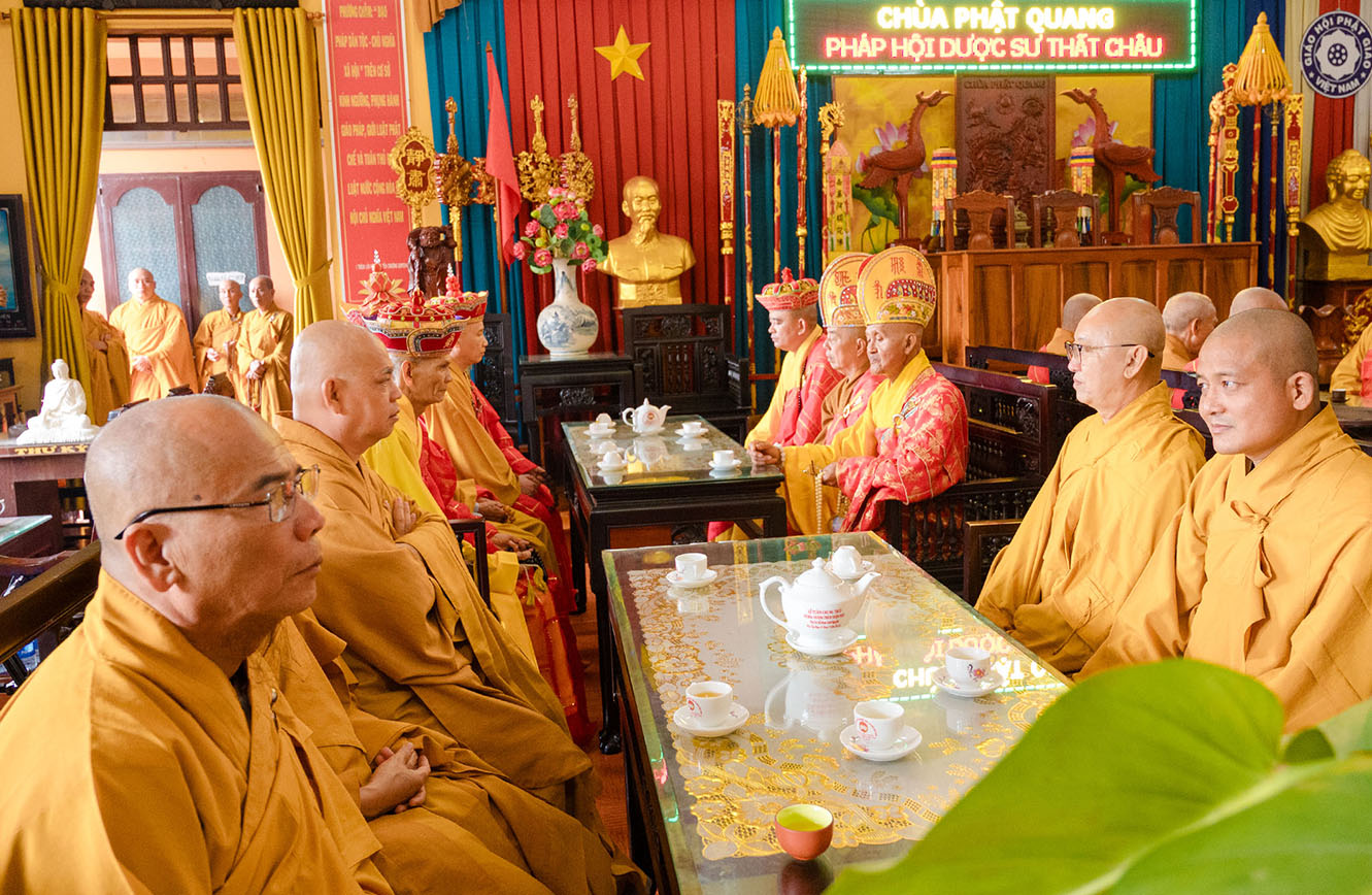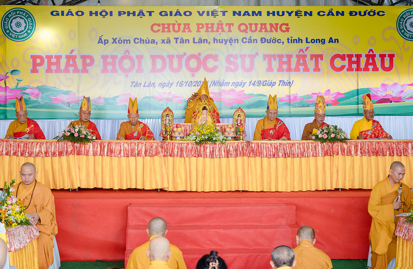 Chứng minh buổi lễ, Hòa thượng Thích Minh Thiện – UV HĐTS, Phó Trưởng Ban Hoằng pháp TƯ, Trưởng BTS GHPGVN tỉnh Long An, đã ban lời đạo từ sách tấn, Hòa thượng đã tán thán công đức của Đại đức Thích Trí Minh – Trụ trì Chùa Phật Quang cùng Phật tử đạo tràng đã nhất tâm thanh tịnh để phát tâm thiết đàn Dược Sư Thất Châu được hoàn mãn. Hòa thượng tán thán Đại đức Trụ trì đã luôn hết lòng phụng sự trong công tác Phật sự tại địa phương và cả trong tỉnh nhà, phát huy sức mạnh đoàn kết nội bộ Tăng Ni toàn huyện, xây dựng và ổn định Phật sự trong huyện để đạt được nhiều thành tựu to lớn. Đồng thời luôn luôn quan tâm, giúp đỡ các Tự viện trong huyện Cần Đước phát triển trang nghiêm trong tinh thần phụng sự Đạo pháp và Dân tộc. Cuối lời Hòa thượng đã chúc nguyện đến Đại đức Trụ trì và toàn thể hội chúng được tăng long phước thọ, pháp thể khinh an, Phật đạo viên thành.