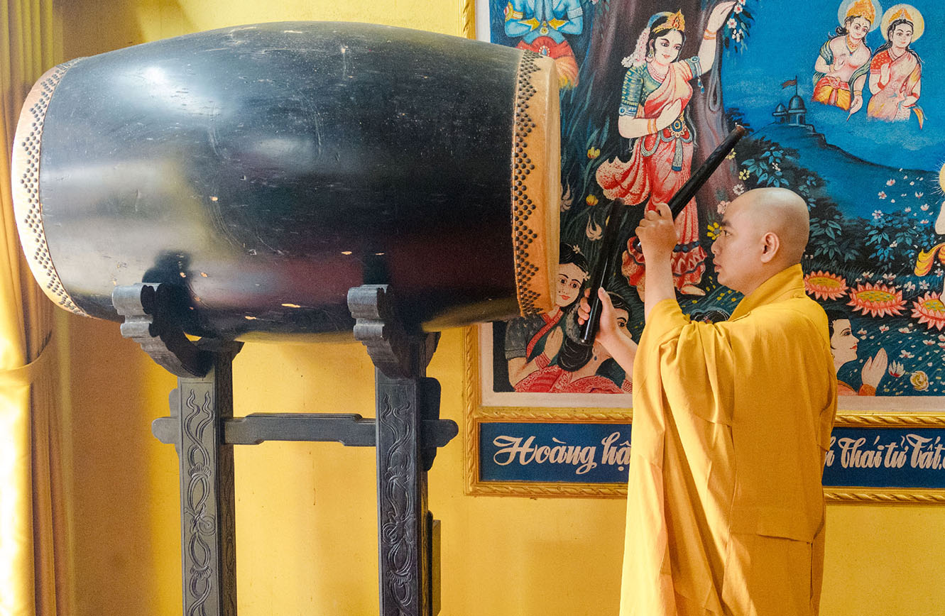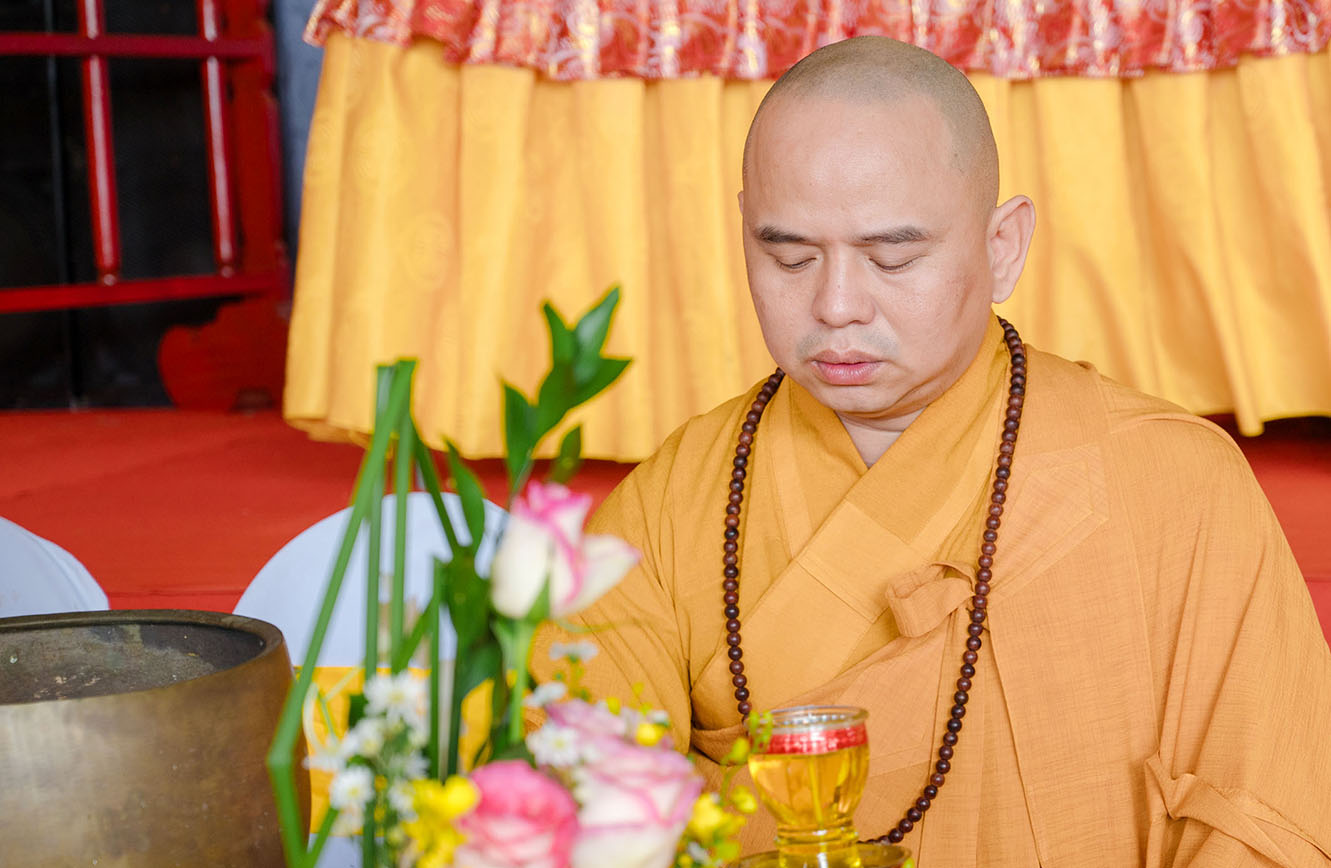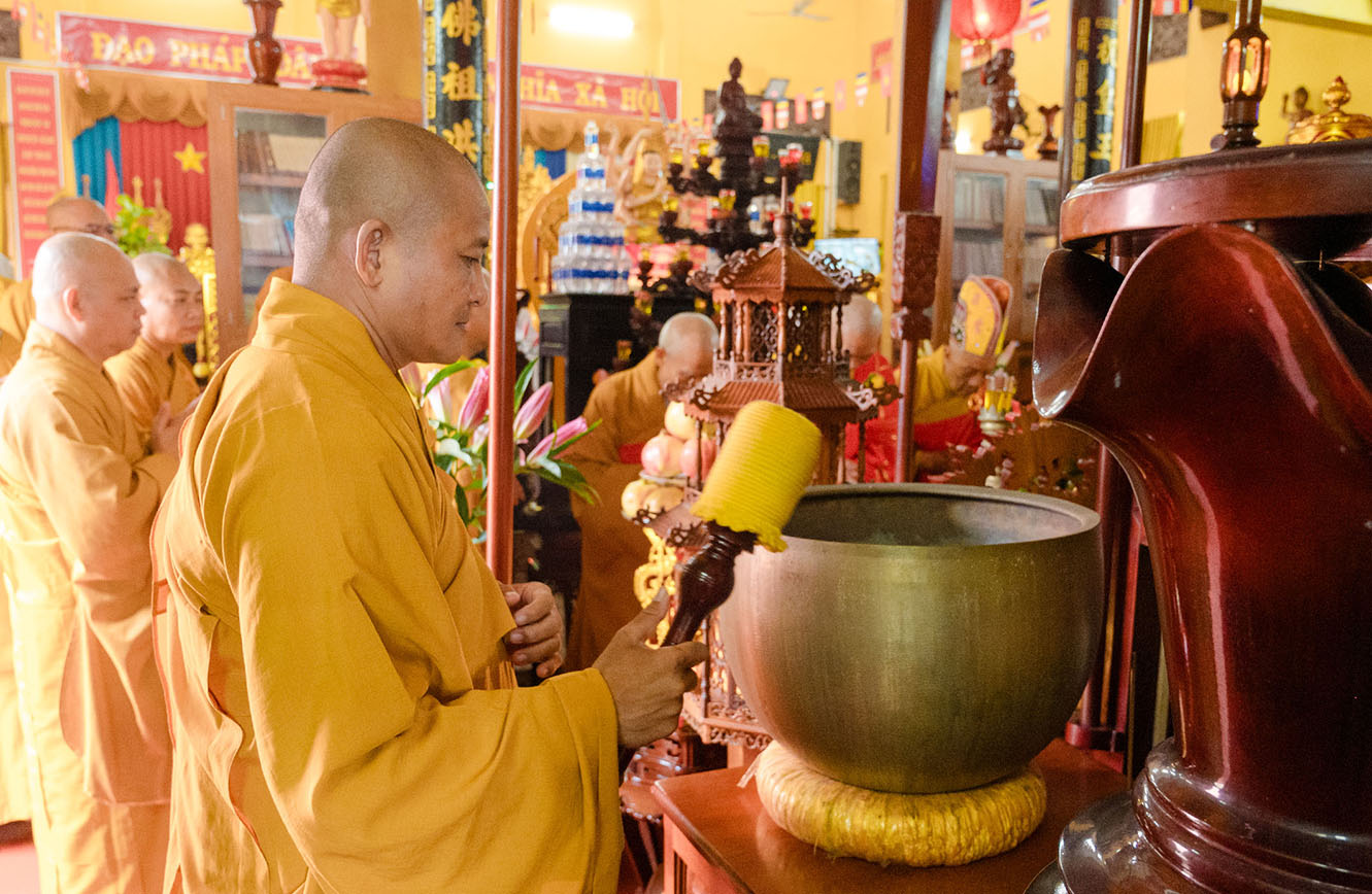 Sau khi tác pháp cung thỉnh Chư tôn đức Quang lâm để chứng minh và thực hiện nghi thức niêm hương Bạch Tổ, Đại đức Thích Nguyên Thọ – Phó Chánh Thư ký BTS GHPGVN huyện Cần Đước đã cung an chức sự Chư tôn đức trong đàn lễ, đại chúng đồng thỉnh chuông trống Bát nhã cung nghinh Tịnh đức Tăng già Quang lâm.