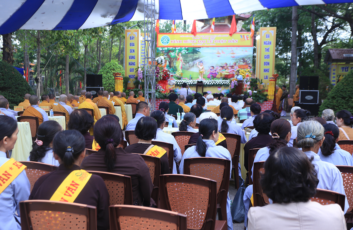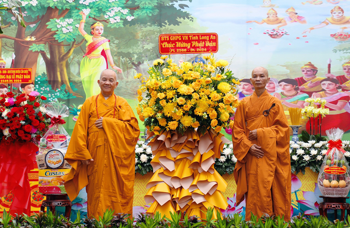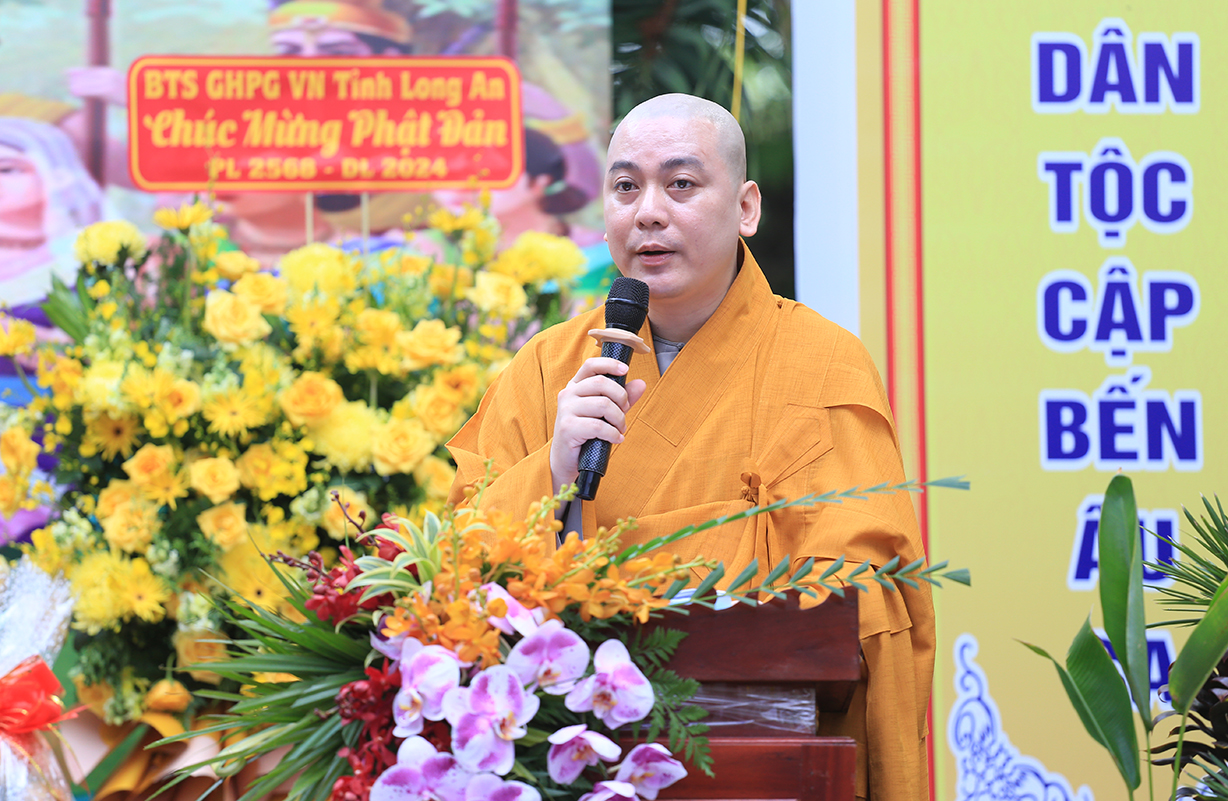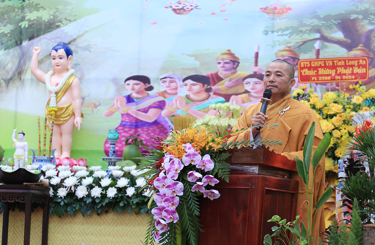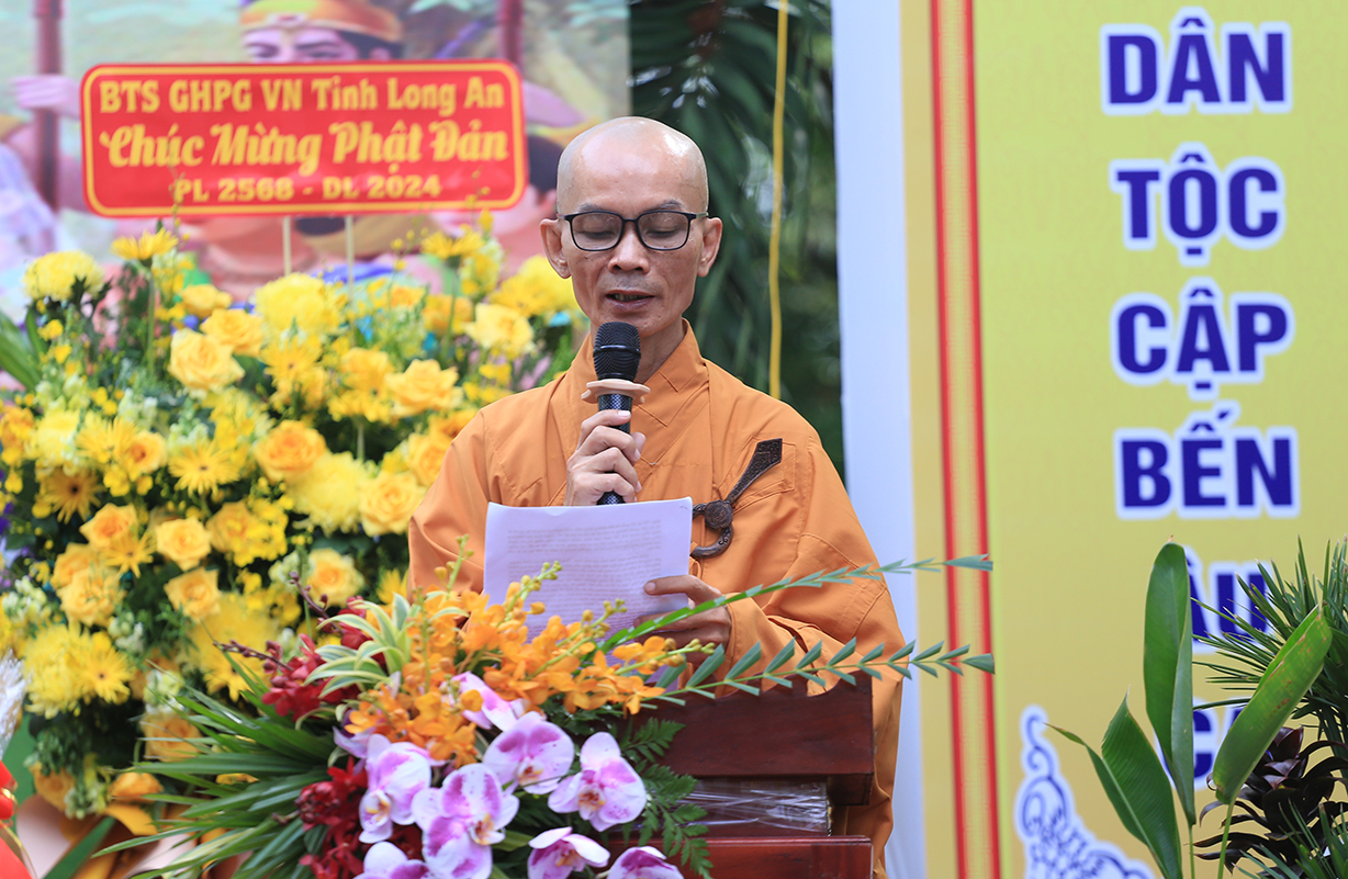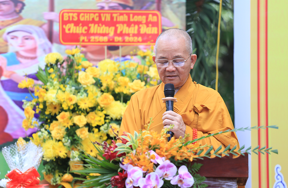 Tại buổi lễ, HT. Thích Minh Thiện – UV HĐTS, Phó ban Hoằng pháp TW, Trưởng BTS GHPGVN tỉnh Long An tuyên đọc Thông điệp Phật đản của Đại lão Hòa thượng Thích Trí Quảng – Đệ tứ Pháp chủ HĐCM TƯ GHPGVN. Theo thông điệp, Hòa thượng Pháp chủ kêu gọi chư Tăng Ni và quý Phật tử nhất tâm cầu nguyện cho chiến tranh chấm dứt, hận thù tiêu tan. Mỗi người càng tinh tấn tu tập, thể nhập Từ bi tam muội, lan tỏa tình yêu thương đến chúng sanh vạn loại, thắp sáng thế gian này bằng ánh sáng từ bi và trí tuệ. Với tất cả ý nghĩa thiêng liêng của ngày kỷ niệm Đức Phật đản sanh, tôi mong muốn tất cả người con Phật trên khắp thế giới đoàn kết, cùng cả nhân loại chung sống vị tha, kiến tạo thế giới hòa bình, an lạc.