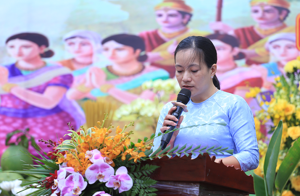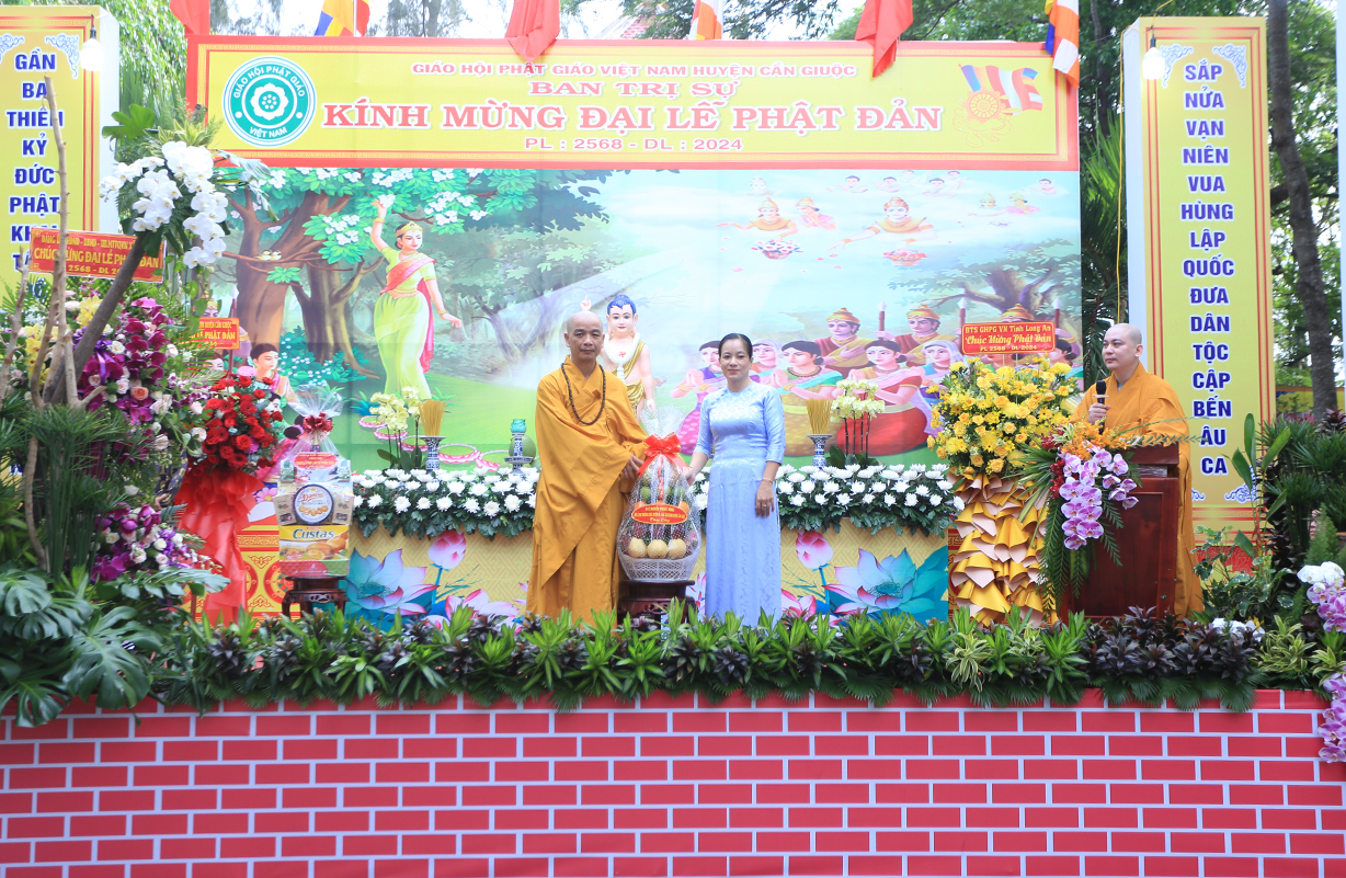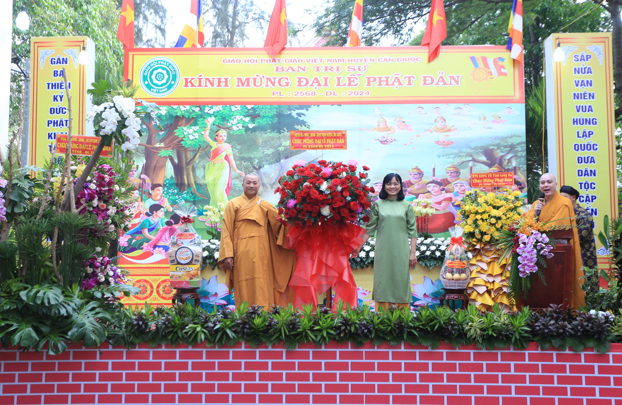 Đại diện các cấp lãnh đạo chính quyền, bà Nguyễn Thị Ngọc Duyên – Phó Chủ tịch UB MTTQVN huyện Cần Giuộc tuyên đọc thư chúc mừng Phật đản của UBMTTQVN tỉnh Long An.