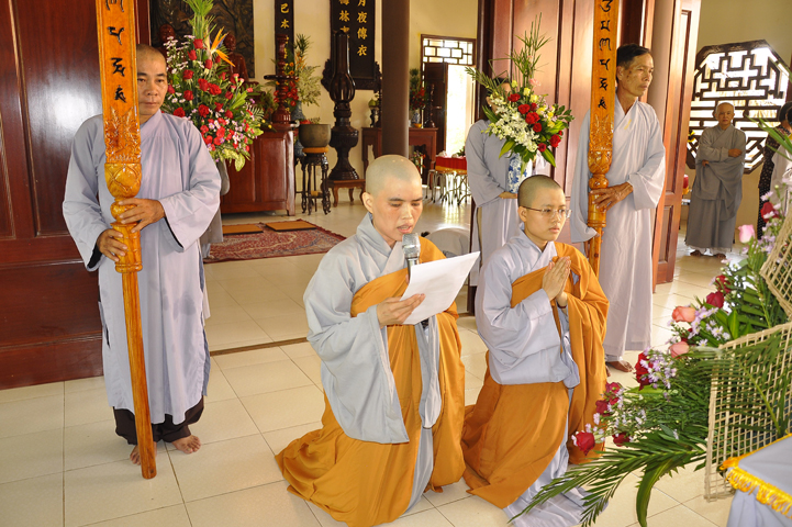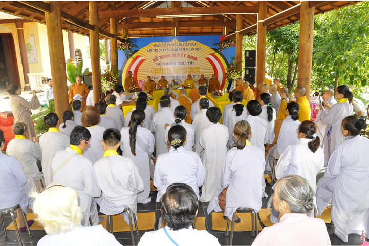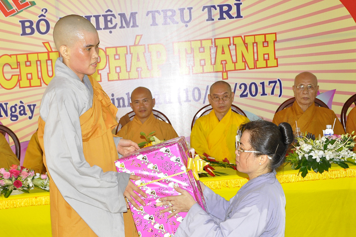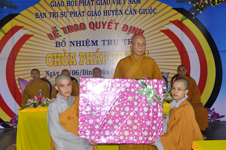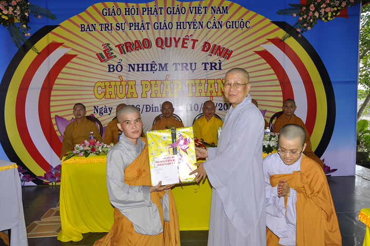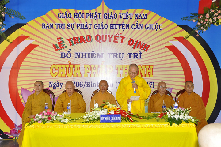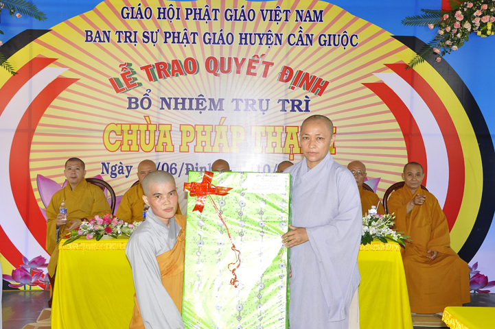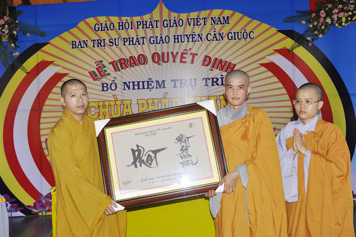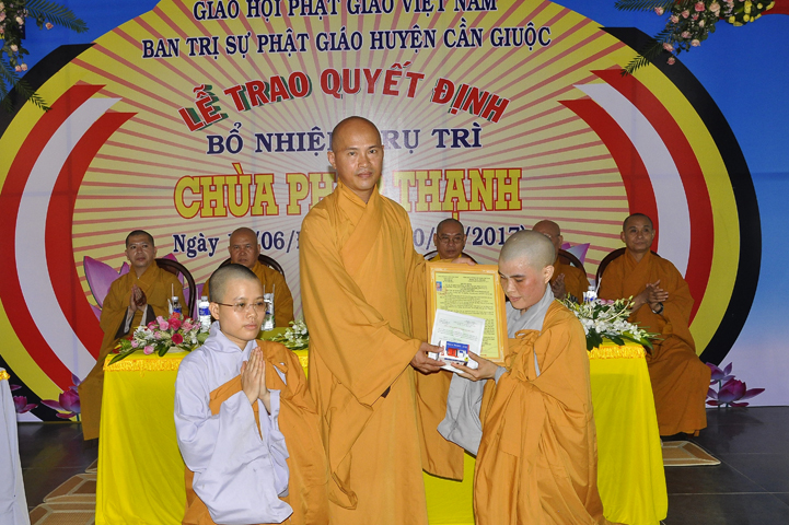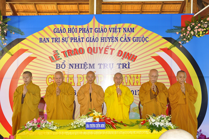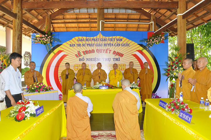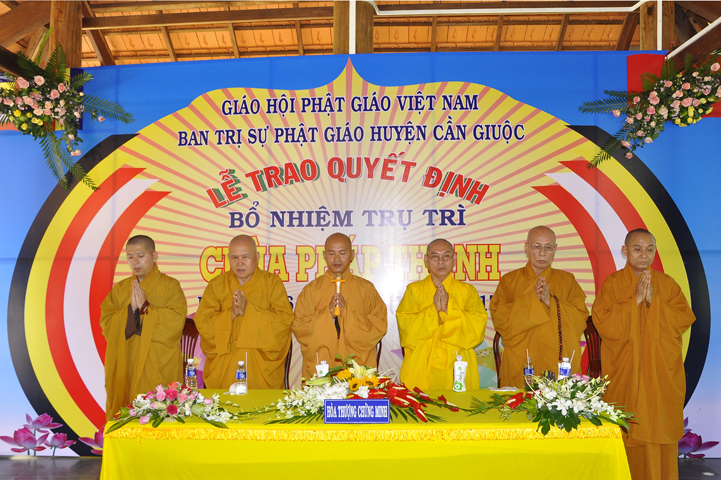 Sau nghi thức niêm Phật cầu gia hộ, tuyên bố lý do giới thiệu thành phần tham dự. ĐĐ. Thích Lệ Trí đại diện Chư tôn đức thường trực Ban trị GHPGVN tỉnh Long An tuyên đọc công bố quyết định bổ nhiệm trụ trì, trao quyết định, con dấu cho sư cô Thích Nự Định Châu thế danh Trần Thị Như Ý.