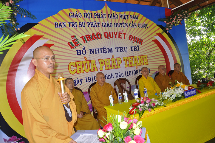 Thay mặt lãnh đạo chính quyền các cấp, ông Trần Văn Hoàng- Chủ tịch UBND xã Long Hậu đã phát biểu chúc mừng Sư cô Tân trú trì. Ông vui mừng ngôi chùa Pháp Thạnh nay đã có người chăm lo hướng dẫn Phật tử tu học. Ông nhắn nhủ đến sư cô trụ trì bảo vệ động sản và bất động sản, hướng dẫn Phật tu tập tốt đúng với hiến chương Giáo hội Phật giáo Việt Nam và luật pháp nhà nước định định. Ông nói sẻ tạo mọi điều kiện thuận lợi cho sư cô tân tru trì và quý Phật tử phát triển ngôi Tam bảo Pháp Thạnh và mong rằng Sư cô phát huy đạo hạnh, đoàn kết hoà hợp tốt trong mọi Phật sự, hướng dẫn Phật tử tu học đúng Chánh pháp, đúng phương châm “Đạo Pháp – Dân Tộc – XHCN”.
