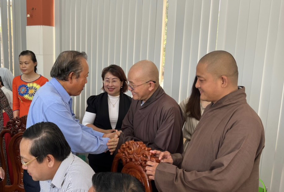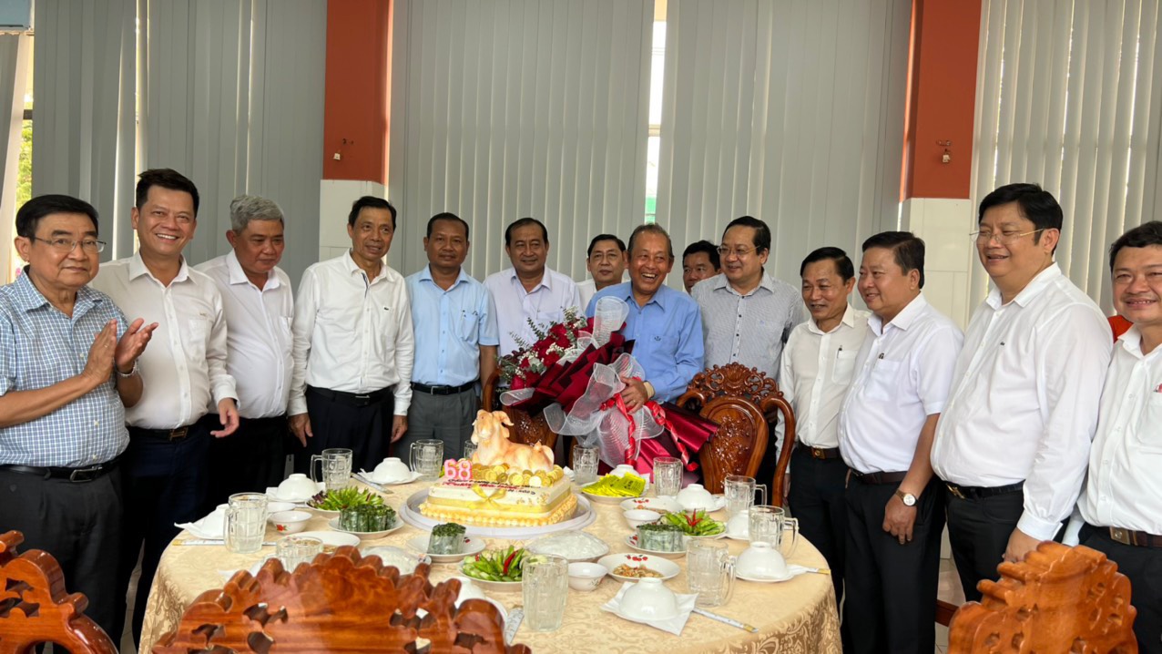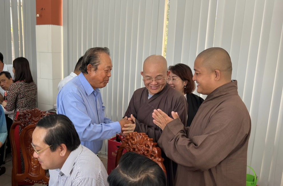 Sau Lễ Khánh thành cầu, Hòa thượng Trưởng ban Trị sự GHPGVN tỉnh cùng chư Tôn đức trong Ban Thường trực quang lâm hội trường chúc thọ lục thập bát tuế đến Ngài Trương Hòa Bình – Nguyên Ủy viên Bộ Chính trị, nguyên Phó Thủ tướng Thường trực Chính phủ.