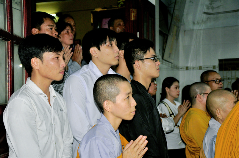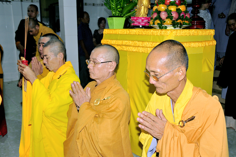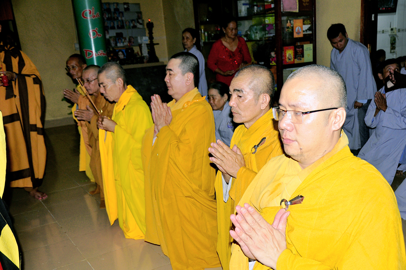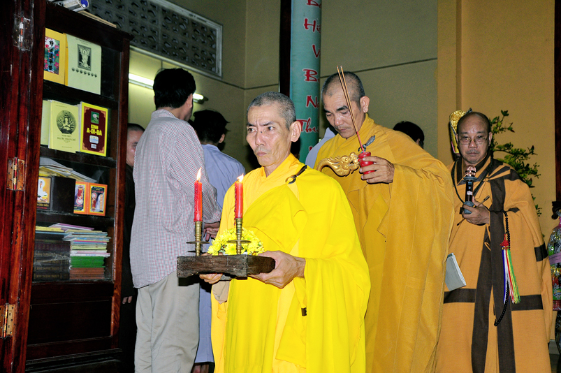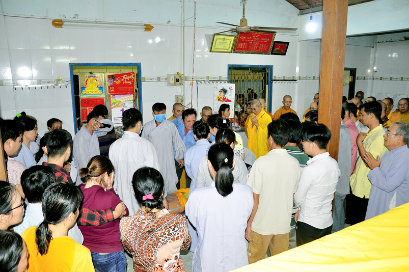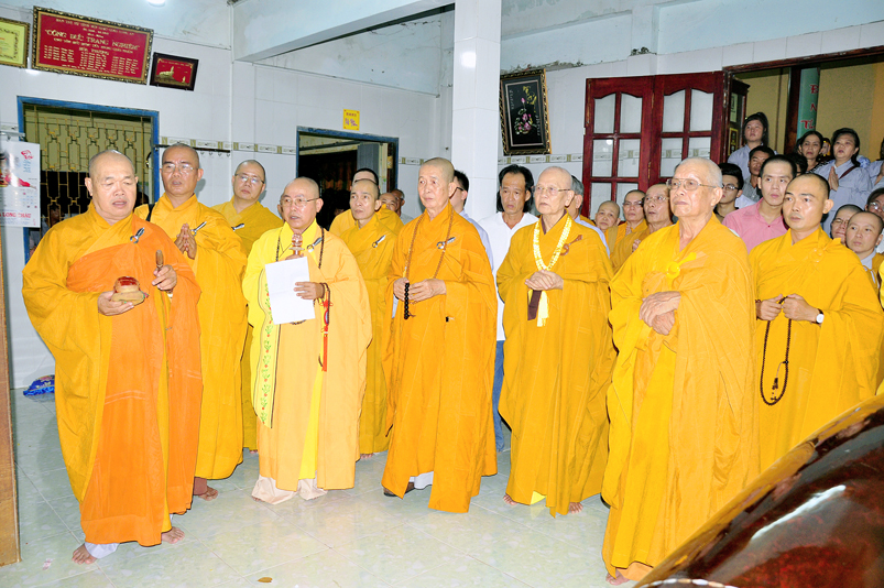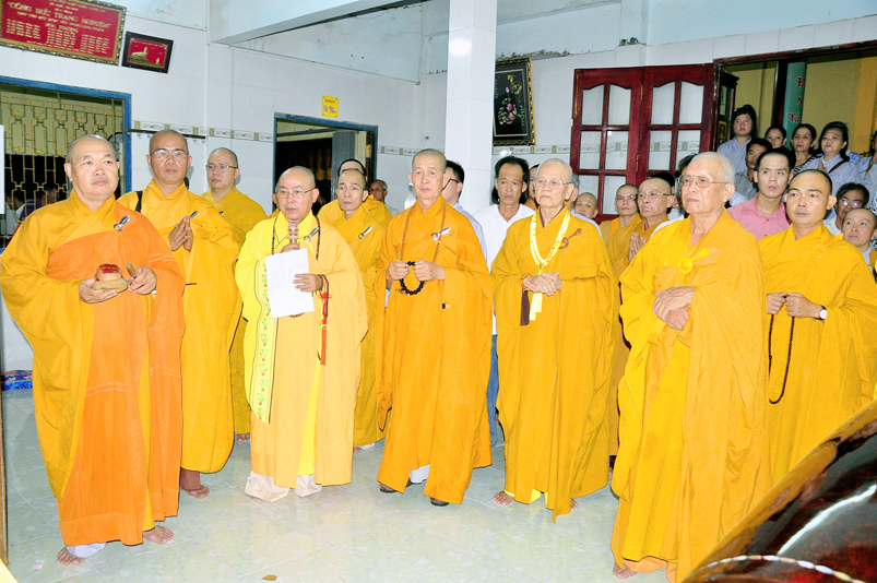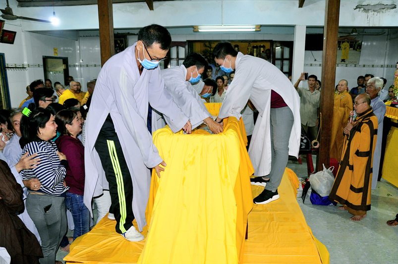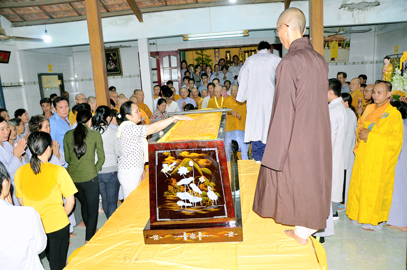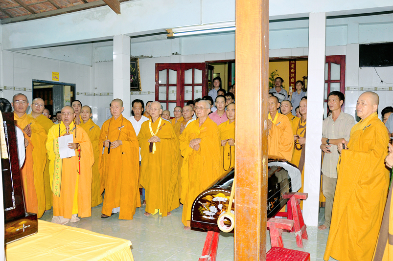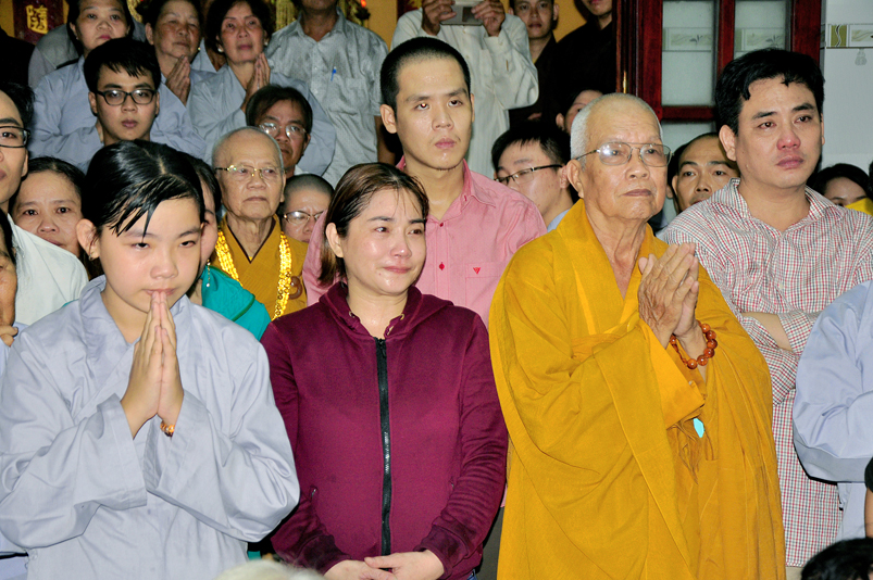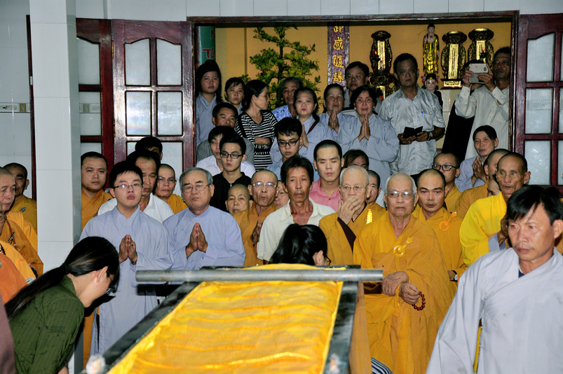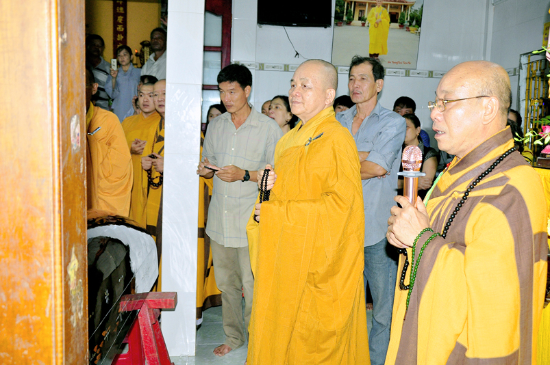 Toàn thể Chư tôn đức Giáo phẩm, Tăng Ni và Phật tử đã đồng thanh niệm Phật hòa cùng tiếng chuông trống Bát-nhã trầm hùng khi nhục thân của cố Hòa thượng được Chư tăng cung thỉnh nhập kim quan tại tổ đường.