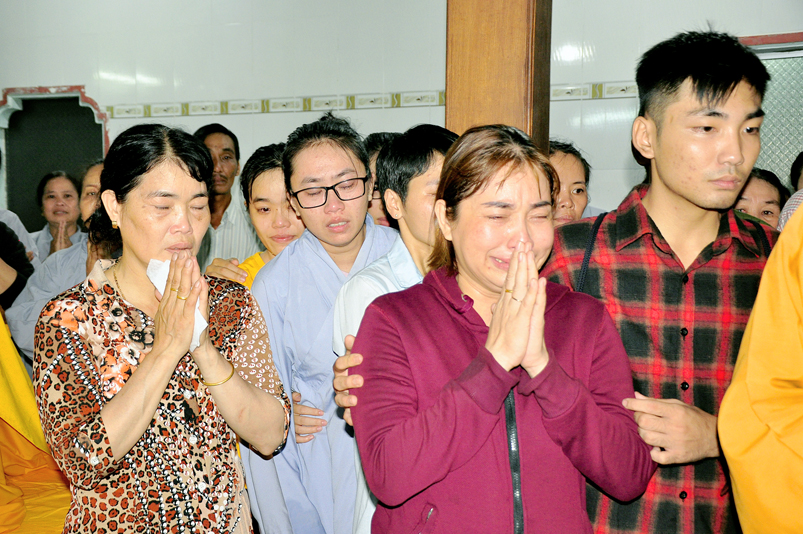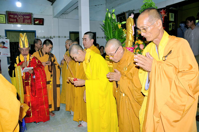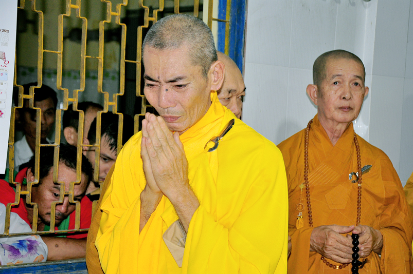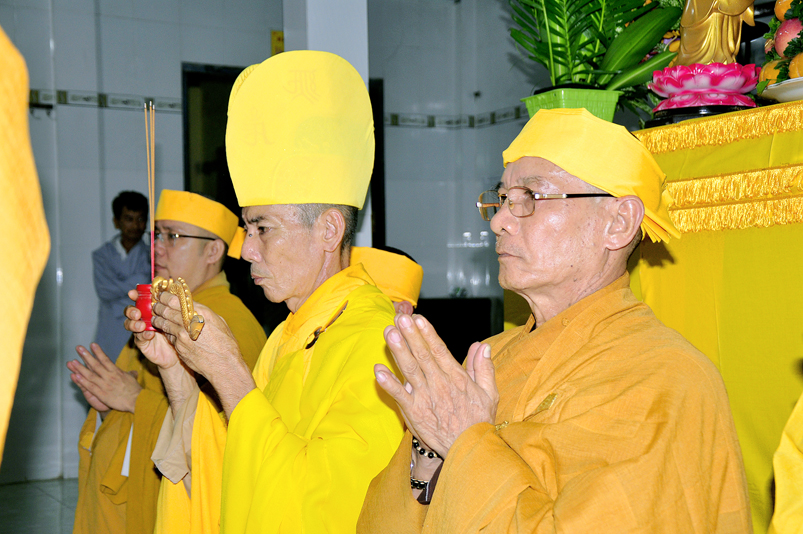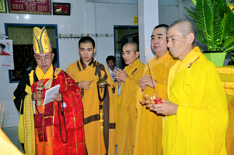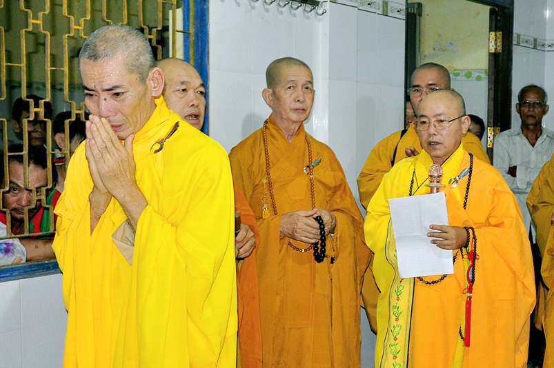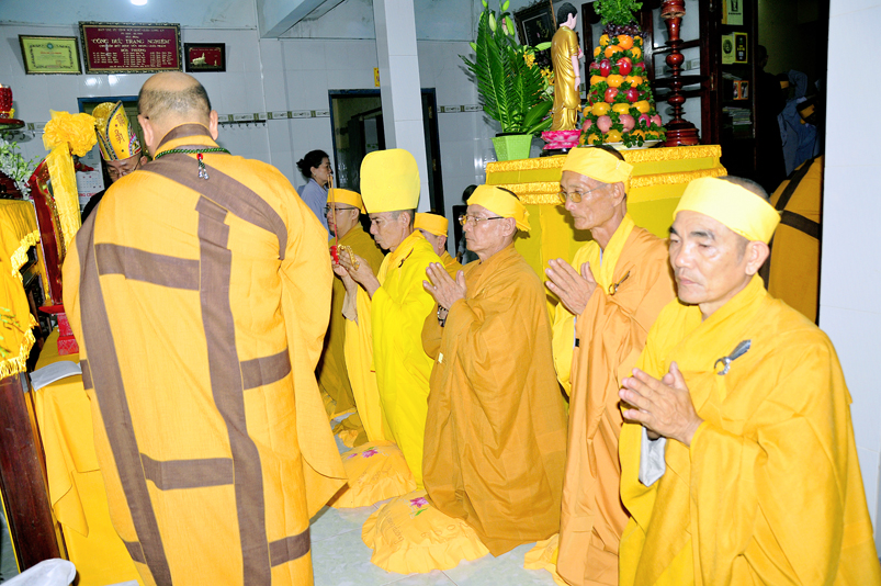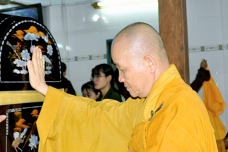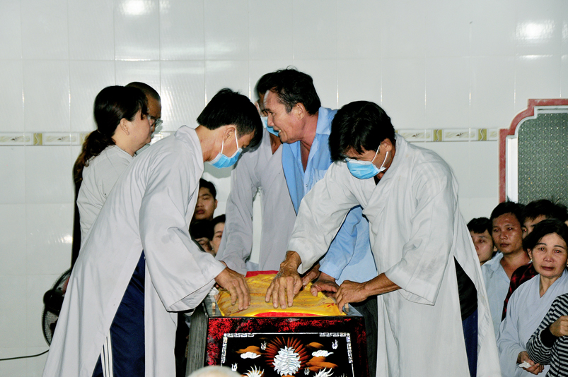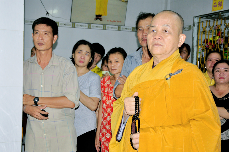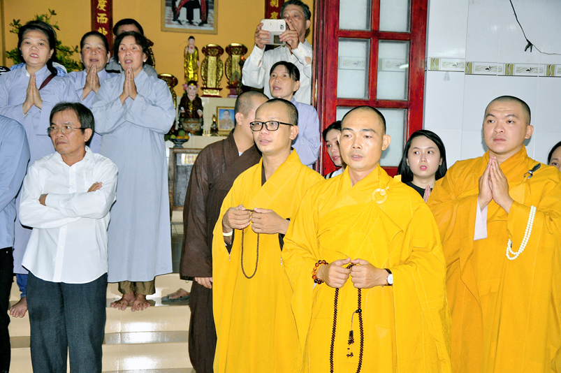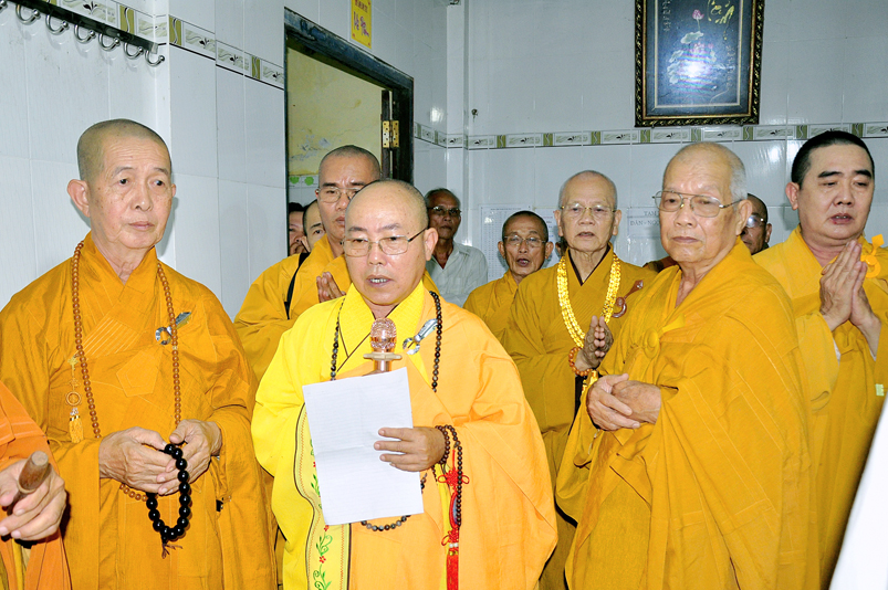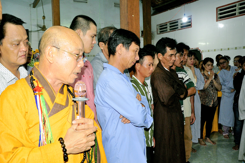 Toàn thể Chư tôn đức Giáo phẩm, Tăng Ni và Phật tử đã đồng thanh niệm Phật hòa cùng tiếng chuông trống Bát-nhã trầm hùng khi nhục thân của cố Hòa thượng được Chư tăng cung thỉnh nhập kim quan tại tổ đường.
