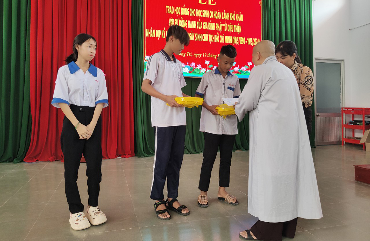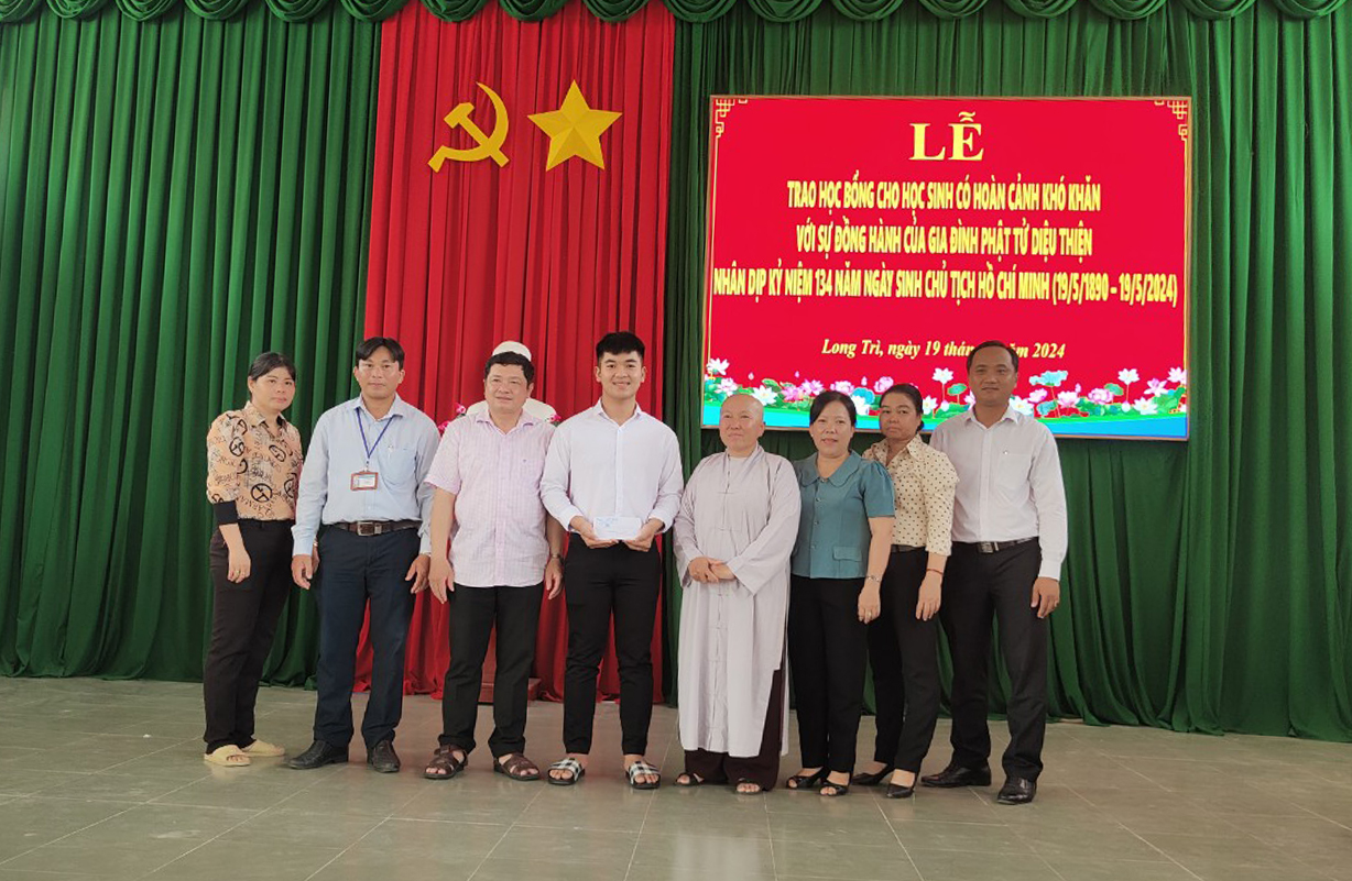 Được biết buổi Lễ trao tặng học bổng cho các em sinh viên học sinh có hoàn cảnh khó khăn lần nầy là tâm nguyện của người đệ tử Phật vì sứ mạng phụng sự Tam Bảo, phụng sự chúng sanh của hàng đệ tử xuất gia và tại gia nhất là trong những ngày Đại Lễ trọng đại của Phật giáo và hôm nay trong không khí cả nước đón mừng ngày Phật Đản Sanh và hân hoan mừng 134 năm kỷ niệm ngày sinh của Bác Hồ, ước mong các em học sinh sẽ trở thành người con ngoan, trò giỏi, hữu dụng cho gia đình và xã hội mai sau như lời phát biểu của Ni sư Diệu Huệ khi gửi gắm đến các bạn trẻ, thế hệ tương lai của đất nước và lời động viên chí tình chí thiết của Ông Hà Minh Tuấn thay mặt lãnh đạo chánh quyền mong các em sinh viên học sinh dù hoàn cảnh nào cũng cố gắng học giỏi, có kiến thức để mai sau vững bước trên cuộc đời và khẳng định sự quan tâm của các cấp lãnh đạo từ huyện đến xã sẽ tạo điều kiện cho các em được yên tâm cắp sách đến trường. Ông cũng gửi lời cảm ơn đến gia đình Phật tử Diệu Thiện cùng em gái Ngọc Tuyền năm 2023 có góp phần ủng hộ xây dựng cầu nông thôn tại xã Long Trì và thay mặt chánh quyền Ông Hà Minh Tuấn cũng cảm ơn đến Phật giáo huyện Châu Thành luôn đóng góp vào công tác an sinh của xã hội, giúp nhân dân địa phương trong việc từ thiện từ xưa tới nay./.