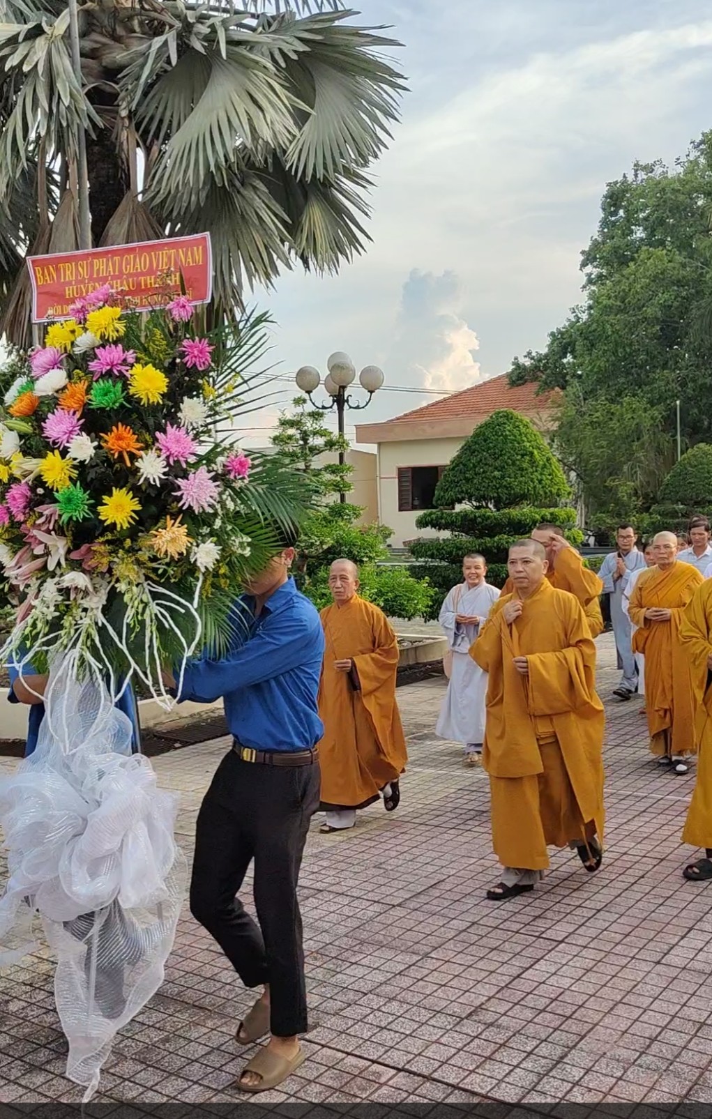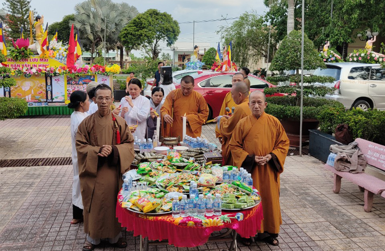 Từ sáng đã thấy hình bóng hàng Tu sĩ Phật giáo đến tại nghĩa trang để cắm hoa và bài trí cúng kính tại Đền thờ và ngay Đài Tổ Quốc Ghi Công. Đại đức Phó thường trực Thích Thiện Danh đại lao cho Đại đức Trưởng Ban Thích Huệ Quang sau khi kiểm tra công tác chuẩn bị Đại Lễ Phật Đản diễn ra vào ngày 13/4 âm lịch tại Lễ Đài chính của Phật giáo huyện đặt tại Chùa Thiên Long, đoàn xe Hoa Phật Đản cùng Tăng Ni Phật giáo huyện Châu Thành tiến về Nghĩa trang để Tăng Ni kịp thời thắp hương tưởng niệm đến các Anh Linh Liệt Sĩ đã ngã xuống cho đất nước nỡ hoa Độc Lập, kết quả Tự Do .