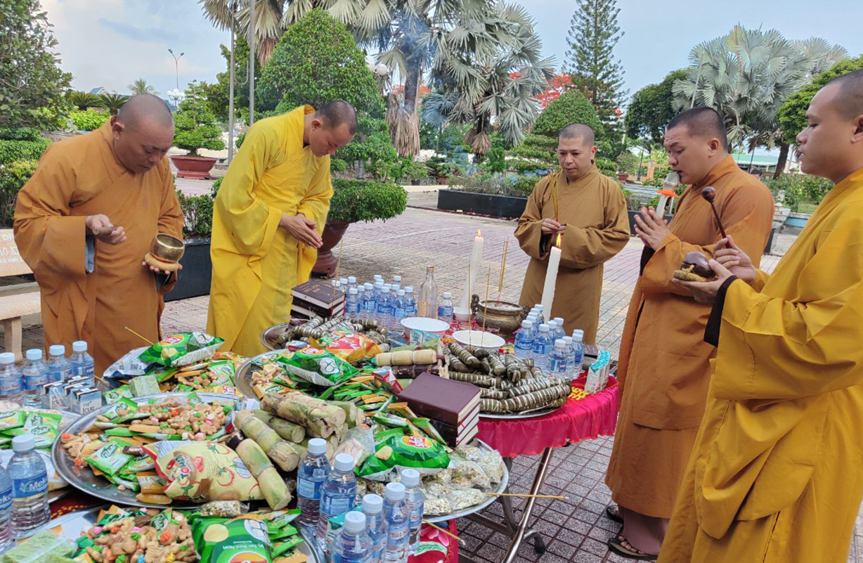 Tại đây, phái đoàn Phật giáo Châu Thành cùng với Quý Phật tử và thân nhân của các Anh hùng liệt sĩ với sự dẫn đầu của Đại Đức Thiện Danh đã đến dâng hoa và thắp hương tại Đài Tổ Quốc Ghi Công, lời trống hùng thiêng vang lên hòa cùng lời Tưởng Niệm, lời Kinh của Ban Nghi Lễ Phật Giáo tại Đền Liệt Sĩ trong Thời Khóa Mông Sơn Thí Thực như lời tri ân các Anh, các Chị, các Cô, các Chú đã ngã xuống vì nước quên thân, vì dân quên mình. Mảnh hình hài các Anh đã hòa quyện cùng hồn thiêng sông núi để Dân tộc đời đời nhớ ơn.