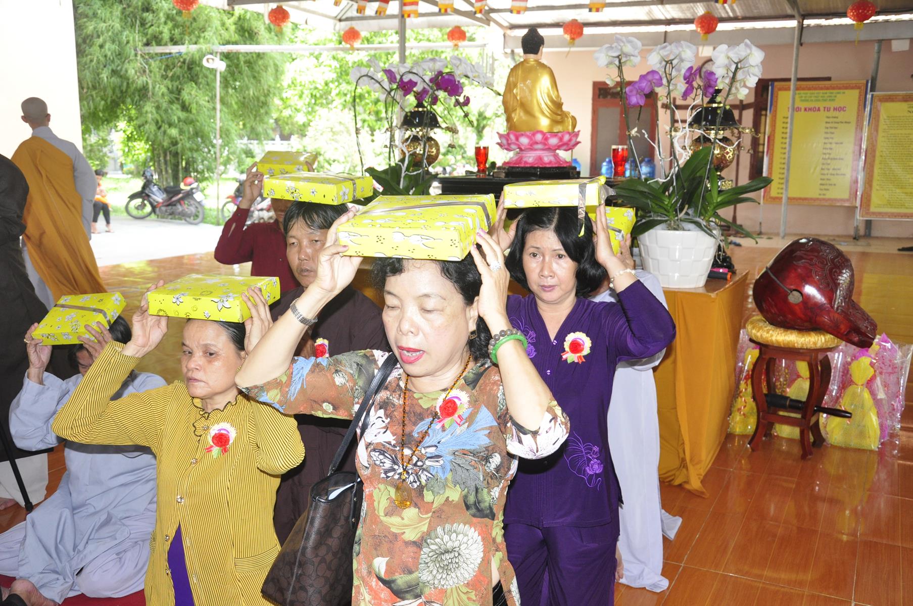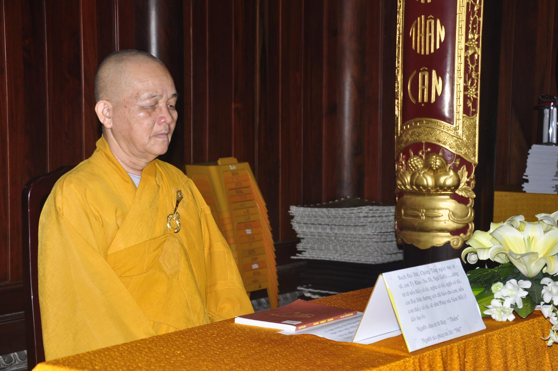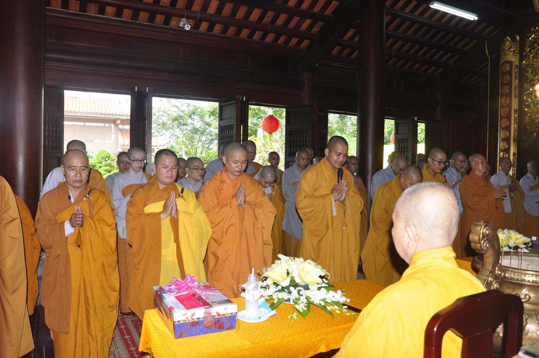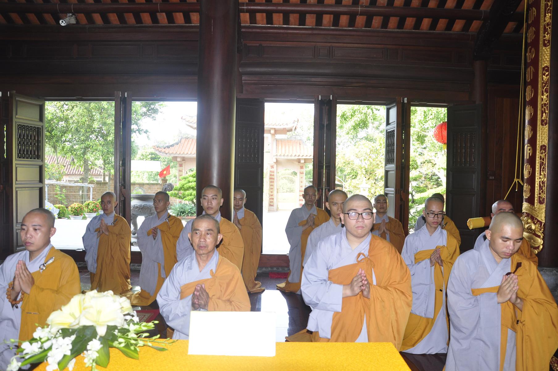 Vào lúc 09 giờ, Ban Tổ chức cung thỉnh Chư Tôn đức quang lâm chứng minh Đại lễ Vu lan-Báo hiếu, cài hoa hồng tưởng nhớ tứ trọng ân và dâng pháp y ca sa.