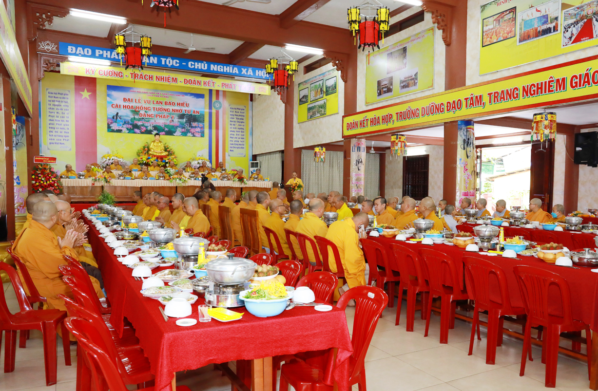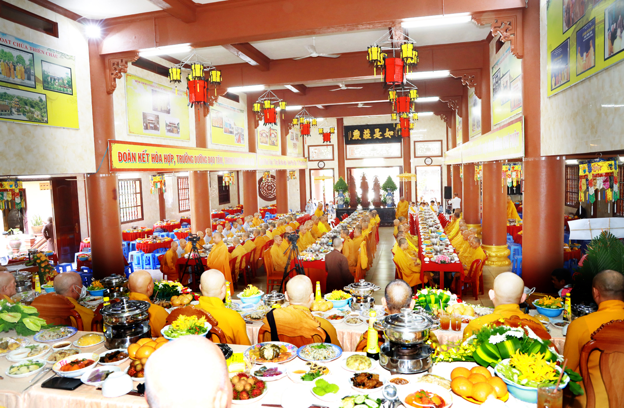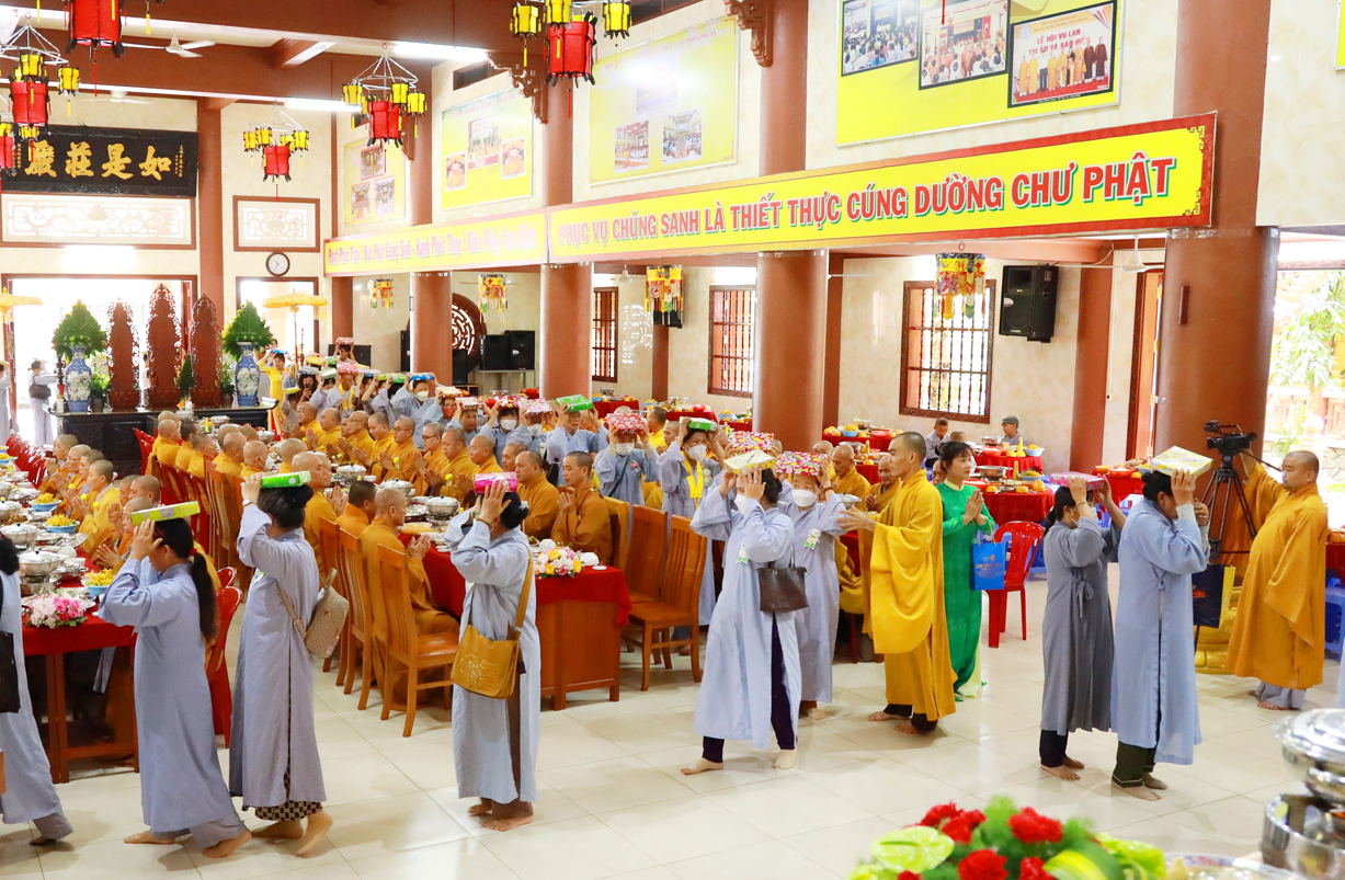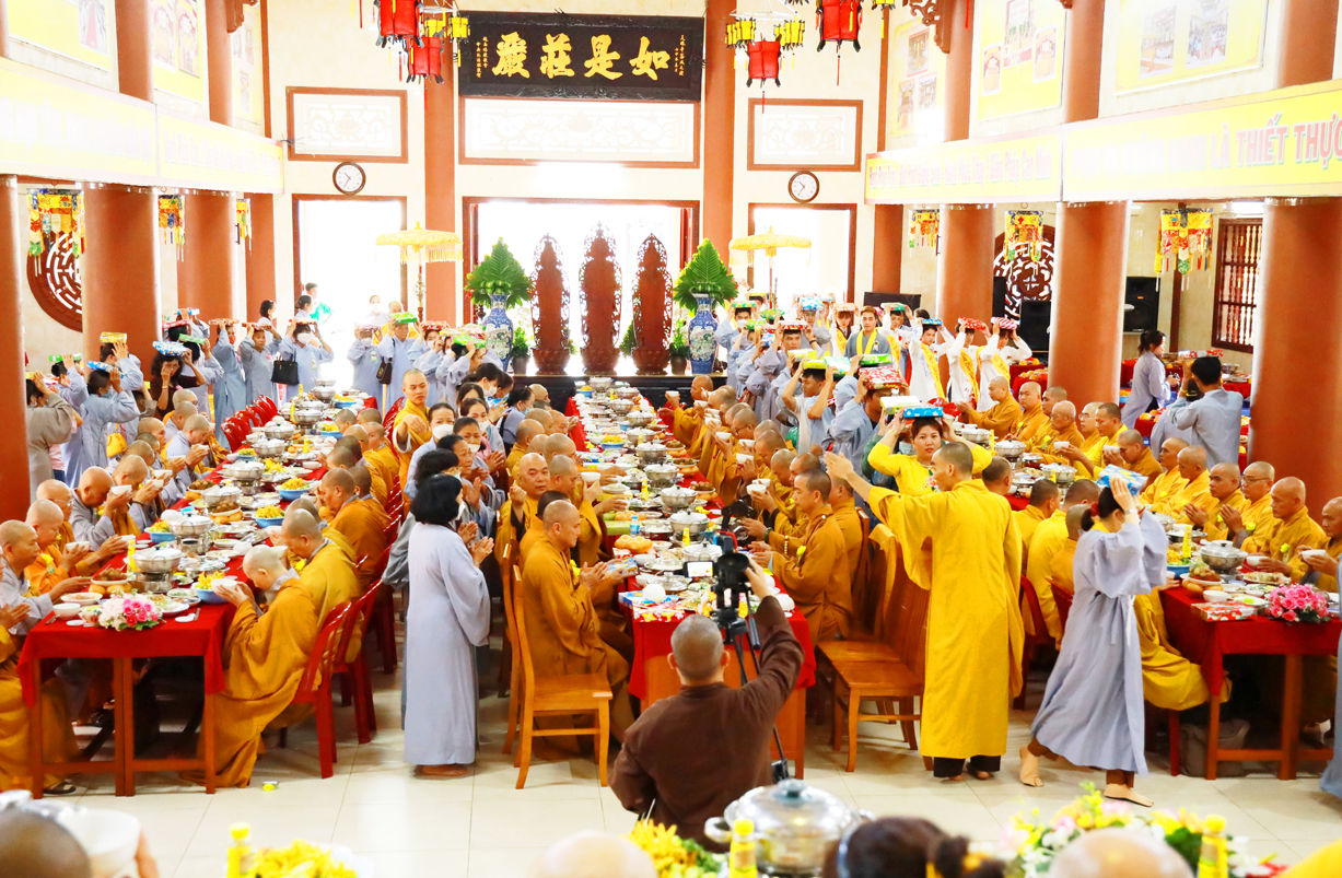 Đại lao chư tôn đức chứng minh, Hòa thượng Thích Minh Thiện có lời đạo từ tại buổi lễ. Đầu tiên, Hòa thượng nói về duyên khởi ngày chư Tăng thọ tuế theo Kinh Tự Tứ, thuộc Tăng Nhất A-hàm. Vào thời đức Phật, vào ngày trăng tròn đức Thế Tôn đã báo ngày A Nan kích kiền chùy để báo chư Tăng hôm nay Đức Thế Tôn muốn thọ tuế, tự tứ. Sau khi đại chúng tập trung, Đức Thế Tôn đã hỏi Ngài Xá Lợi Phất và chư Tăng trong suốt ba tháng An cư Kiết hạ, qua sự diễn giải chánh pháp, qua những hành xử nơi thân khẩu ý của Ngài, đại Tăng có điều chi cảm thấy hiềm trách thì nói lên để những sai phạm được đầy đủ kiến văn nghi. Xá Lợi Phất thay chư Tăng trình bạch: Thân khẩu ý của Ngài là bất thất, Ngài là Đại giác ngộ. Ngài Xá Lợi Phất lại trình bạch Thế Tôn: Nếu bản thân con qua thấy, nghe, nghi mà có tội thì con sẽ sám hối. Ngài tiếp tục thay chư Tăng bạch như thế. Đức Phật khen ngợi Ngài Xá Lợi Phất và Đại Tăng không có tội, đại chúng thanh tịnh. Với sự thanh tịnh ấy tạo thành một uy đức lớn lao, giúp tăng trưởng đạo nghiệp. Hòa thượng nói về duyên khởi Ngài Đại Hiếu Mục Kiền Liên cứu mẹ nương nơi uy đức Phật và Đại Tăng. Nhờ công đức cúng dường và sức chú nguyện của chư Tăng mà mẹ Ngài phát lòng kính tin Tam bảo, phát khởi lòng hỷ xả, hoan hỷ, do vậy mà được siêu sanh về cảnh giới chư Thiên. Hòa thượng nhắc nhờ hàng Phật tử hãy sống theo lời Phật dạy, tin sâu nhân quả, chánh tín Phật giáo và sống trong sự từ bi và trí tuệ của đạo Phật.
