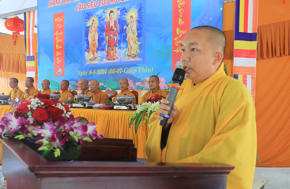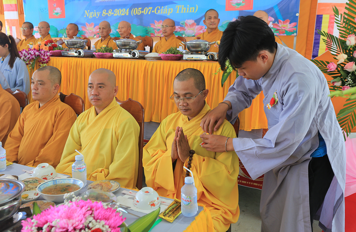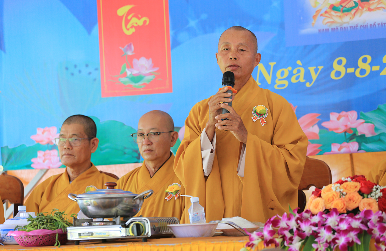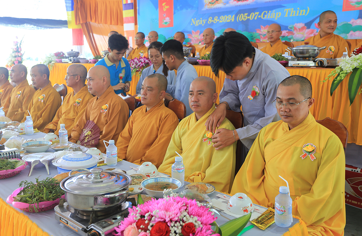 Đãi lao Chư Tôn đức chứng minh, HT. Thích Nhật Liên – Nguyên Trưởng BTS GHPGVN huyện Cai Lậy ban lời đạo từ đến toàn thể đạo tràng chùa Thiền Tông. Hoà thượng tôn vinh tinh thần báo ân của chư Tăng và Phật tử chùa Thiền Tông trong mùa hiếu hạnh. Mùa Vu Lan báo hiếu là mùa của tình yêu thương, là dịp để mỗi người thắp sáng tinh thần tri ân đối với tứ trọng ân. Nhân dịp này, Hoà thượng khuyến khích các Phật tử cần siêng năng làm việc thiện, nuôi dưỡng đạo tâm và tình yêu thương để xứng đáng là những người con Phật chân chính. Hoà thượng cũng nhấn mạnh rằng, lòng hiếu thảo với cha mẹ, ông bà tổ tiên không chỉ nên thể hiện trong mùa Vu Lan, mà còn phải được thực hành trong đời sống thường ngày của mỗi Phật tử.