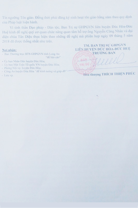 Vì tinh thần Đạo pháp – Dân tộc, Ban Trị sự GHPGVN liên huyện Đức Hòa-Đức Huệ kính đề nghị quý cơ quan chức năng quan tâm hỗ trợ ông Nguyễn Công Nhân và đại diện chùa Tân Diệu thực hiện theo những đề nghị mà phiên họp ngày 09 tháng 5 năm 2018 đã được thống nhất như trên.