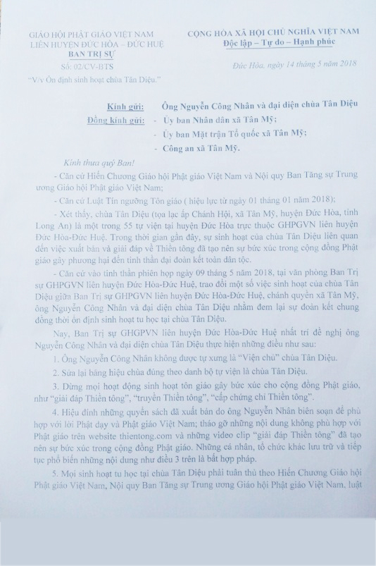 “V/v Ổn định sinh hoạt chùa Tân Diệu.”