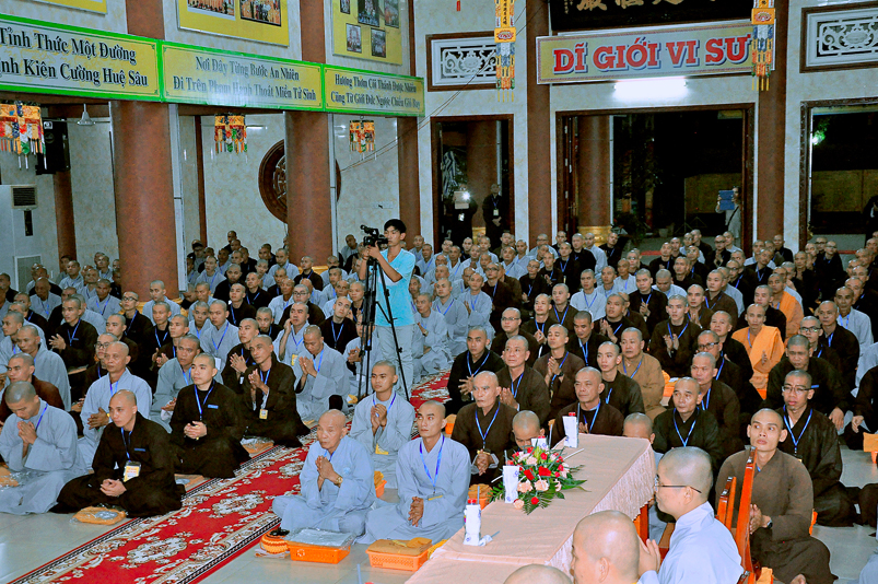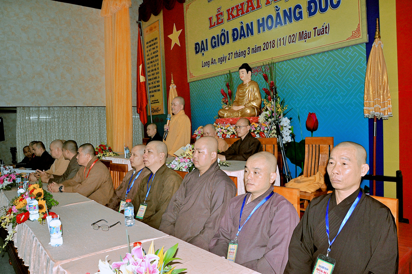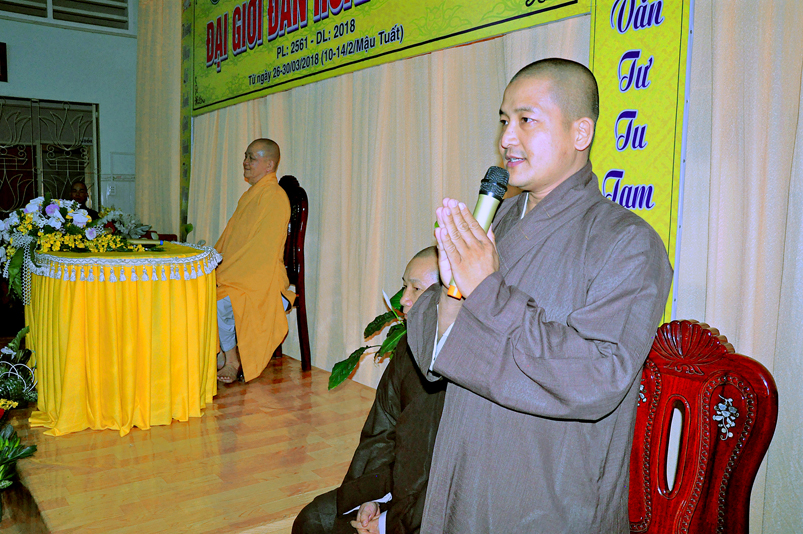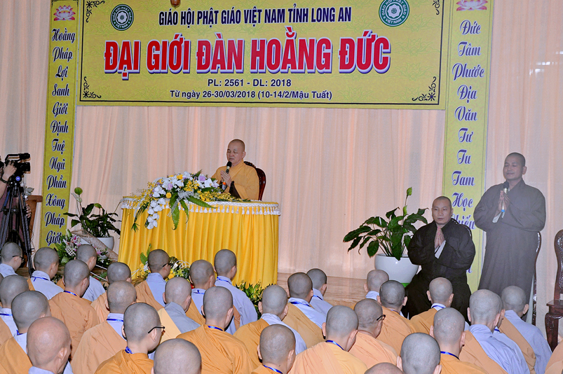 Cùng ngày, với tinh thần sách tấn quý giới tử tinh tấn tu học trong bốn ngày tại Giới Tràng, tối ngày 25/03/2018, Hoà thượng Thích Minh Thiện – Ủy viên Hội đồng Trị sự, Phó Trưởng ban Trị sự Hoằng pháp TW; Trưởng Ban Trị sự GHPGVN tỉnh Long An, Trưởng ban tổ chức Đại Giới Đàn, sau khi đi TP.HCM cầu thỉnh lời chỉ dạy của quý chư tôn giáo phẩm Tuyên Luật Sư, Hòa thượng đã có buổi khuyến đạo, sách tấn, động viên quý giới tử Tăng – Ni tại hai giới trường. Hòa thượng nhắc lại lời di chúc của Đức Từ Phụ “Nhữ đẳng tỳ-kheo! Ư ngã diệt hậu, đương tôn trọng trân kính Ba-la-đề-mộc-xoa. Như ám ngộ minh, bần nhân đắc bảo, đương tri thử tắc thị nhữ đẳng đại sư. Nhược ngã trụ thế, vô dị thử dã”. Ngài nhấn mạnh, quý giới tử có thể quên tất cả mọi thứ nhưng tuyệt đối lời dạy này Thế Tôn tuyệt đối không thể quên, dù đời này hay vô lượng kiếp sau. Và quý giới tử luôn ghi nhớ sơ tâm là hảo tâm, đứng lãng quên tâm lành ban đầu khi mới vào đạo. Đấy là tư lương cốt lõi của người xuất trần thượng sĩ. Sự quan tâm, chiếu cố của Hòa thượng Trưởng ban tổ chức đã giúp quý giới tử an tâm, hạnh phúc trước mọi điều còn bỡ ngỡ và dõng mãnh khát khao giới pháp.