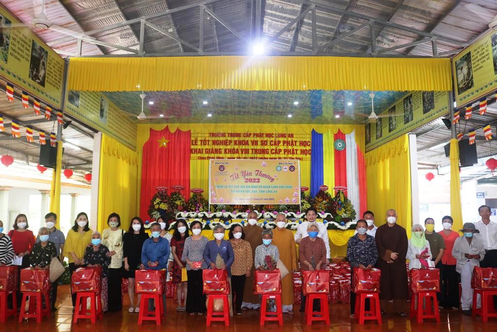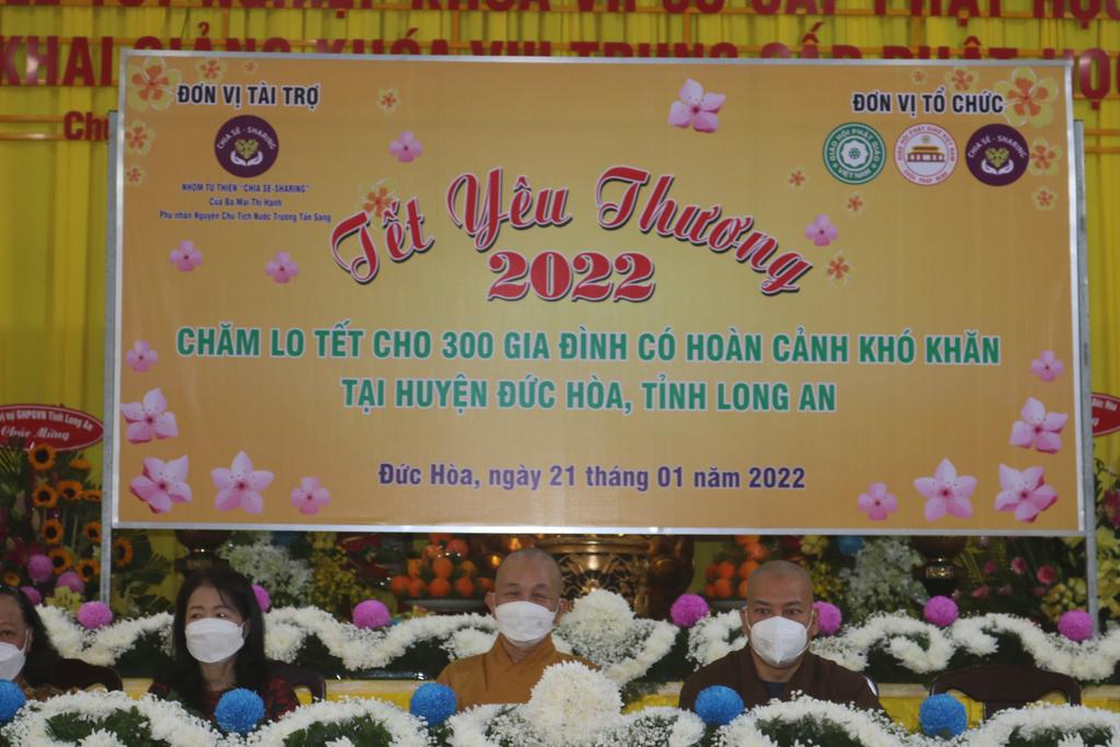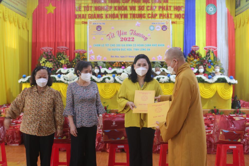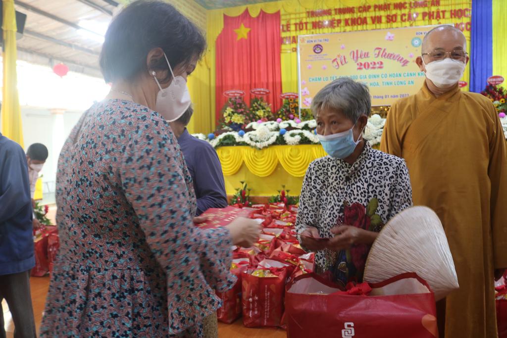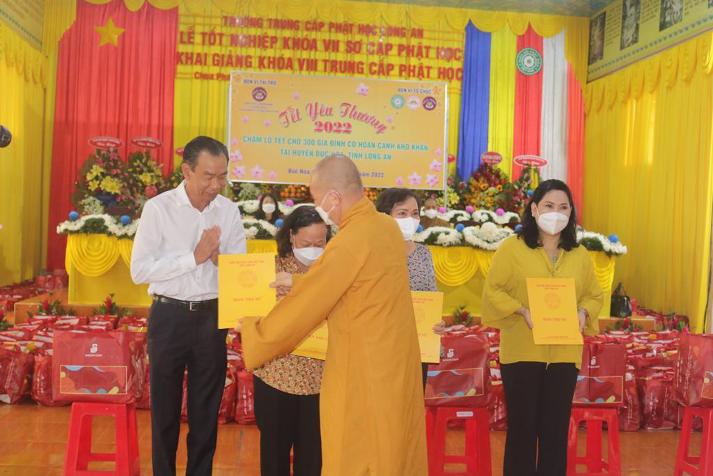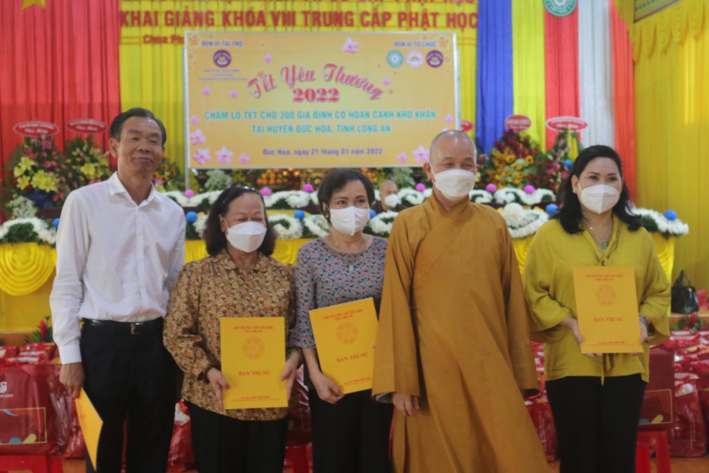 Tham dự lễ trao quà có Hòa thượng Thích Minh Thiện, Ủy viên Hội đồng Trị sự, Phó Trưởng ban Hoằng pháp TƯ, Trưởng ban Trị sự GHPGVN tỉnh Long An; Đại đức Thích Quảng Lâm, Ủy viên Hội đồng Trị sự, Chủ nhiệm Lớp Sơ cấp Phật học Long An; Đại đức Thích Lệ Duyên, Chánh Thư ký BTS GHPGVN tỉnh Long An, Trưởng ban Trị sự GHPGVN huyện Đức Hòa, đồng Chủ nhiệm Lớp SCPHLA và đại diện nhóm Từ thiện “Chia sẻ-Sharing” của Bà Mai Thị Hạnh, Phu nhân Nguyên Chủ tịch nước Trương Tấn Sang, gia đình cô Trương Minh Tuyết…