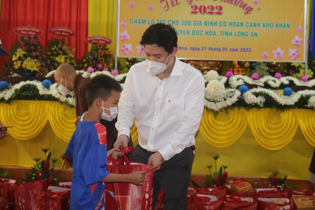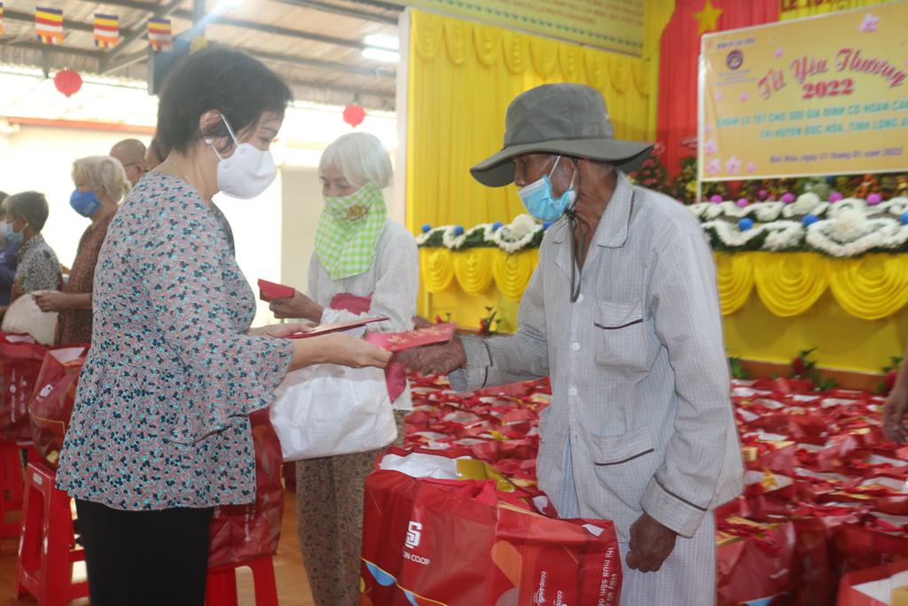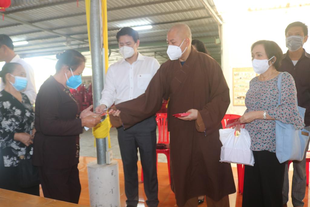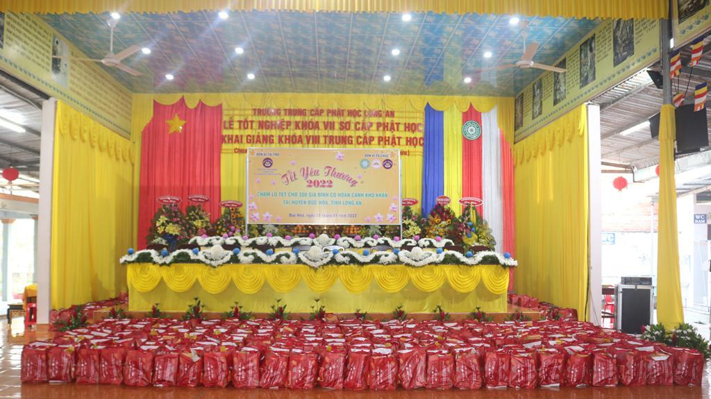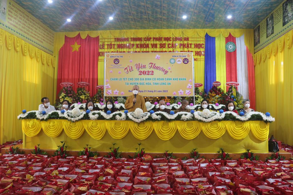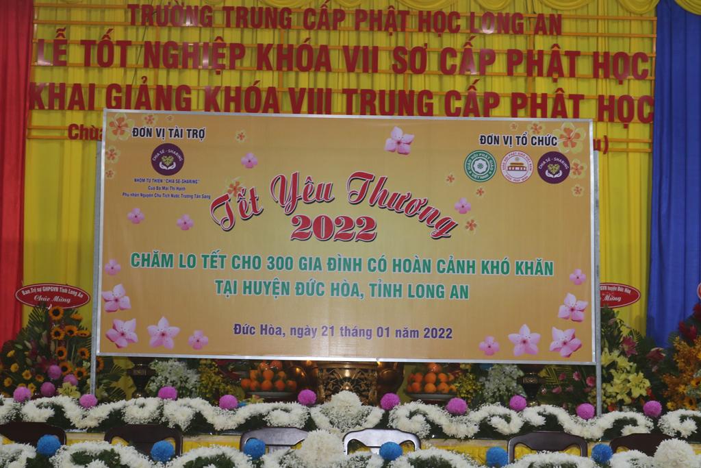 Tham dự lễ trao quà có Hòa thượng Thích Minh Thiện, Ủy viên Hội đồng Trị sự, Phó Trưởng ban Hoằng pháp TƯ, Trưởng ban Trị sự GHPGVN tỉnh Long An; Đại đức Thích Quảng Lâm, Ủy viên Hội đồng Trị sự, Chủ nhiệm Lớp Sơ cấp Phật học Long An; Đại đức Thích Lệ Duyên, Chánh Thư ký BTS GHPGVN tỉnh Long An, Trưởng ban Trị sự GHPGVN huyện Đức Hòa, đồng Chủ nhiệm Lớp SCPHLA và đại diện nhóm Từ thiện “Chia sẻ-Sharing” của Bà Mai Thị Hạnh, Phu nhân Nguyên Chủ tịch nước Trương Tấn Sang, gia đình cô Trương Minh Tuyết…