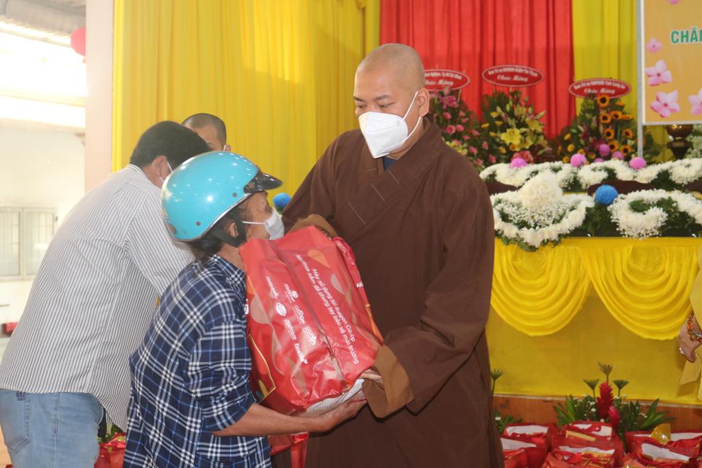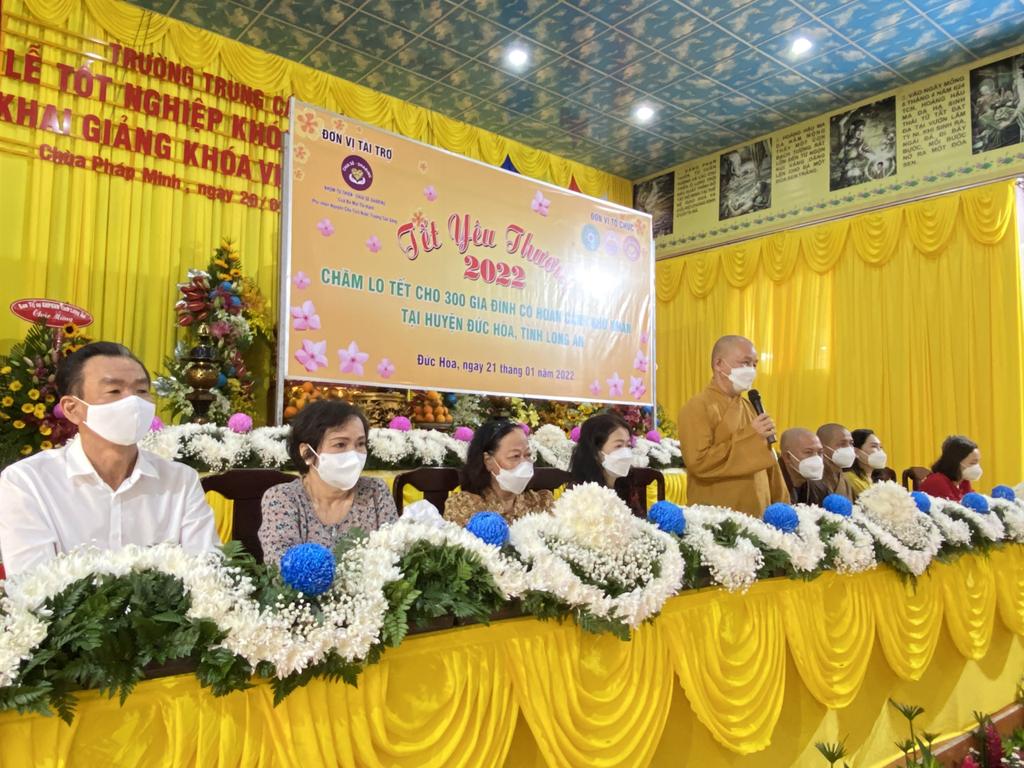 Phát biểu tại lễ trao quà, Hòa thượng Thích Minh Thiện gởi lời thăm hỏi, động viên, chia sẻ khó khăn với đồng bào nhận quà. Đồng thời, Hòa thượng gởi lời tri ân và chúc xuân Nhâm Dần đến gia đình Nguyên Chủ Tịch nước Trương Tấn Sang, nhóm từ thiện “Chia sẻ-Sharing”, gia đình cô Trương Minh Tuyết và nhóm bạn bè thân hữu của Cô Trương Minh Tuyết hằng năm đều tài trợ cho chùa Pháp Minh trao tặng 300 phần quà đến với đồng bào khó khăn vui xuân đón tết.
