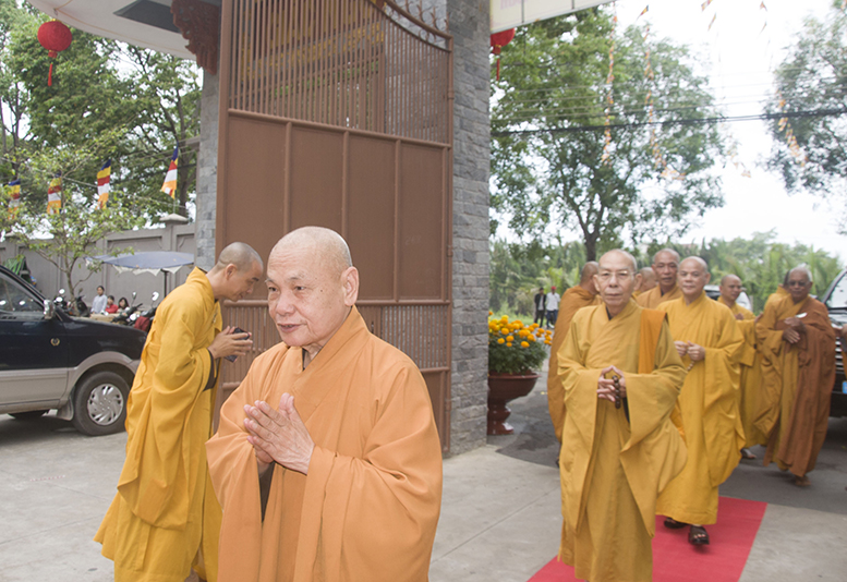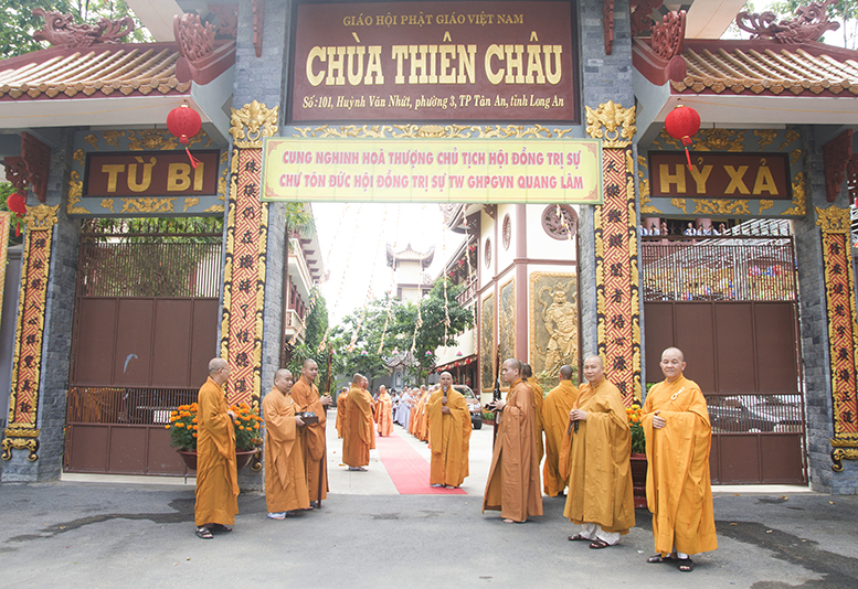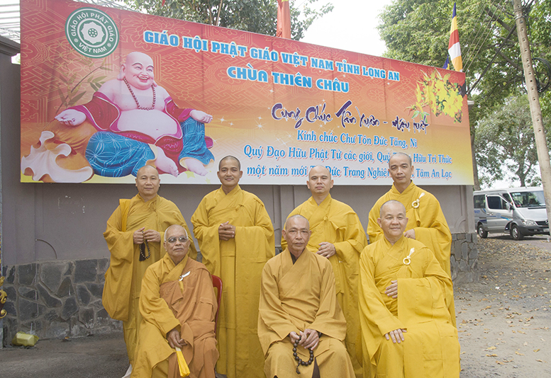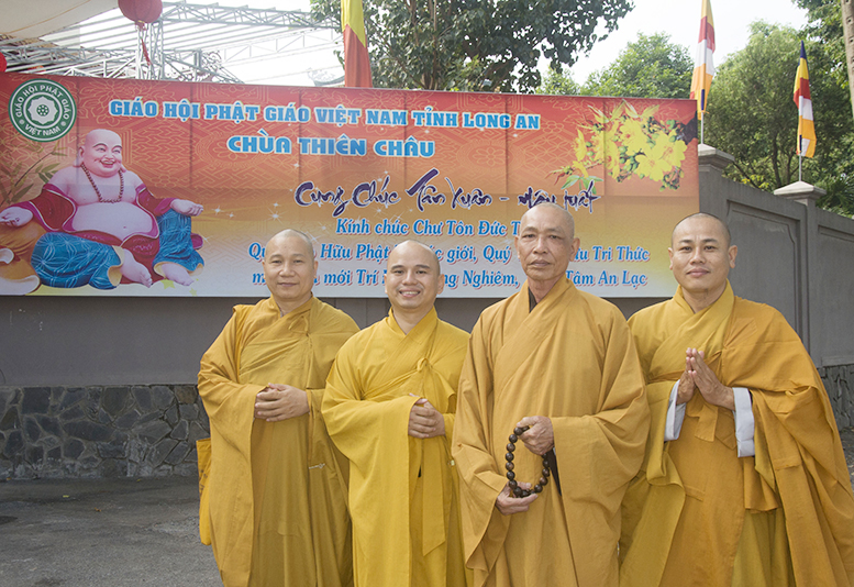 Sáng nay, ngày 18 tháng 2, năm 2018 (nhằm ngày mồng 3/tháng Giêng năm Mậu Tuất), tại chùa Thiên Châu, đường Huỳnh Văn Nhứt, Thường trực Ban Trị sự GHPGVN cùng chư Tăng Ni các tự viện, Phật tử tại các đạo tràng trực thuộc tỉnh Long An trang trọng cung đón Đức Trưởng lão Hòa thượng thượng Thiện hạ Nhơn-Chủ tịch HĐTS TW cùng chư Tôn đức Giáo phẩm: HT. Thích Thiện Đức- Uỷ viên thường trực Hội Đồng trị sự trung ương GHPGVN; HT. Thích Tấn Đạt- Uỷ viên TT HĐTSTƯ, Phó thường trực Ban Hoằng pháp trung ương; HT. Thích Thiện Huệ – Chứng minh Ban trị sự GHPGVN quang lâm viếng thăm mừng Xuân Phật giáo tỉnh Long An.