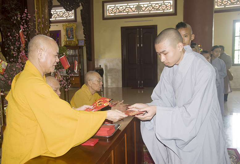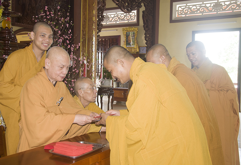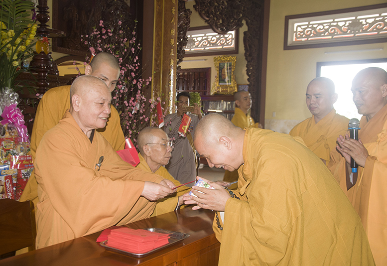 Khắc ghi lời dạy chân tình, sự quan tâm của bậc Trưởng lão, HT. Thích Minh Thiện cùng TT BTS, chư Tăng Ni cung kính đảnh lễ niệm ân HT Chủ tịch và kính nhận phần quà, lộc đầu xuân của Ngài trao tặng.