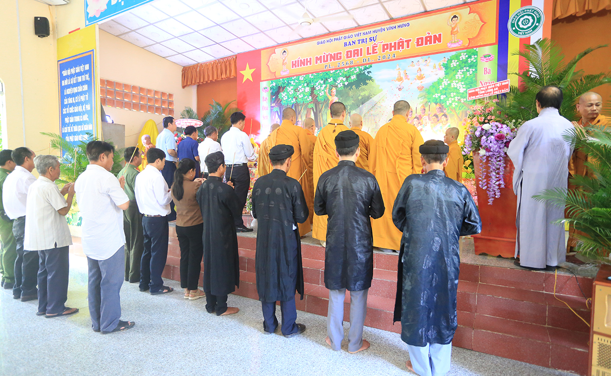 Đại diện chính quyền địa phương, ông Võ Hồng Lĩnh đã phát biểu đánh giá cao các hoạt động an sinh xã hội, từ thiện nhân đạo của Ban Trị sự Phật giáo huyện Vĩnh Hưng, đồng thời chúc mừng chư Tôn đức Tăng Ni cùng toàn thể Phật tử nhân mùa Đại lễ Phật đản.